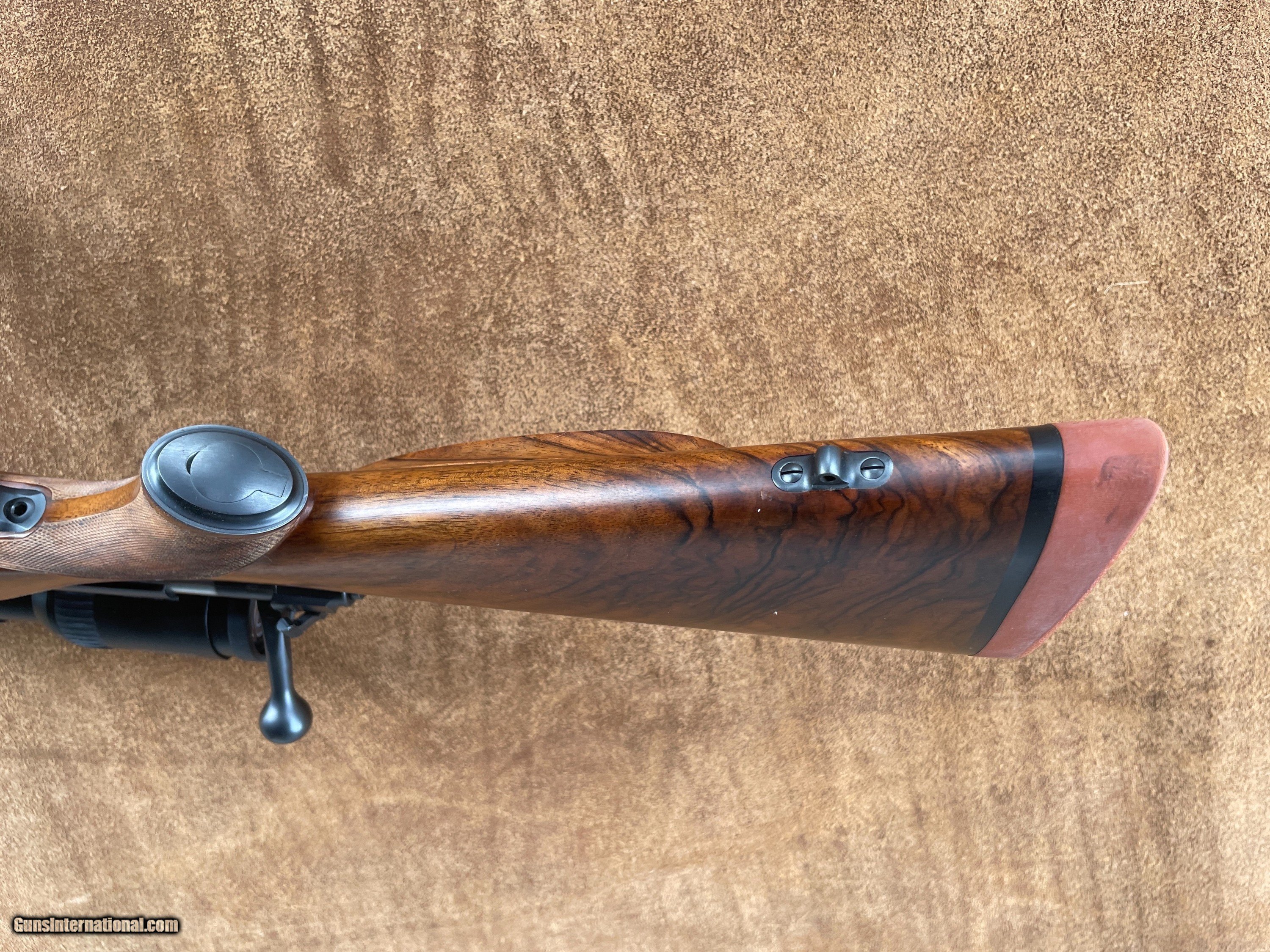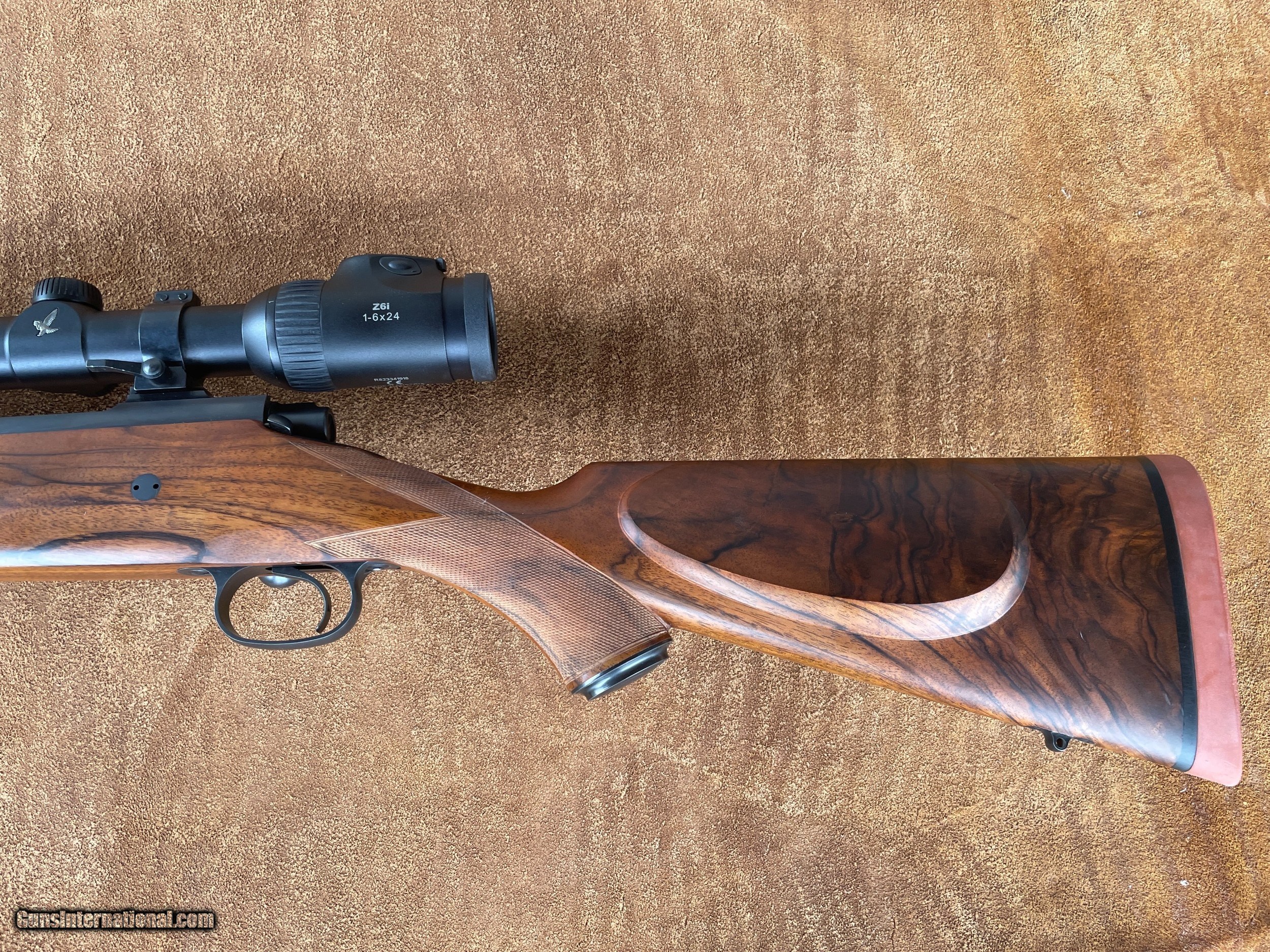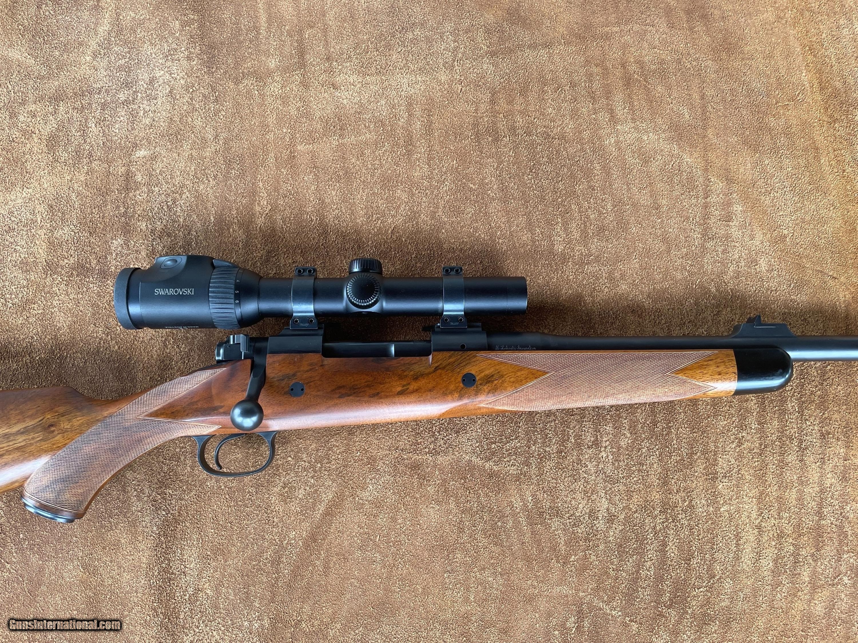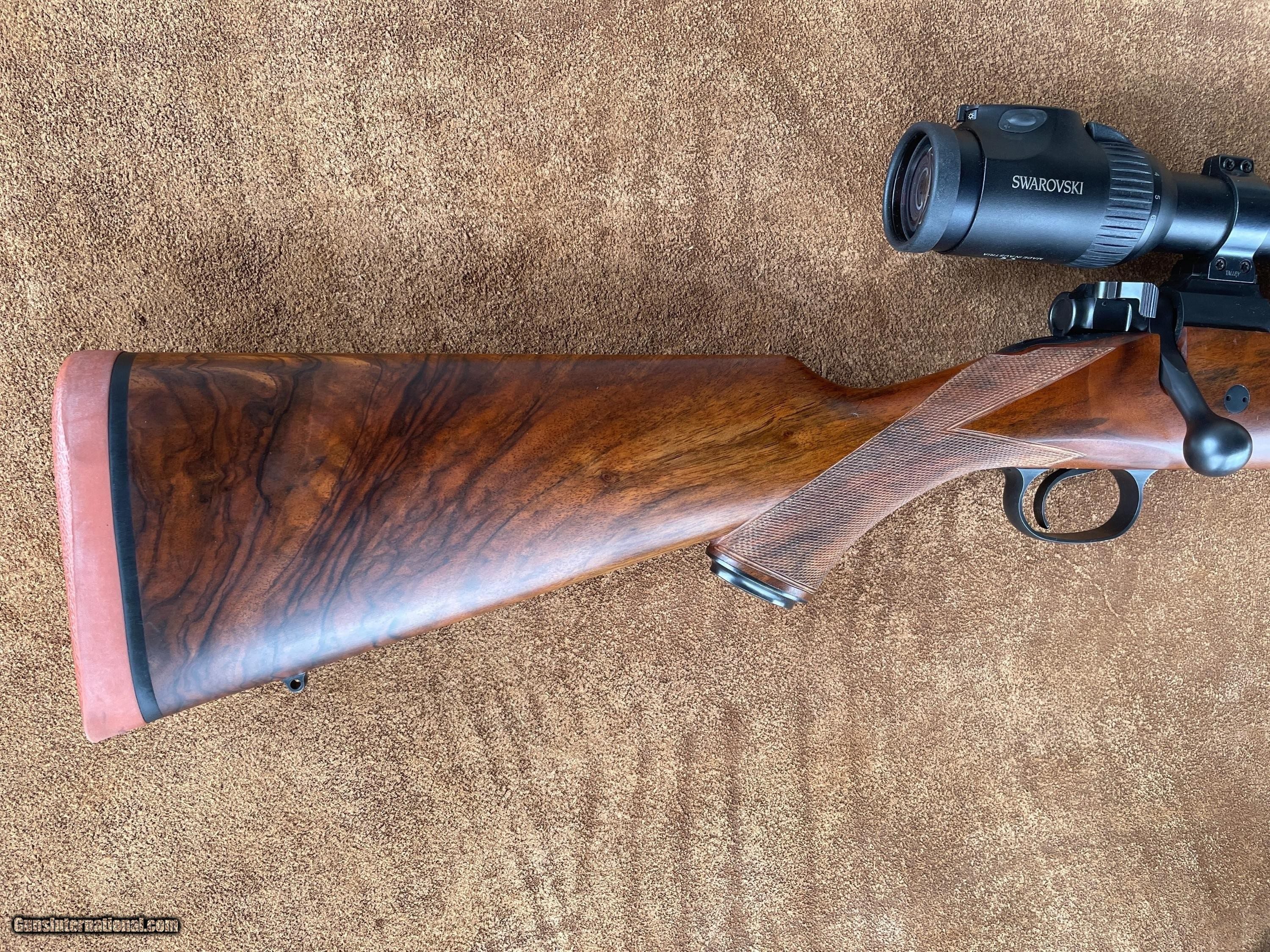Description: Unique Safari Rifle. There's not another like it on the planet! The barrel and the ramp front sight base, the rear sight base,front sling swivel base, and the recoil lug are one piece. The muzzle crown is recessed. The rear sight base has one standing leaf, and is well forward on the barrel to give a more crisp sight picture. The front sling swivel is well forward to minimize the amount of barrel extending upward. Much handier in thick brush. Action by Richardson &Roberts ,double square bridge with bridges machined to accept Talley QD rings. Magazine capacity 4 down, 1 up . Three position safety. Blind magazine- no chance of dumping ammo at an inopportune time! Stock of fancy walnut, nicely checkered pg and fe. Double cross bolted. PG trap contains extra front sight blade. Ebony FE tip. Recoil pad. Adjustable trigger set at a crisp 2lbs. Swarovski Z6i 1x6x24 scope in Talley QD rings. Weight is 9 lbs with scope. Built to my specs by Matthew Roberts of MNR customs. I designed this rifle after 9 safaris to incorporate all the features that I felt that would make it the PERFECT SAFARI RIFLE. Comes with approximately 250 rounds of ammo and 400 or so bullets, from 235 to 350 grains . Also a set of loading dies. SOLD Rifle Caliber: .375 H&H Magnum Condition: As new Metal Condition: As new Wood Condition: As new Bore Condition: Perfect Action: Double square bridge mauser Stock: Fancy walnut Weight: 9lbs with Swarovski scope Sights: Single leaf rear |