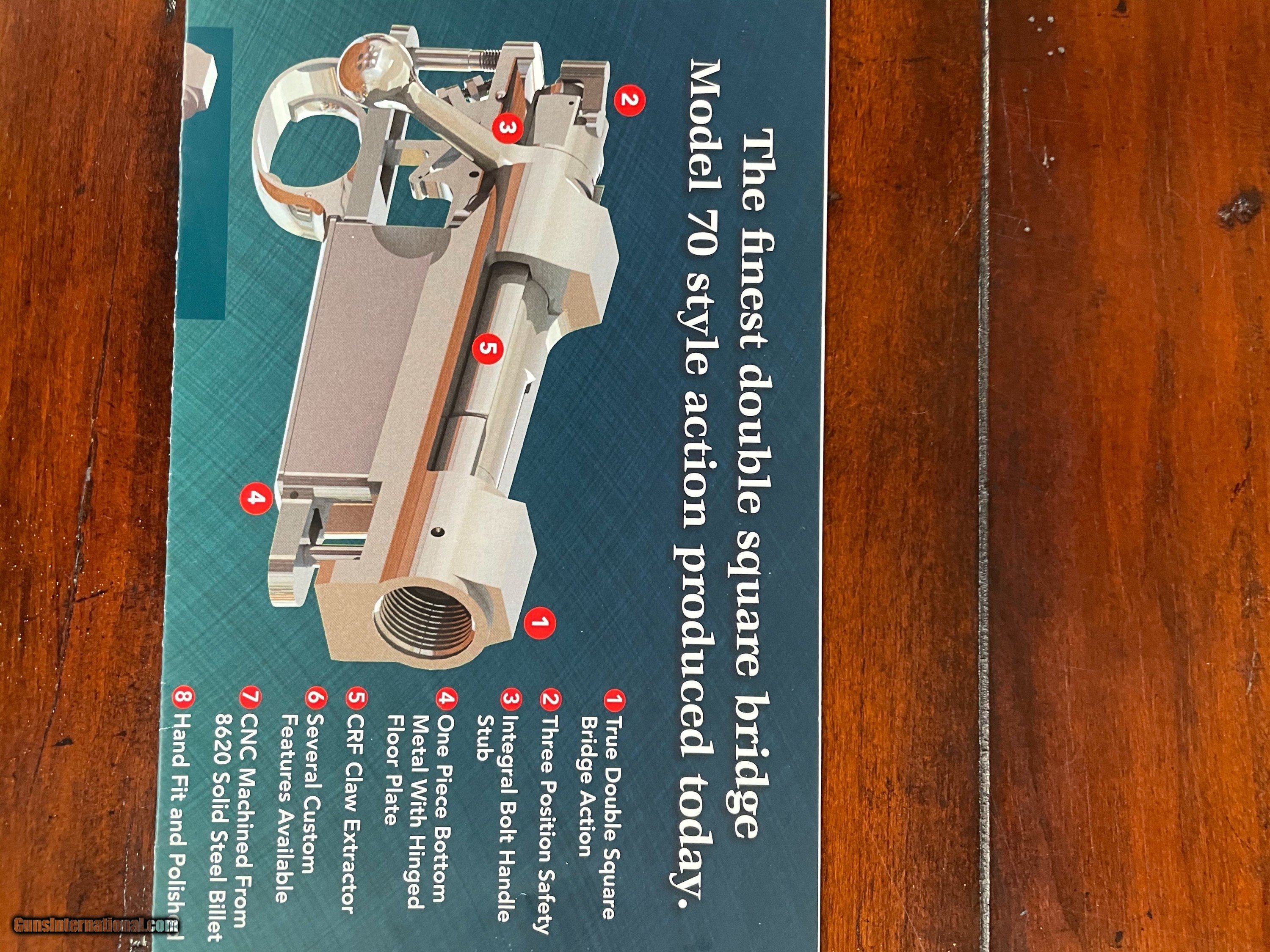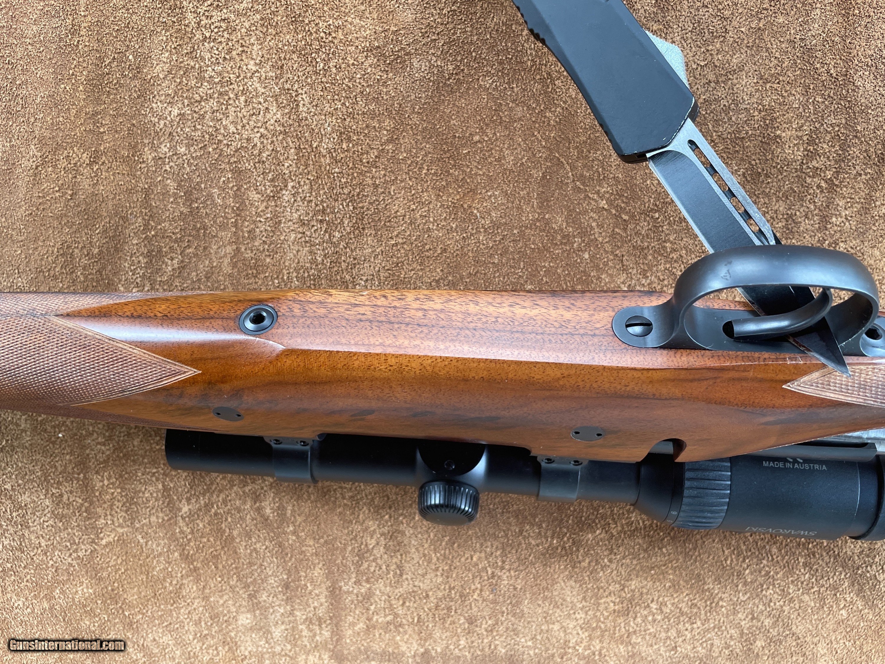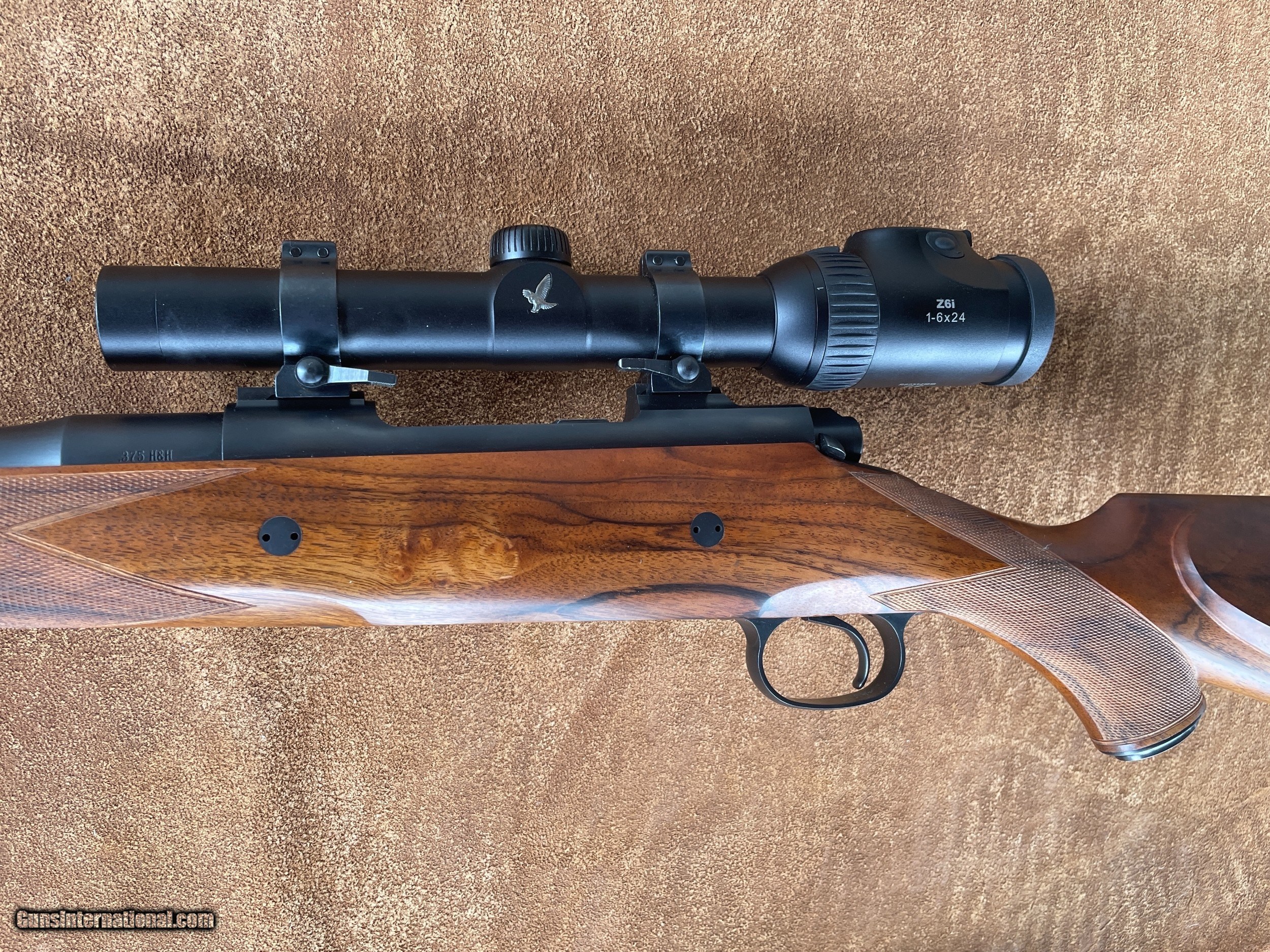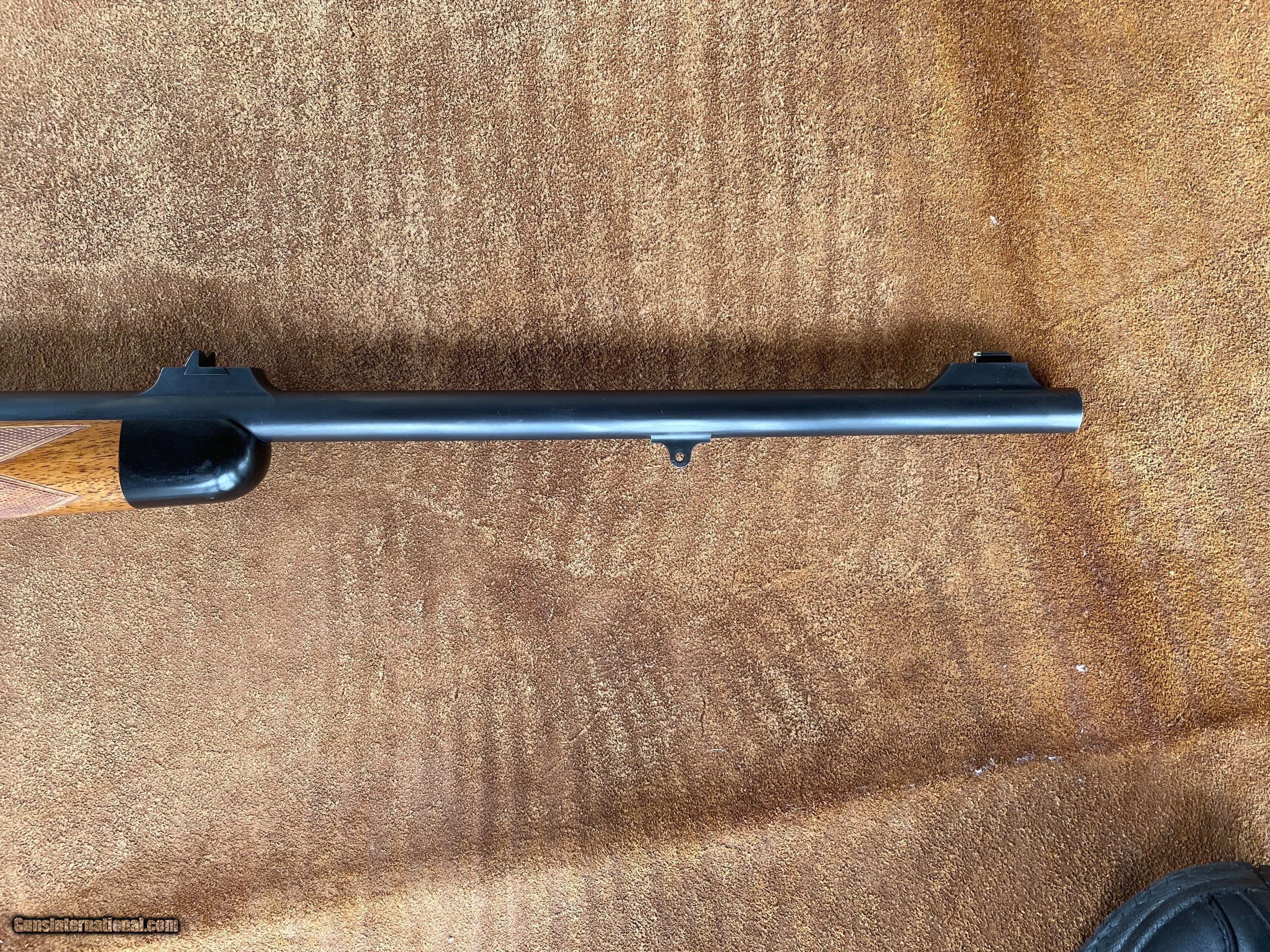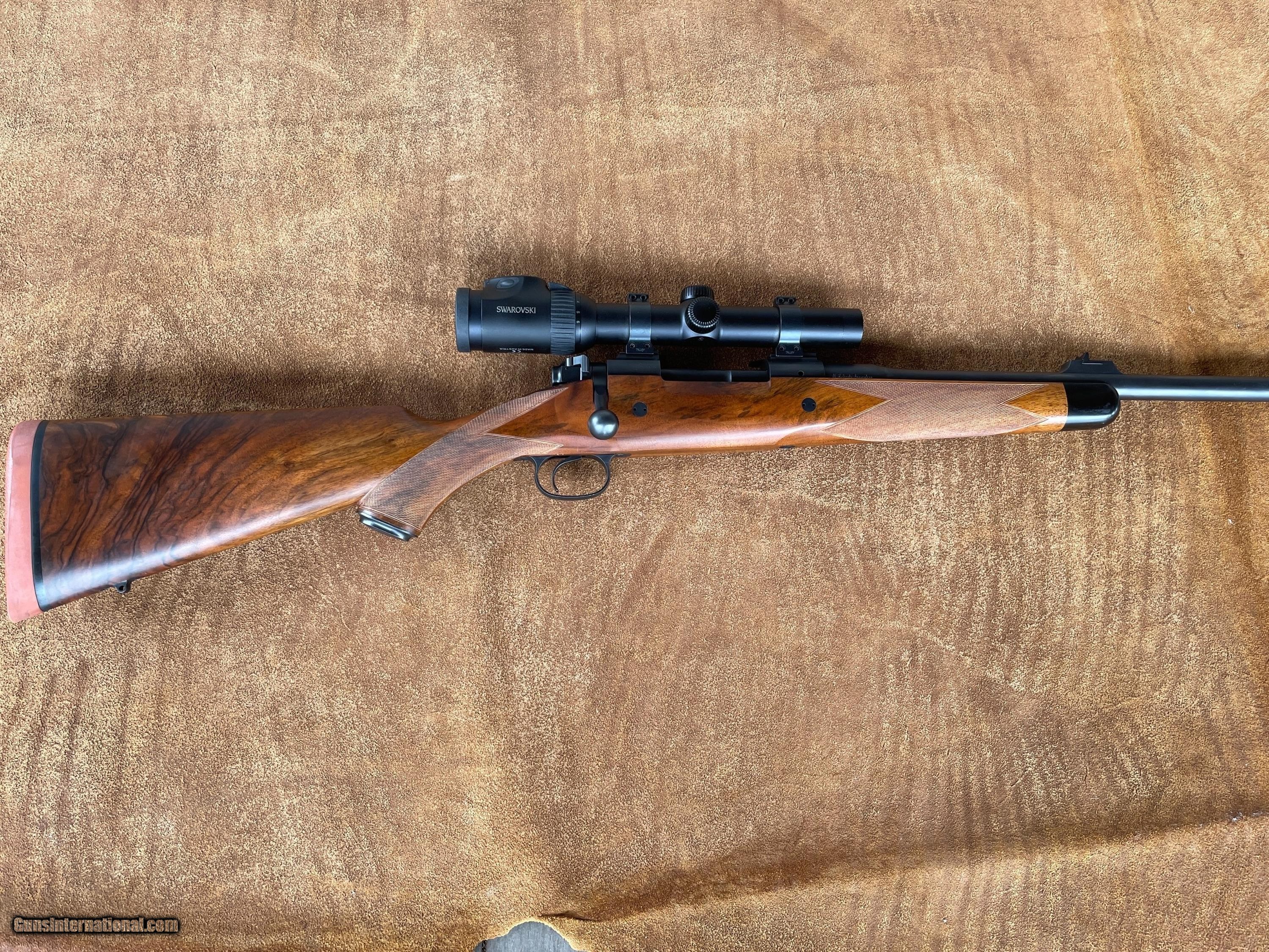 Description: Unique Safari Rifle. There's not another like it on the planet! The barrel and the ramp front sight base, the rear sight base,front sling swivel base, and the recoil lug are one piece. The muzzle crown is recessed. The rear sight base has one standing leaf, and is well forward on the barrel to give a more crisp sight picture. The front sling swivel is well forward to minimize the amount of barrel extending upward. Much handier in thick brush. Action by Richardson &Roberts ,double square bridge with bridges machined to accept Talley QD rings. Magazine capacity 4 down, 1 up . Three position safety. Blind magazine- no chance of dumping ammo at an inopportune time! Stock of fancy walnut, nicely checkered pg and fe. Double cross bolted. PG trap contains extra front sight blade. Ebony FE tip. Recoil pad. Adjustable trigger set at a crisp 2lbs. Swarovski Z6i 1x6x24 scope in Talley QD rings. Weight is 9 lbs with scope. Built to my specs by Matthew Roberts of MNR customs. I designed this rifle after 9 safaris to incorporate all the features that I felt that would make it the PERFECT SAFARI RIFLE. Comes with approximately 250 rounds of ammo and 400 or so bullets, from 235 to 350 grains . Also a set of loading dies. SOLD Rifle Caliber: .375 H&H Magnum Condition: As new Metal Condition: As new Wood Condition: As new Bore Condition: Perfect Action: Double square bridge mauser Stock: Fancy walnut Weight: 9lbs with Swarovski scope Sights: Single leaf rear |
