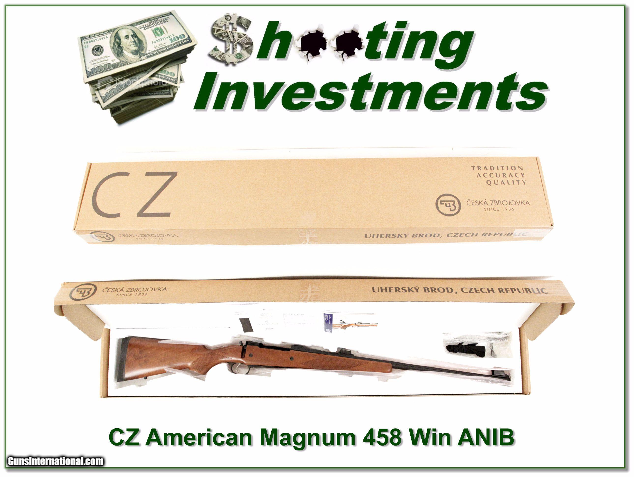 Description: Big game hunters, this is a CZ American 550 Safari in 458 Winchester Magnum. It has fired 4 rounds and is in perfect condition. It comes complete in box with all papers. I am selling this one on consignment and as such, lay-a-way can’t be used. It does of course have the standard 3-day inspection. Shipping and insurance is $39. Please email me with any questions or larger pictures. (Consign your quality firearms with Shooting Investments for only 10%! Let me know if you have any you would like to sell!) 17-1058 Payment: Payment is by Money Order, Cashiers Check or Personal Check. I can now also accept MasterCard and Visa with a 3% convenience fee. PayPal can be used for some items but never firearms. Please let us know if you would like to pay via PayPal. Shipping: The shipping charge will be listed in each description. It is $39 for most long guns and $29 for most handguns. Some heavy guns or those insured for over $2000 will be higher. Shipments to Alaska and Hawaii are higher because air shipment is required. Most firearms are shipped on Tuesday and Thursday and usually in 5 days of receipt of payment. We package all shipments carefully and insure them. For long guns you can purchase a new Plano case for $19. They now cost us $22 when buying 100 at a time. Optics are shipped Priority Mail and most other non-firearm shipments are shipped First Class. Returns: Our return policy is simple. If for any reason you are not pleased with your purchase, you may return your item for a full refund of purchase price. Ammunition cannot be returned. It is important to us that you are happy. Guns cannot be fired or dissembled before returning them and they must be returned in the same condition as received. Notification of a return must occur with-in 3 days of receipt at your dealer. Shipping, convenience and dealer fees are not refundable and are the responsibility of the buyer. Lay-a-way: If needed, we offer a 60 day lay-a-way option on most firearms. It is 1/3 now, 1/3 in 30 days and 1/3 in 60 days. Lay-a-way firearm sales are final and if not completed the first payment cannot be returned. Consigning your firearms with Shooting Investments: We will help you get top dollar for your firearms. While most local guns shops charge 20% or more, our fee is only 10% with a minimum of $75. At your local gun shop it might take months to sell. Selling on-line provides instant access to thousands of interested buyers. You won’t find any other on-line dealer willing to sell your firearms for only 10% or listing every gun on 3 separate s. Selling through an House typically costs the seller 15% and the buyer an addition 15% (so 30%) and you have to wait several months to sell and longer to receive funds. If properly priced, we will sell your firearms in a few weeks. Send us an email or give us a call and we’ll explain how easy it is for you to get top dollar. Trading: Trading for use is really just buying your gun to re-sell. If you have a gun you want to trade, please email a picture and we will let you know what we can give or it. You will always get more if we sell it for you on consignment. Help for California Buyers: We are happy to ship to California. It is the buyer’s responsibility to make sure any item you buy is legal in your state. We are also happy to help with your purchase of a firearm from someone other than us. If you see a gun you would like to buy but the seller can’t or won’t ship to California they can ship to use and we’ll then ship it to your California dealer. The cost for this service is only $30 + shipping. Let us know if we can help! SOLD |