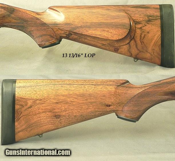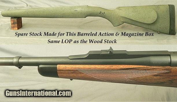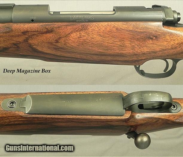 Description: #3198, Dakota African Grade in 375 H&H, Made 2007, 24" Barrel with their 1/4 Rib with a Standing fixed sight, Band front ramp with a Truglo fiber front sight, Lock on sight hood with windows, Barrel band swivel, Belly magazine box with a hinged straddle floorplate with a center bow release, Talley Quick Detachable lever release mounts with 30mm rings, 3 position M-70 wing safety, All metal is satin blue, 13 13/16" LOP over a 1" pad, 8 lbs. 6 oz. as is, Ebony forend tip, Point pattern checkering, Shadowline cheekpiece, Double screw sling eyes front & back on the stock plus the barrel band sling eye, Steel grip cap, It has a spare synthetic stock, The factory satin blue remains at 92%, The original stock is 90%, The checkering at 100%. The bore is as new. The synthetic stock was made for this very gun and fits very well with the same 13 13/16" lop. It comes with the super duty tough travel case that will protect any bolt rifle anywhere you travel in the world. The Schmidt & Bender 1.5-6 x42 Zenith with a Flash Dot can be bought separately at $1550; the rifle, spare stock & case are $4975. Buy both for a total of $6525. This piece comes with a track record of accuracy, a lot of targets with it and it flat will shoot, it is African proven and it works. SOLD |