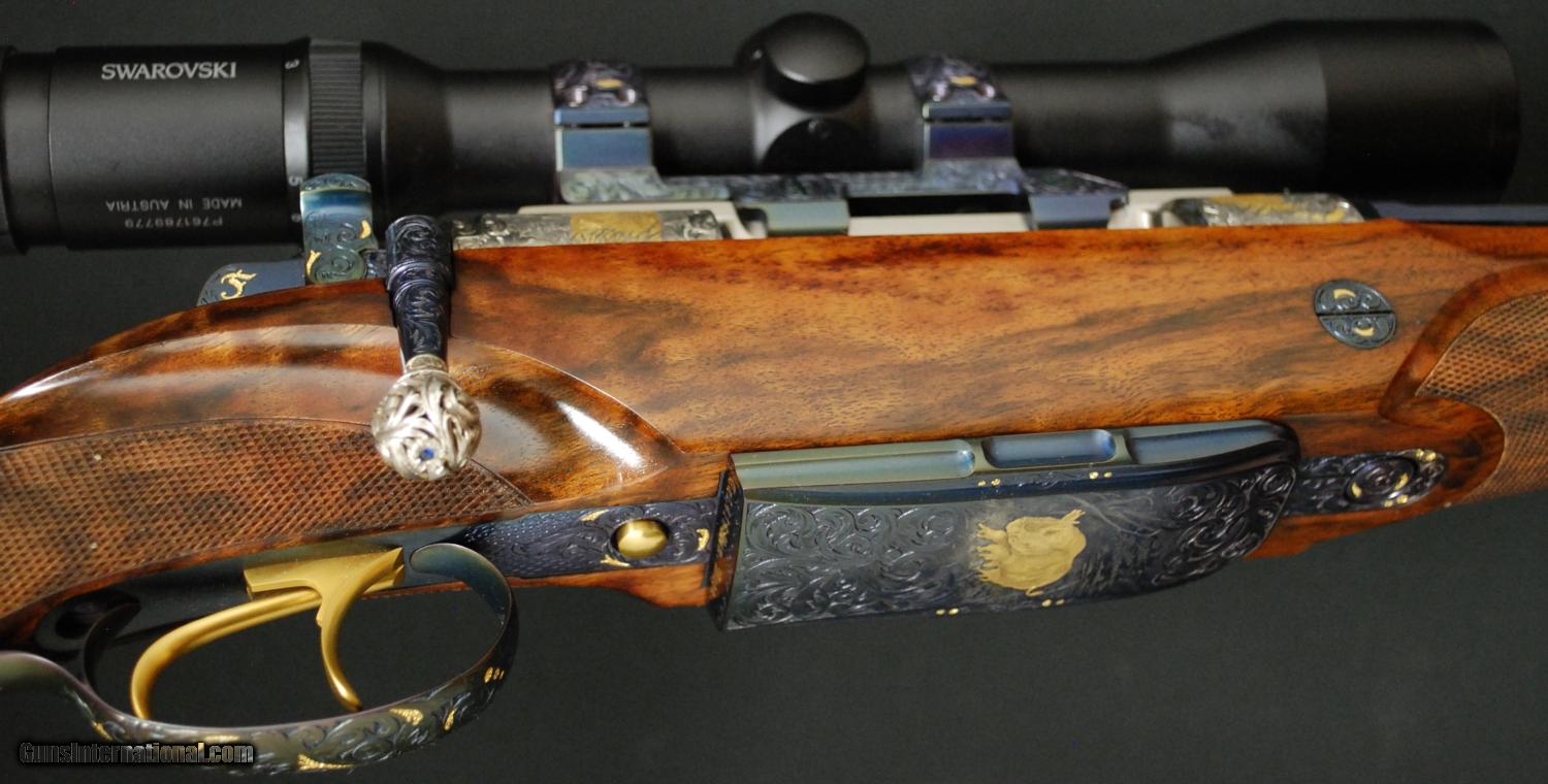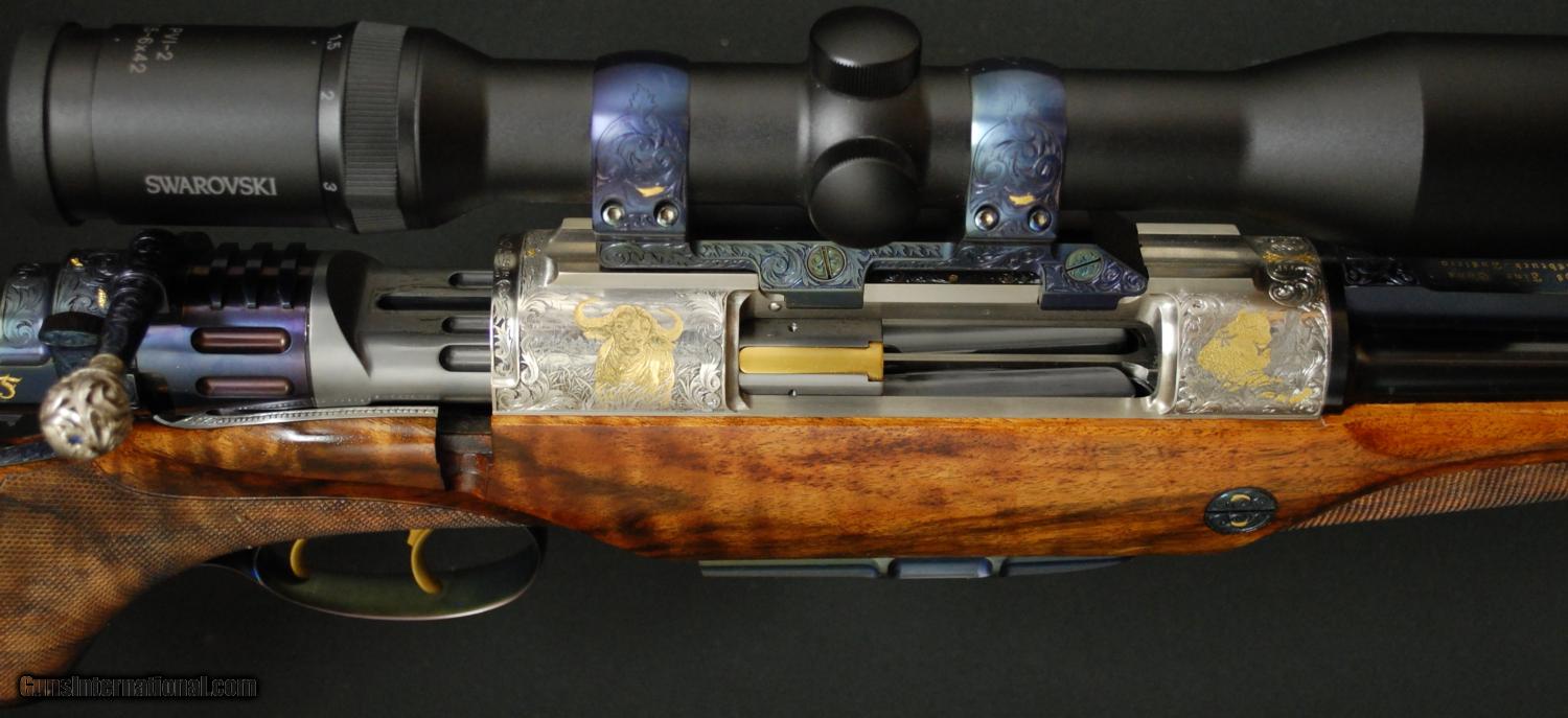 Description: FUCHS- Bolt Action Double Rifle, .416 Rem. Mag, 23” Barrels, pistol grip, detachable magazine, double trigger, the finest piece of Turkish walnut available, quarter rib, rail mounted Swarovski 1.5-6x42, cheek piece., recoil pad, pierced bolt handle, ingenious design, one of the most spectacular ones ever built, magnificent gold bulino game scenes of cape buffalo, leopards, rhinoceros, lions, elephant, all surrounded by ornamental scroll with gold accents, the gun remains on as new condition, possibly unfired, one of the most ornate Fuchs guns ever made, outstanding, very extravagant, available for immediate delivery.