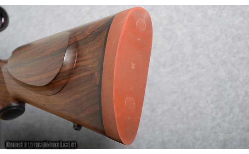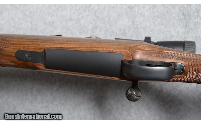 Description: This .416 Rigby Safari Magnum has a Granite Mountain Arms custom M98 action. It is precision machined out of 8620 steel and case-hardened. The bolt has dual, opposed locking lugs and a third safety lug and custom bolt face recess. The bolt handle is altered to allow for easy scope clearance and has teardrop checkering and gold inlay in the bolt handle. The Monte Carlo stock was hand crafted by RMS Custom of Prescott, AZ and features fine checkering on the grip and fore end, as well as an ebony end cap and plain grip cap. The 24 3/4" barrel has a barrel band mounted swivel stud and machined integral 1/4 rib and express V rear sight and hooded front gold bead. .416 Rigby SOLD Metal Condition: Excellent Wood Condition: Excellent Bore Condition: Excellent Barrels: 24 3/4 Triggers: Adjustable Stock Dimensions: 13 3/4" LOP Fore End: Checkered with ebony fore end cap Butt Pad: Thick rubber recoil pad Weight: 11 lb 12 oz Sights: "Scope: Steiner Hunting Z 1.5-5x20 with quick detach mounts. Sights: Integral 1/4 rib with express sights, v-notch rear sight and hooded front sight with gold bead Item Location: Boise, ID |