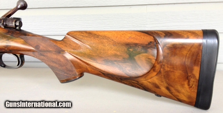 Description: #153678. PENDING SALE !!! Pachmayr custom Winchester Mod 70, chambered in 458 Lott. The rifle was built for Bruce Baker then president of Pachmayr gun work. He used it in Africa on elephants and buffalo. He is pictured with the rifle in Craig Boddington’s Safari rifles book. 22” barrel , with chamber and bore in excellent condition. Island rear sight with one standing one folding, bended front ramp with silver bead and small flip up moon sight. Bluing is in 98% condition , as is the very nice engraving. A tasteful mix of scroll , crisp gold inlays and a bull elephant gold inlaid on a silver background on the florplate. Nice stock and checkering in 95% condition , 13 7/8” LOP over a 1” pad . The rifle points well . Engraved and gold inlaid grip cap, ebony forend tip, jeweled bolt and Pachmayr signature Sling swivels. The magazine will hold four cartridges down and feed smoothly. The trigger is set at 4 pounds. If you find a nicer African bolt rifle, in a better caliber, for less money; by all means , buy it. SOLD |