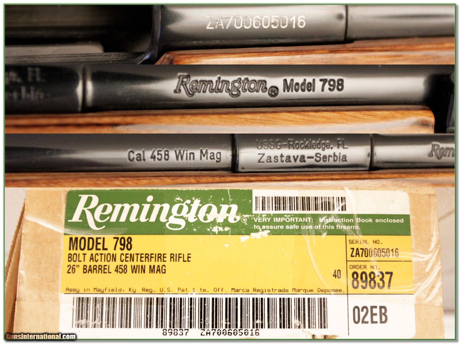 Description: This is a Remington 798 in 458 Winchester Magnum. It is as new in the box with no marks or signs of being fired. It has a 26in barrel and open sites. It will make a fine Big Game rifle. I am selling this one on consignment and as such lay-a-way can’t be used. It does of course have the standard 3 day inspection. Shipping and insurance is $30 or $18 more if you want it shipped in a new Plano hard case. Please email me with any questions or larger pictures. (I now consign quality firearms only 10%! Let me know if you have any you would like to sell!) [15-1240] Payment: Payment is by Money Order, Cashiers Check or Personal Check. I can now also accept MasterCard and Visa with a 3% convenience fee. PayPal can be used for some items but never firearms. Please let us know if you would like to pay via PayPal. Shipping: The shipping charge will be listed in each description. It is $30 for most guns. Some heavy guns or those insured for over $2000 may be higher. Shipments to Alaska and Hawaii are higher because air shipment is required. Most firearms are shipped within 5 days of receipt of payment. We prefer shipping at the beginning of the week to avoid firearms in transit over weekends. We package all shipments carefully and insure them for the full purchase price, rounded up to the next $100. In the unlikely event that damage occurs, it is important that you save all packaging material for the claims process. Optics are shipped Priority Mail and most other non-firearm shipments are shipped First Class. Returns: Our return policy is simple. If for any reason you are not pleased with your purchase, you may return your item for a refund. The only exception is ammunition, it cannot be returned. It is important to us that you are happy. Guns cannot be fired or dissembled before returning them and must be returned in the same condition as received. Notification of a return must occur with-in 3 days of receipt at your dealer. Shipping, convenience and dealer fees are not refundable and are the responsibility of the buyer. Lay-a-way: If needed, we offer a 60 day lay-a-way option on most firearms. It is 1/3 now, 1/3 in 30 days and 1/3 in 60 days. Lay-a-way firearm sales are final. Consigning your firearms with Shooting Investments: We will help you get top dollar for your firearms. While most local guns shops charge 20% or more, our fee is only 10% with a minimum of $50. At your local gun shop it might take months to sell. Selling on-line provides instant access to thousands of interested buyers. You won’t find any other on-line dealer willing to sell your firearms for only 10% or listing every gun on 4 separate s. Selling through an House typically costs the seller 15% and the buyer an addition 15% (so 30%) and you have to wait several months to sell and longer to receive funds. If properly priced, we will sell your firearms in a week or two. Send us an email or give us a call and we’ll explain how easy it is for you to get top dollar. Trading: We collect guns and usually just trade for guns we want to add to our collections. We often sell guns for others wanting to purchase one of ours. We find this the most fair to both of us. Our Commission is only 10% and we hold the gun you want until yours sells. Please contact us if you want to sell one of yours to buy one of ours. Help for California Buyers: We are happy to ship to California. It is the buyer’s responsibility to make sure any item you buy is legal in your state. We are also happy to help with your purchase of a firearm from someone other than us. If you see a gun you would like to buy but the seller can’t or won’t ship to California we can help. You buy the gun and have it shipped to us. We’ll then ship it to your California dealer. The cost for this service is only $30 + shipping. Let me know if we can help! SOLD |