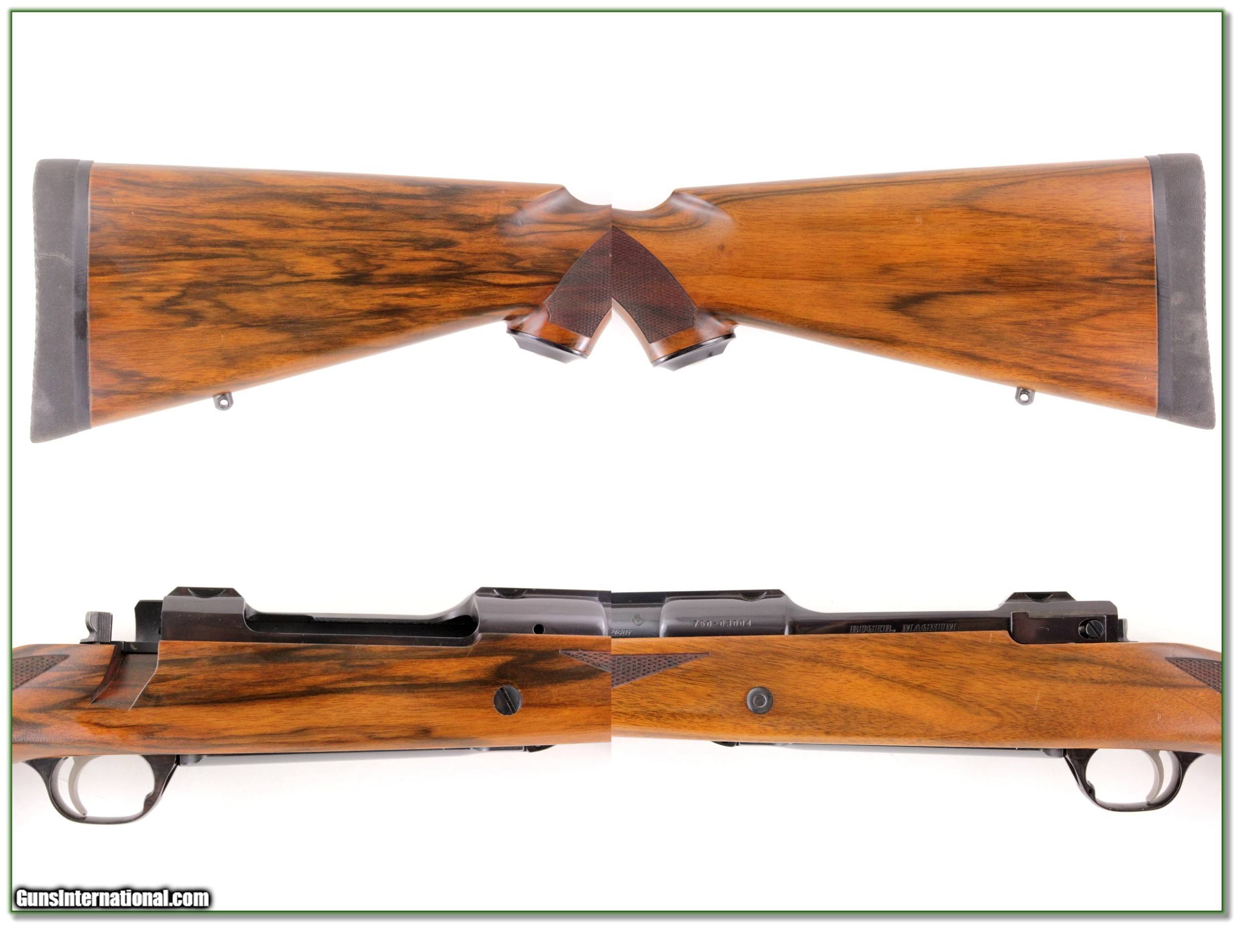 Description: African Dangerous game hunters, this is a beautiful Ruger RSM in 416 Rigby. It has beautiful cartesian walnut with dark streaks. It has a 24in barrel with express sights. It has a Parchmyer recoil pad and the original Ruger pad is included. The stock wasn’t altered. I am sure only a few rounds fired and I find just a few light handing marks. It will make a classic Safari rifle for your next hunt or to add to your collection. I am selling this one on consignment and as such lay-a-way can’t be used. It does of course have the standard 3-day inspection. Shipping with insurance is $39. Please email me with any questions or larger pictures. (Consign your quality firearms with Shooting Investments for only 12%! Let me know if you have any you would like to sell!) 19-1363 Payment: Payment is by Money Order, Cashiers Check or Personal Check. I can now also accept Credit Cards (MasterCard, Visa, Discover & American Express) with a 3% convenience fee. PayPal can be used for some items but never for firearms. Shipping: The shipping charge will be listed in each description. It is $39 for most firearms. Some heavy guns or those insured for over $2000 will be higher. Shipments to Alaska and Hawaii are higher because air shipment is required. Most firearms are shipped on Tuesday and Thursday and usually in 5 days of receipt of payment. We package all shipments carefully and insure them. Optics are shipped Priority Mail and most other non-firearm shipments are shipped First Class. Returns: Our return policy is simple. If for any reason you are not pleased with your purchase, you may return your item for a full refund of purchase price. Ammunition cannot be returned. It is important to us that you are happy. Guns cannot be fired or dissembled before returning them and they must be returned in the same condition as received. Notification of a return must occur with-in 3 days of receipt at your dealer. Shipping, convenience and dealer fees are not refundable and are the responsibility of the buyer. Lay-a-way: If needed, we offer a 60 day lay-a-way option on most firearms. It is 1/3 now, 1/3 in 30 days and 1/3 in 60 days. Lay-a-way firearm sales are final and if not completed the first payment cannot be returned. Consigning your firearms with Shooting Investments: We will help you get top dollar for your firearms. While most local guns shops charge 20% or more, our fee is only 12% with a minimum of $75. At your local gun shop it might take months to sell. Selling on-line provides instant access to thousands of interested buyers. You won’t find any other on-line dealer willing to sell your firearms for only 12% or listing every gun on 3 separate s. Selling through an House typically costs the seller 15% and the buyer an addition 15% (so 30%) and you have to wait several months to sell and longer to receive funds. If properly priced, we will sell your firearms in a few weeks. Send us an email or give us a call and we’ll explain how easy it is for you to get top dollar. Trading: Trading for use is really just buying your gun to re-sell. If you have a gun you want to trade, please email a picture and we will let you know what we can give or it. You will always get more if we sell it for you on consignment. Help for California Buyers: We are happy to ship to California. It is the buyer’s responsibility to make sure any item you buy is legal in your state. We are also happy to help with your purchase of a firearm from someone other than us. If you see a gun you would like to buy but the seller can’t or won’t ship to California they can ship to use and we’ll then ship it to your California dealer. The cost for this service is only $30 + shipping. Let us know if we can help! SOLD |