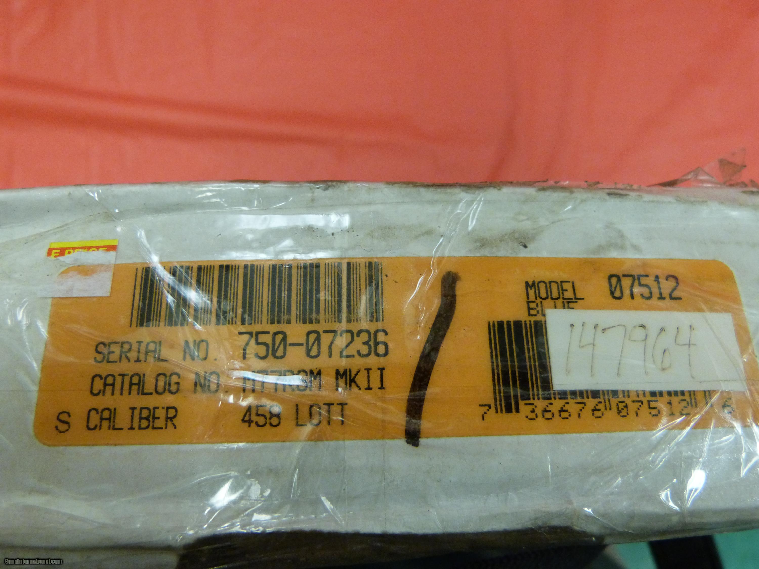 Description: Ruger M77RSM in the big 458 Lott. This is brand new in box. No longer made by Ruger. Ruger number 07512. Only $1495, $30 for shipping and no 3% card fees. Please ask for Steve or Bob when calling. SOLD Manufacturer: Ruger Model: M77RSM Caliber Info: 458 Lott Condition: NIB |
