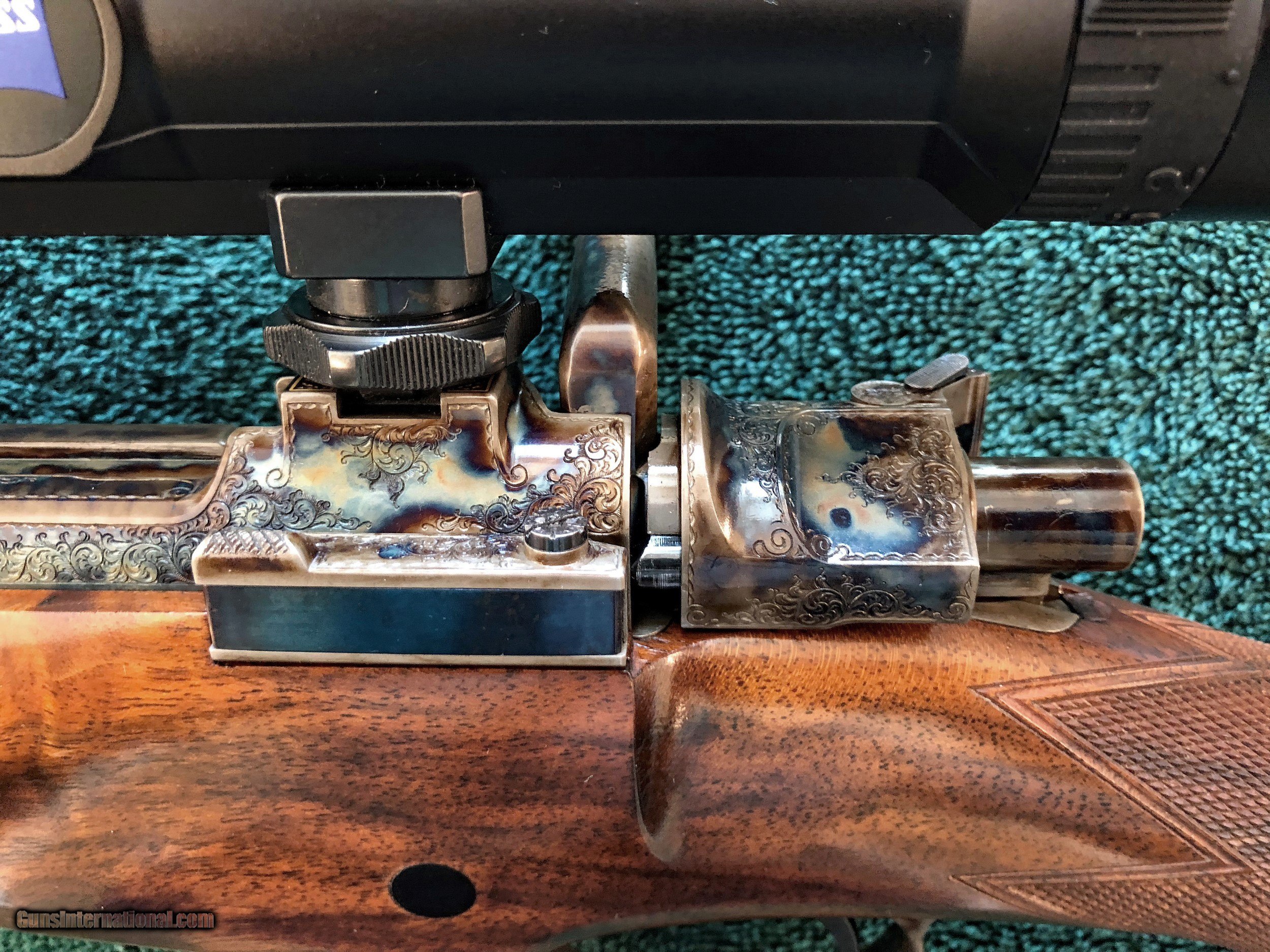 The rifle comes to the hand with ease and the fixed open sight is dead-on. The inletting is superb in the entire barrel channel and the action area is cut clean, crisp and truly professional, The original blue remains at 99%, The original stock finish at 100%, The checkering at 100%, The bore is as new, The overall fit, finish, handling and proper dimensions are well beyond 99.9% of all great custom bolt rifles. Balance is amazing!