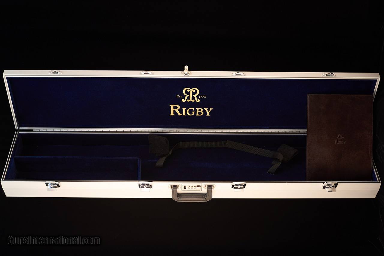 Comes complete with full length Rigby-branded soft sleeve inside factory hard case. Leather portfolio contains the factory test target and other paperwork. Upon purchase, register your new rifle with J. Rigby & Co in London to be added to the prestigious Rigby logbook!