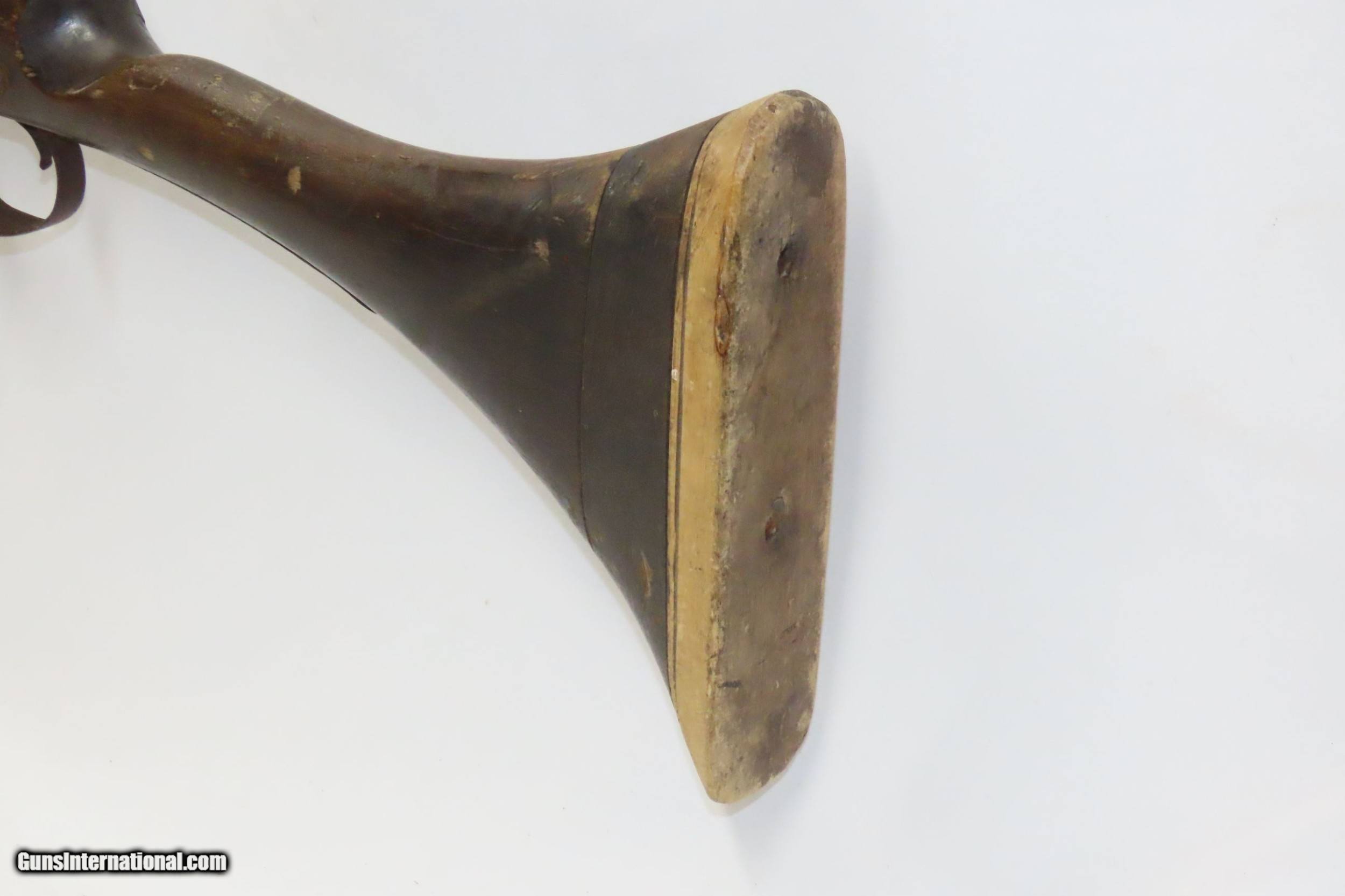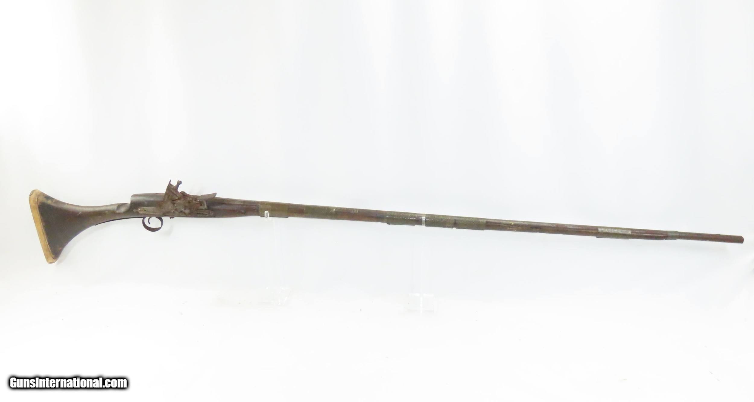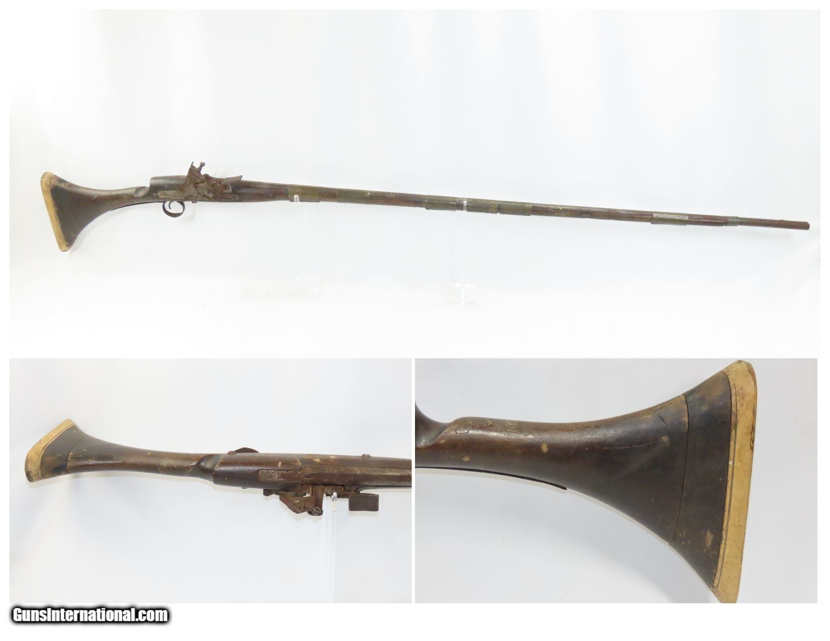 Description: BARBARY COAST/MEDITERRANEAN Antique KABYLE Snaphaunce FLINTLOCK Musket Unique North African Berber Flintlock Musket Here we present an antique Kabyle Snaphaunce Musket (also called moukalla), made circa 1800 in the Barbary Coast region of North Africa. The Barbary Coast was home to much upheaval, as many of the various kingdoms that made it up were member states of the Ottoman Turkish Empire. Pirates found their safe havens on the coast and raided the Mediterranean Sea and taking slaves. The slave trade was another unsavory reality of the northern coast of North Africa. In fact, piracy and the taking of European and American slaves came to be so great a problem at various points over the centuries that nations like Spain and even the U.S. took military action—Spain in the 1730s and America in 1805. The snaphaunce lock was one of the earliest flintlock systems. These types of locks were used with this style of musket in Africa for a very long period, one source stating from the 17th through the 20th century. The action does not function. The bore is smooth and dark. Absent ramrod. A slight bend in the muzzle is present. Own the original! This is a legitimate antique and not a reproduction. Barrel is 52 inches. Caliber: .60 Overall condition as seen in photos. Very Fast. Very Safe. FREE SHIPPING WORLDWIDE. Delivered directly to your door by express mail! Guaranteed AUTHENTIC & Includes CERTIFICATE OF AUTHENTICITY. ancestryguns $1200 #217742 SOLD Antique: Yes |