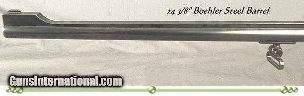 Description: #32129, Renato Gamba Italian Built Single Shot Break Open Top Lever Stalking Rifle in 30-06, Model Prinz, Made in 1970, 24 3/8" Extractor Boehler Steel barrel, Full length solid rib that is profiled with a 1/4 rib and front ramp, 1 leaf standing rear sight, Factory installed Claw Mounts, Kahles 4 X scope, Double under lugs with double bite, Kersten style single extension cross bolt top lock, Double set triggers, Top tang safety, Scalloped frame, 70% coverage of scroll & floral engraving, Sling eyes, 14" lop over a horn buttplate, 6 lbs. and 7 lbs. with the scope, Overall it is 97% on both the metal & wood, Original gun, The bore remains as new. Here is a light, trim, sleek, handsome single shot with very strong lock-up and it points and handles like a dream. This is much better value than a lot of the current stalking rifles made today. SOLD |