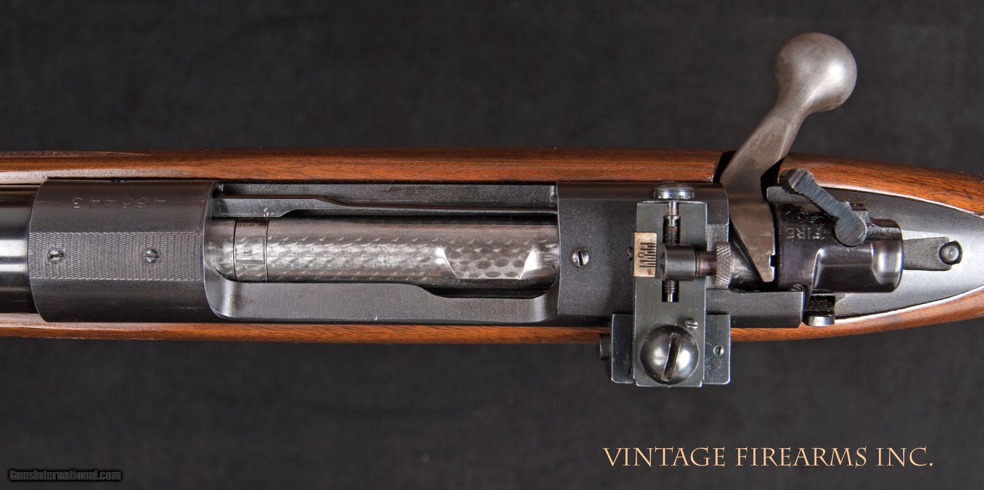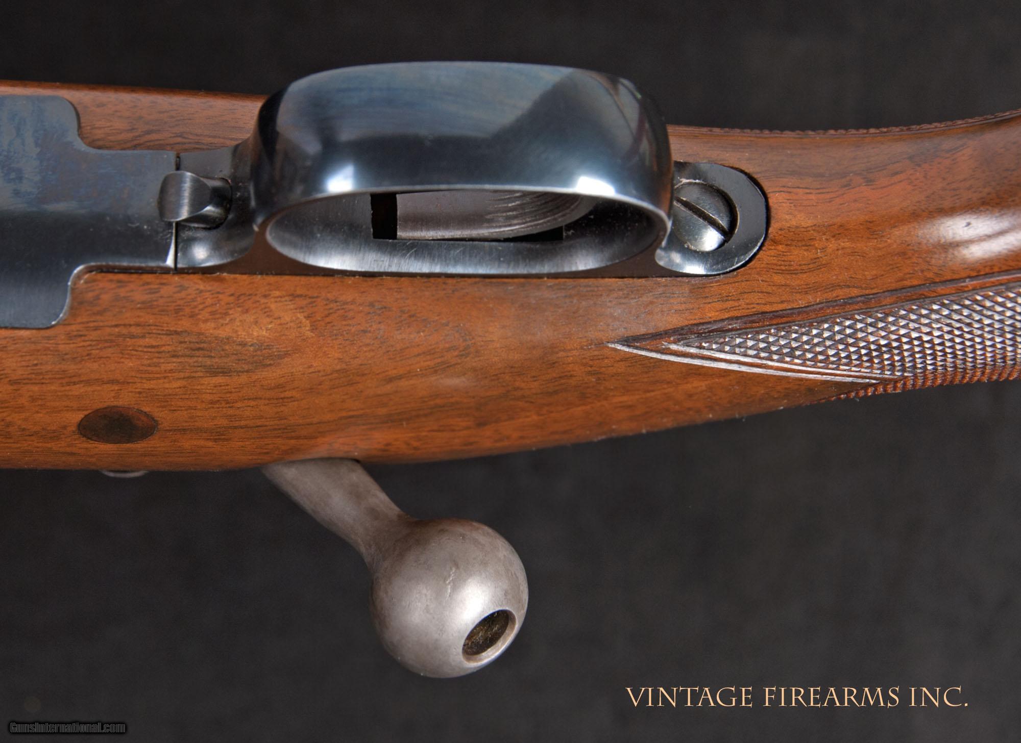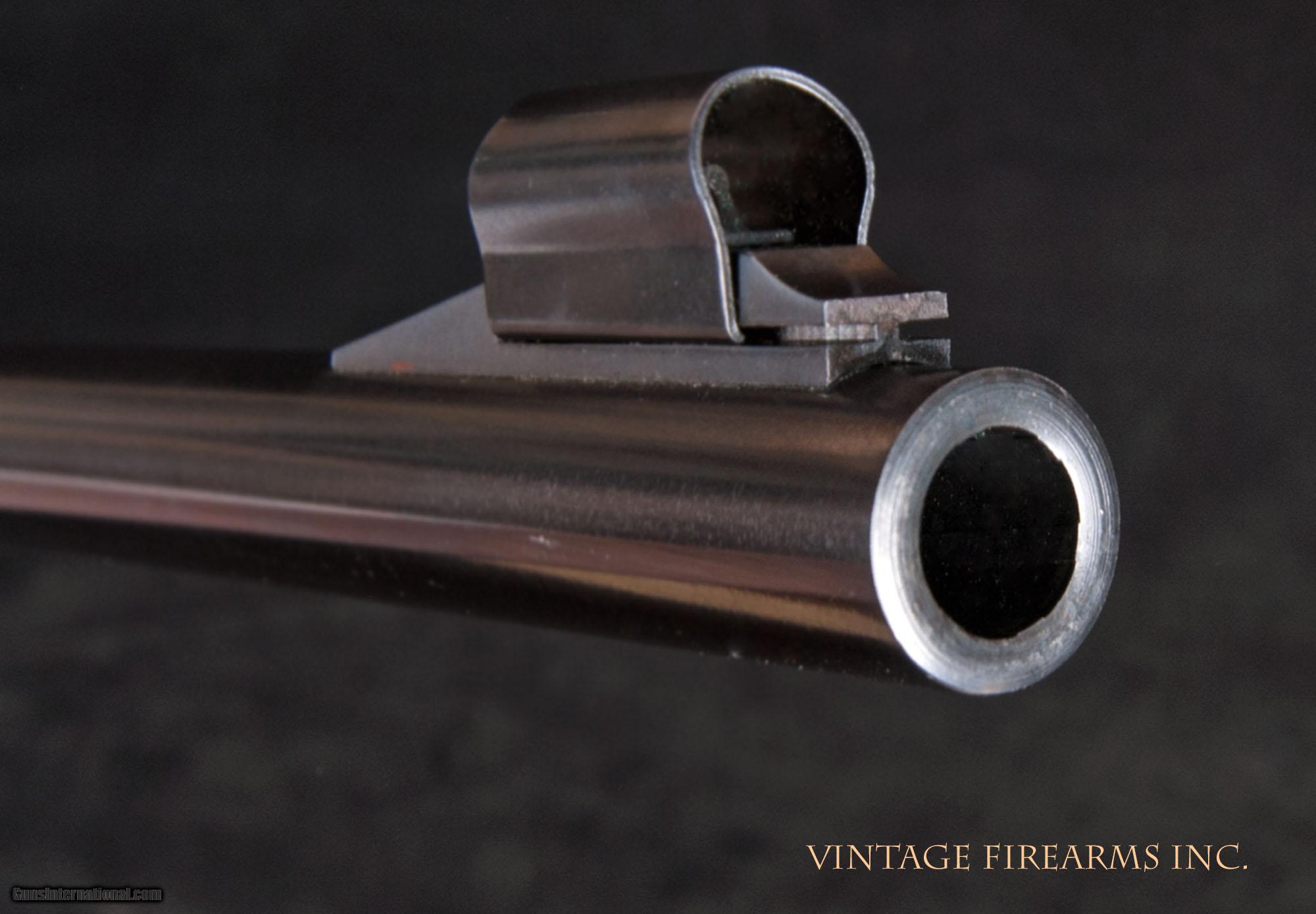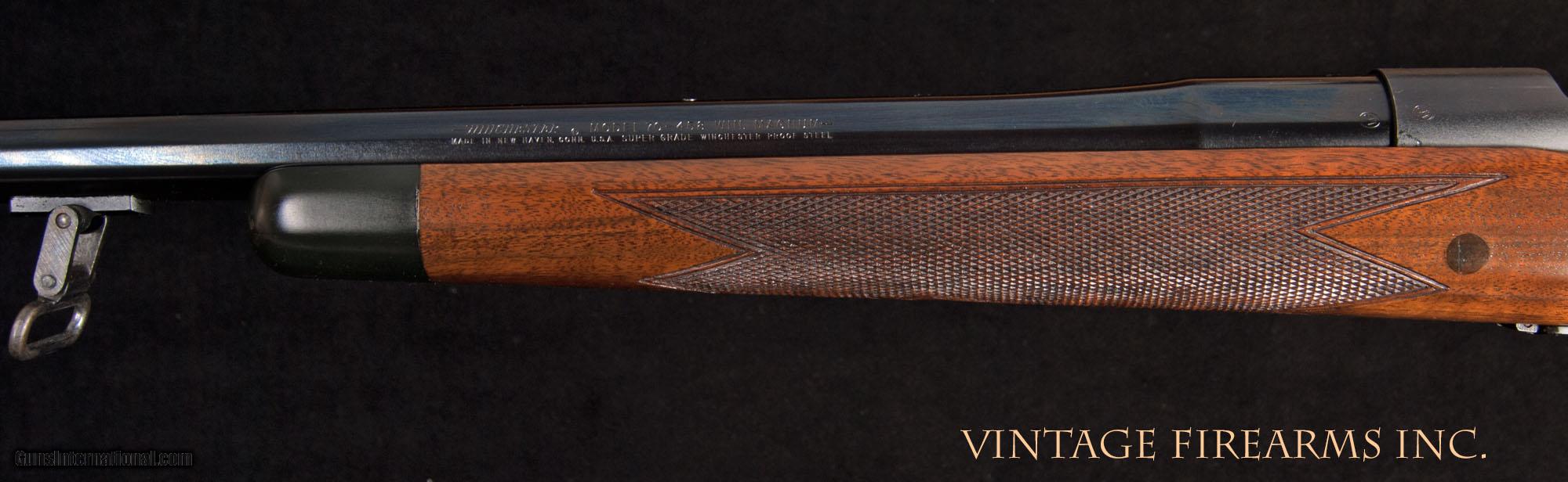 Description: Winchester Model 70 AFRICAN .458 Mag Rifle MODEL 70 AFRICAN SUPER GRADE, MINT, PRE-1964, .458 MAG General Specs: Winchester, Year 1960, .458 Mag, 9lbs, Rifle Serial Number: 465443 Winchester's Model 70 wascalled the "Rifleman's Rifle" by many in the know, including shooting editor of Outdoor Life, Jim Carmichael. Known for its accuracy, rugged durability, and overall good looks, the Pre-64 Winchester Model 70 has continued to be in high demand and has grown in value yearly. The number of styles, configurations, calibers, and slight design changes make the Model 70 a collector/shooter's dream. Most of the Model 70 rifles produced were Standard rifles of various calibers. The Super Grade was for shooters who wanted a deluxe rifle and came with an ebony forend tip, the Super Grade marking on the magazine floor plate, special stock configurations, etc. Of the over 1/2 million pre-64 Model 70 rifles produced, only 2.73 percent, or about 15,000 were Super Grades. The AFRICAN, a Model 70 Super Grade that was produced only in .458 Winchester Magnum caliber from 1956 through 1963, was a special style all its own and total production was only 1226 rifles. The .458 belted magnum is a true African dangerous game caliber, and the African weighed 9lbs. came standard with a recoil pad, multiple reinforcing lugs to support and strengthen the stock against the robust recoil, and a forward sling swivel attached to the barrel rather than the stock. This gun, sn465443 produced around 1960, is an AS NEW example of the African, with over 99% factory finishes throughout. Shipped with highly figured walnut, and it appears a special order Lyman 57WJS rear sight, the gun has barely been fired. The Lyman 57WJS was an available special order rear aperture sight for the Model 70 rifle, and if utilized the buyer would often forego the standard rear sight an its high mounting block. The bore and chamber throat are mint, there are only two tiny handling marks in the wood, and the jeweled bolt shows little wear. THE CONDITION AND RARITY OF THIS SUPER GRADE MAKES IT A VERY COLLECTIBLE, INVESTMENT GRADE RIFLE that would be a classic to take on safari or to take down any of North America's largest game. Don't let this one slip away, and thanks for looking! Barrels Barrel Length: 25" Bores: perfect mirror % Blue: 100% factory Sights: Lyman 57WJS rear Action Action: jewelled bolt Case Color: blue 100% factory Screws: excellent Trigger Type: single crisp Trigger Guard Color: 100% factory Stock Type: figured monte carlo stock with cheek piece LOP: 13 3/4" LOP To End Of Wood: 12 7/8" Checkering Condition: excellent factory Butt Treatment: winchester pad factory There are more photos upon request. We offer a 30 day mechanical warranty on this fine shotgun. Call us for full details. PLEASE SEE MY OTHER FINE VINTAGE FIREARMS. Just open one of my ads and click on the line that says “see all items from this seller” and a very nice list of fine sporting and collectible arms will appear. I have many more fine sxs shotguns not yet listed. Thanks for looking! We employ a full time gunsmith on premises and can perform alterations to suit your needs within a few weeks of purchase. Payment Methods: Money Order, Certified Check, Personal Check, Wire Transfer Inspection Period / Return Policy: Three Days from the date the item was received. Sales Tax: 6% Michigan Only Shipping & Insurance: Ground $65.00 We ship internationally! Item Condition: Used Requires FFL?: Yes If you have any questions about this item or payment, please email or call us directly, at #616-292-6240. Thanks! Vintage Firearms, Inc SOLD Curio/Relic: Yes |