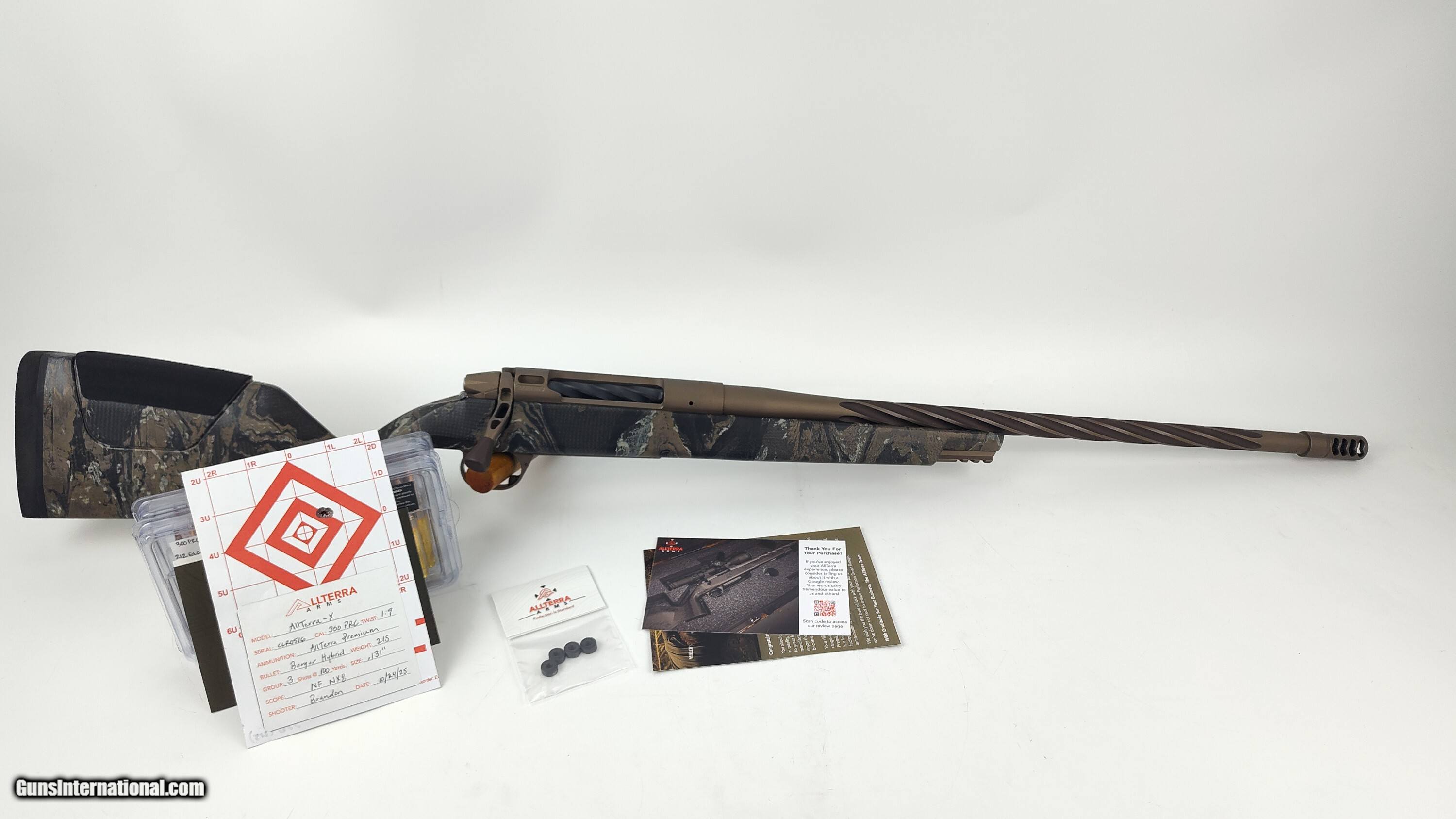 Description: Allterra Arms AllTerra-X Steel - 300 PRC - Factory New - Includes 40 Rounds Ammunition Allterra Arms AllTerra-X – Precision Engineering Meets Mountain Performance American Craftsmanship from Boise, Idaho – Range Tested & Hunt Ready Introducing the Allterra Arms AllTerra-X Steel rifle in 300 PRC, delivered factory new as a complete performance package. This represents the culmination of 18 months of intensive research and development, successfully bridging the gap between tactical rifle ergonomics and lightweight mountain hunting capability. Remarkably, the AllTerra-X achieves a lighter profile than even Allterra's flagship Mountain Shadow models, without compromising the premium features demanded by serious shooters. Engineered with patented Bolt-to-Bore Alignment™ and Dual-Tenon Barrel Connection™ for exact concentricity, and featuring the revolutionary No-Fail Cycling™ guarantee for flawless field operation, this rifle is built to perform from high-altitude backcountry to the 1,000-yard steel range. The desert finish 22" spiral-fluted steel barrel is topped with a V4 Titanium Self-Timing Brake, while the ergonomic stock features an adjustable negative comb, vertical textured grip, and integrated mounting solutions including flush forend Pic rail and QD flush cups. This complete package includes 40 rounds of AllTerra Premium 300 PRC ammunition, making it truly hunt-ready upon arrival. Proudly manufactured in Boise, Idaho, using premium American materials and engineering, each rifle undergoes thorough range testing to uphold the Allterra performance guarantee. Technical Specifications