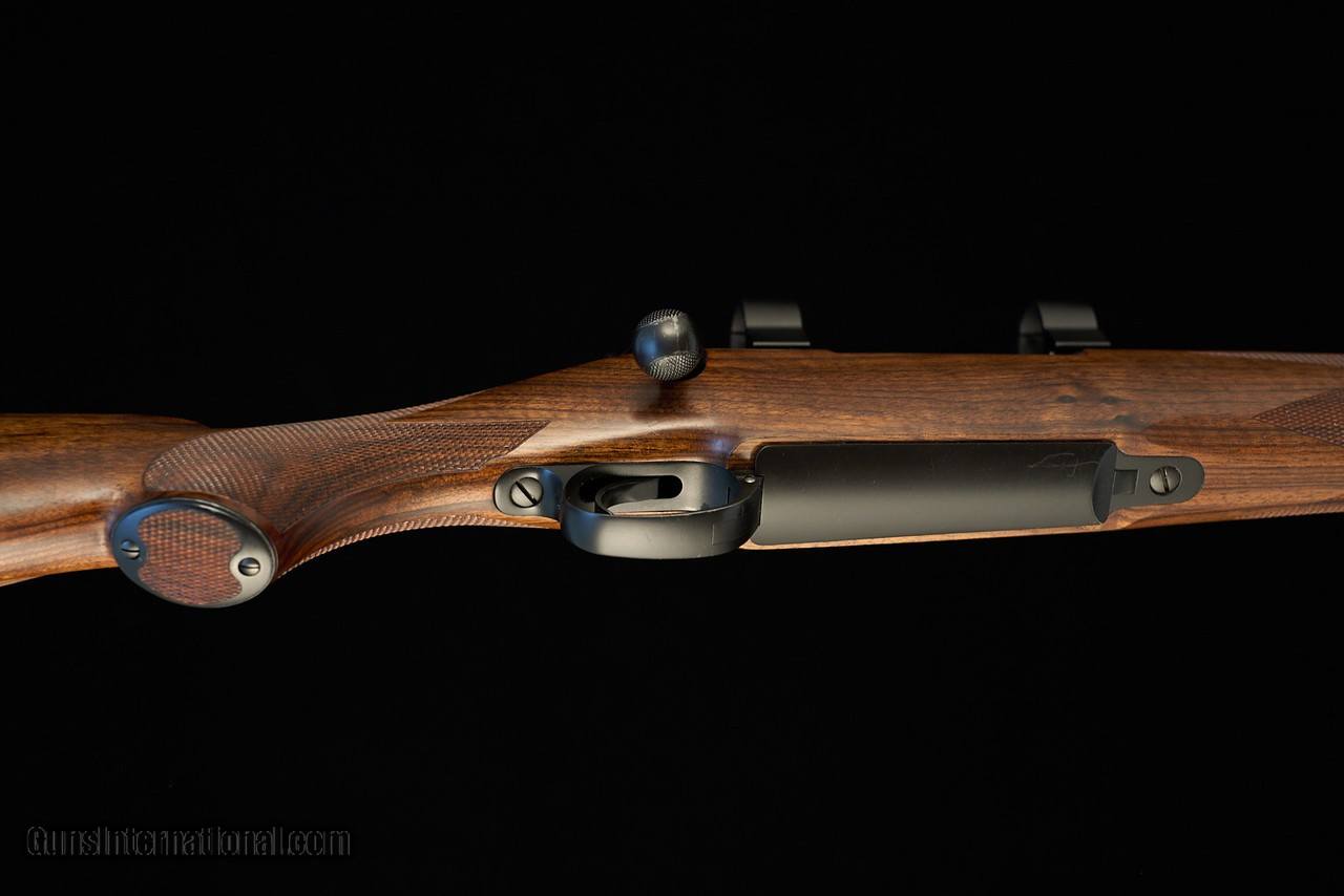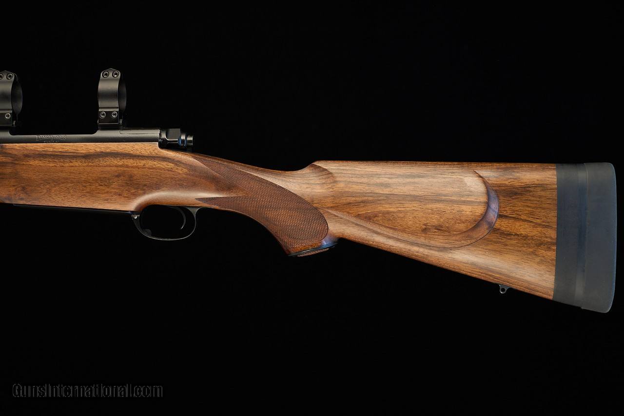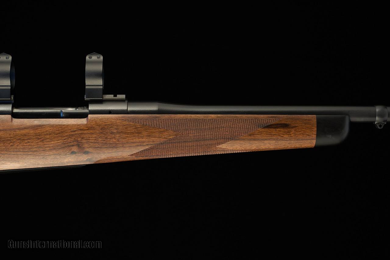 Description: Used/excellent Dakota 76 chambered in .338 Win Mag. Stock is well-figured Turkish walnut with wraparound point-pattern checkering on forearm with twin fill patterns on the grip. Steel grip cap is skeletonized with the exposed wood neatly checkered. Metalwork is all black Cerakoted, with a couple of handling marks on the hinged floorplate. Forward sling swivel base is banded and mounted to the barrel in classic safari style. Safety is the classic Model 70-style with three positions. Muzzle brake is well blended to barrel and maintains the same profile. Satin oil wood finish shows only the lightest of scattered handling marks. Mechanical condition is excellent. Length of pull is 14 5/8" to the end of a well fitted Kizkeez pad atop black spacers. Manufacturer: Dakota Arms Caliber Info: 338 Win Mag Barrels: 22 Action: Bolt-Action Gauge: 338 Win Mag LOP: 14-5/8 Price: $6,400.00 Contact Seller |