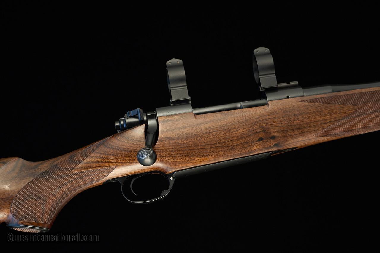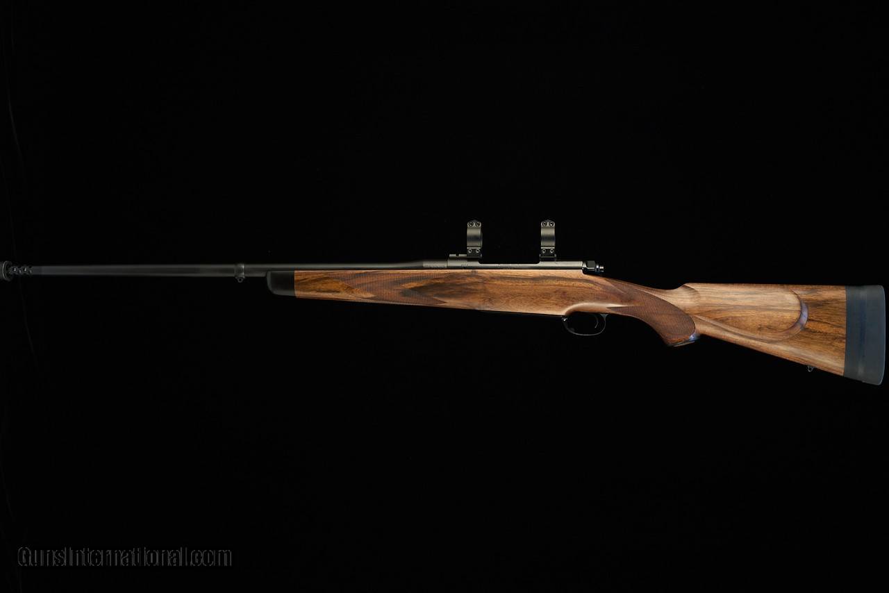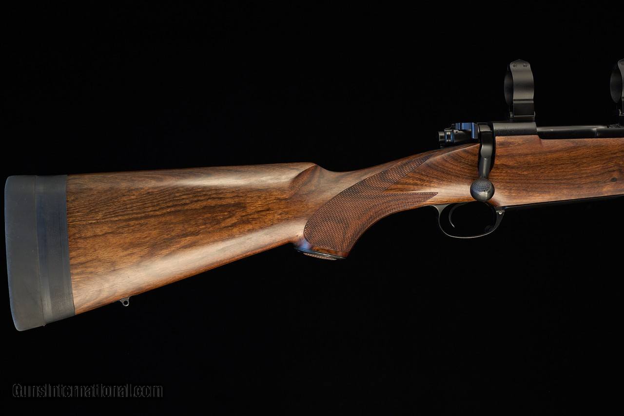 Description: Used/excellent Dakota 76 chambered in .338 Win Mag. Stock is well-figured Turkish walnut with wraparound point-pattern checkering on forearm with twin fill patterns on the grip. Steel grip cap is skeletonized with the exposed wood neatly checkered. Metalwork is all black Cerakoted, with a couple of handling marks on the hinged floorplate. Forward sling swivel base is banded and mounted to the barrel in classic safari style. Safety is the classic Model 70-style with three positions. Muzzle brake is well blended to barrel and maintains the same profile. Satin oil wood finish shows only the lightest of scattered handling marks. Mechanical condition is excellent. Length of pull is 14 5/8" to the end of a well fitted Kizkeez pad atop black spacers. Manufacturer: Dakota Arms Caliber Info: 338 Win Mag Barrels: 22 Action: Bolt-Action Gauge: 338 Win Mag LOP: 14-5/8 Price: $6,400.00 Contact Seller |