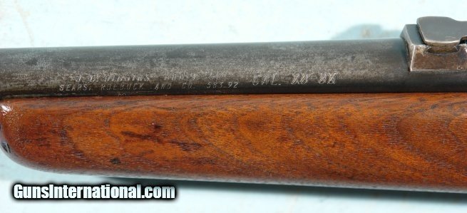 Description: J.C. HIGGINS MODEL 50 FN MAUSER .35 WHELAN CAL. SPORTING RIFLE CA. 1950’S. 22” round barrel originally .30-06 cal. re-bored to the then very popular .35 Whelan cartridge and stamped at the left breech “35 WLN”. Original elevator rear and ramp front sights. Original fine quality F.N. Mauser 98 commercial action. Scope mount blocks added. Otherwise original Model 50. Very good overall with thinning original blue. Stock with the original lightly worn finish and original J.C. Higgins hard rubber butt plate. Very slight 1 ½” old hairline behind receiver tang. Perfect working order and excellent bore. SOLD Curio/Relic: Yes Rifle Caliber: .35 Whelen |