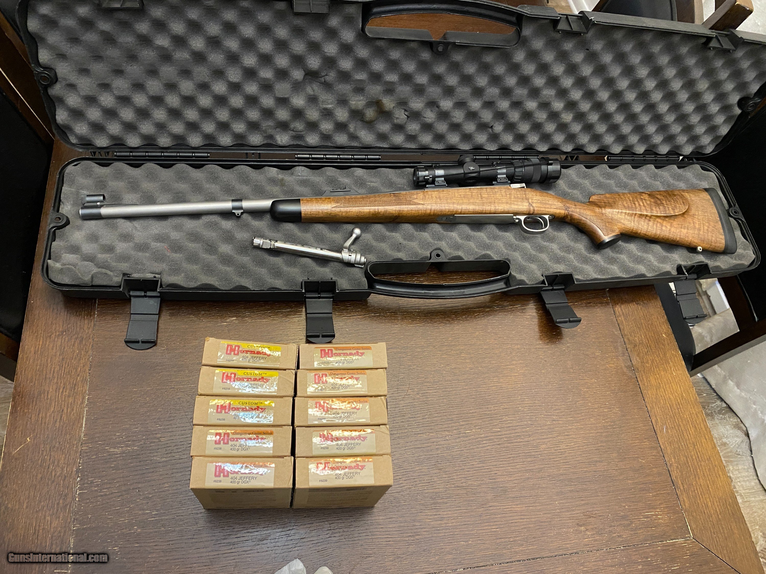 Description: Montana Rifle Company 1999 Model in 404 Jeffery in rare Stainless Steel. Rifle just back from Africa where it took 6 animals two at 300 Yards! 22 inch barrel, 14 1/8 inch LOP from front of trigger to end of butt pad. 9 pounds. Comes with Trijicon 1-4-24 scope. Rifle only has about 50 rounds through it. In awesome condition. Comes with 5 boxes Hornady DGS and 4 boxes Hornady DGX factory ammo by itself a $2,000 value. Also comes with dies and bullet holders for reloading. $6,500 for package. SOLD |