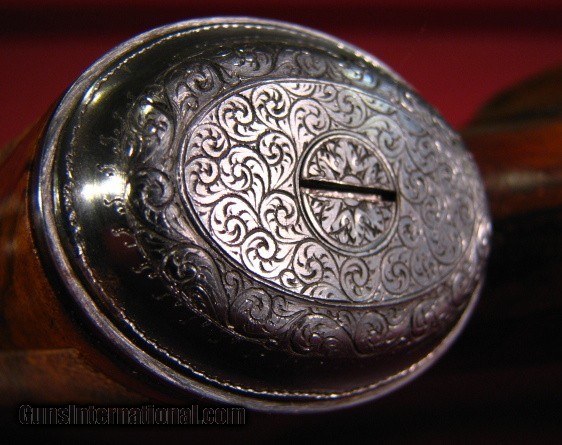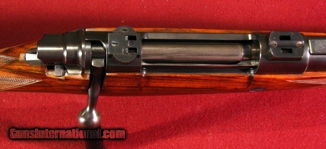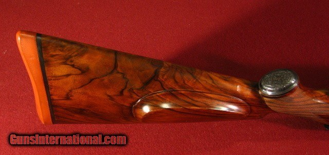 Description: Peter Noreen .416 Rigby built on his proprietary Noreen true magnum length control round feed action. Features a 24" barrel with hooded banded ramp front sight, banded sling swivel stud, and quarter rib with single standing leaf with gold center line. Bore is excellent. The Noreen magnum action features a checkered bolt release, Canjar adjustable trigger with checkered side safety, and drop box bottom metal with straddle floorplate and trigger bow release. Topped with a Swarovski 1.5 x 4.5 x 20 scope with three heavy posts and fine crosshairs in claw mounts. Stocked in an excellent piece of Turkish walnut with darkly contrasting marble cake lines, 26 LPI point pattern checkering with mullered border that wraps the forend, ebony forend tip. pancake shadow line cheekpiece, and engraved forward crossbolt and pistol grip cap. LOP is 14/12" over a Silver's pad. 10lb 12oz as scoped. Mr. Noreen is a talented craftsman and gunmaker. He sold his superb proprietary action to Waffenfabrik Hein which subsequently went out of business. He has since left the world of fine wlnut and blued steel to join the Dark Side building large bore rifles on the AR platform with his son. This piece has been to Africa and tasted buffalo. It does have some dents and dings from field use. Blue remains at 98%, stock finish at 95% and checkering at 99% This is excellent quality and value in a true and outstanding magnum length action. SOLD |