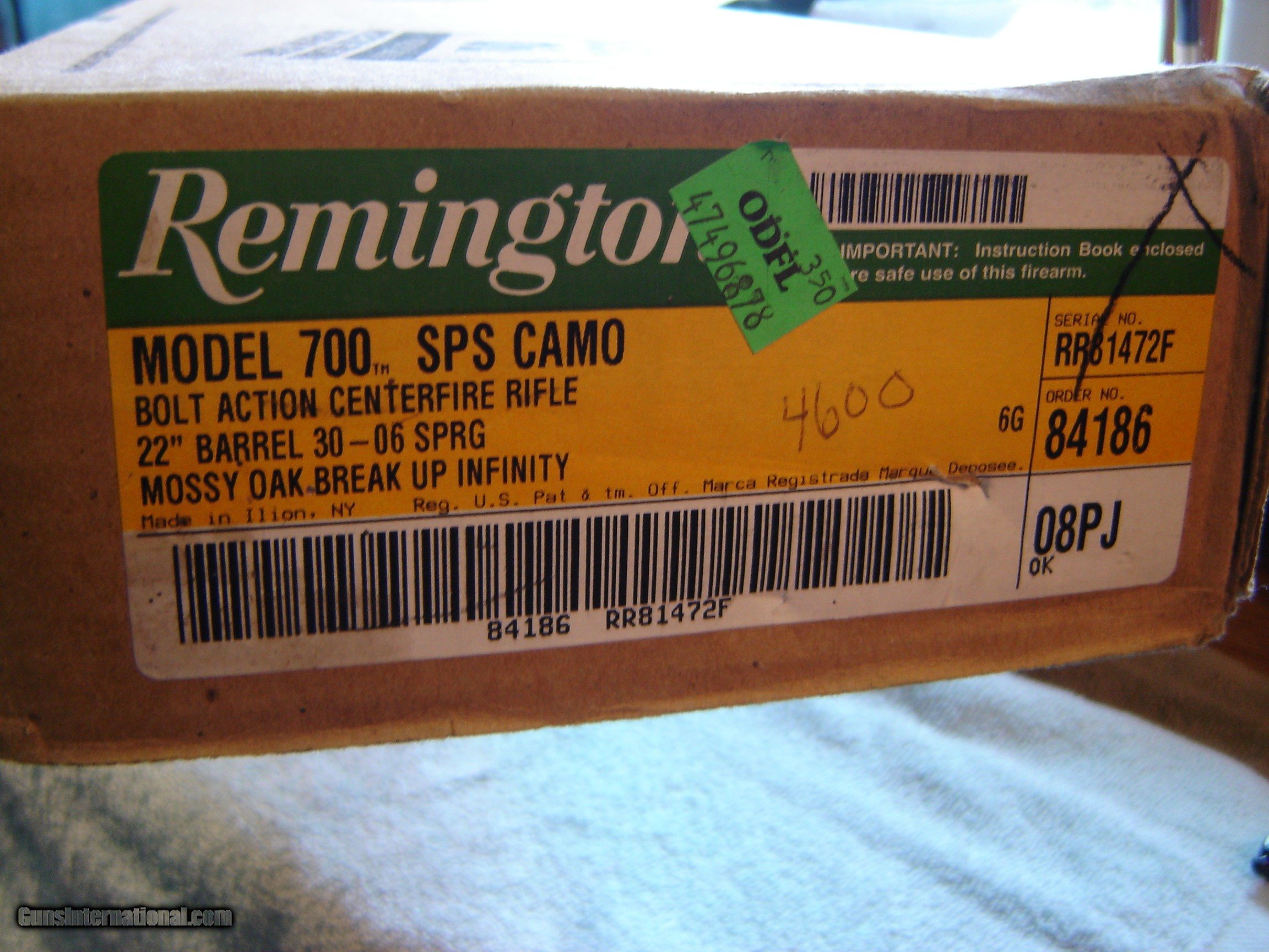 Description: Remington 700 SPS Camo-30-06 SPRG- Mossy Oak Break Up Infinity- 22" bbl.. New and unfired in the box with all papers. No California sales. SOLD Manufacturer: Remington Model: 700 SPS Camo Serial Number: RR81472F Barrel Length: 22 Caliber Info: 30-06 SPRG Condition: new/unfired in box Wood Condition: Mossy Oak Break Up Infinity |
