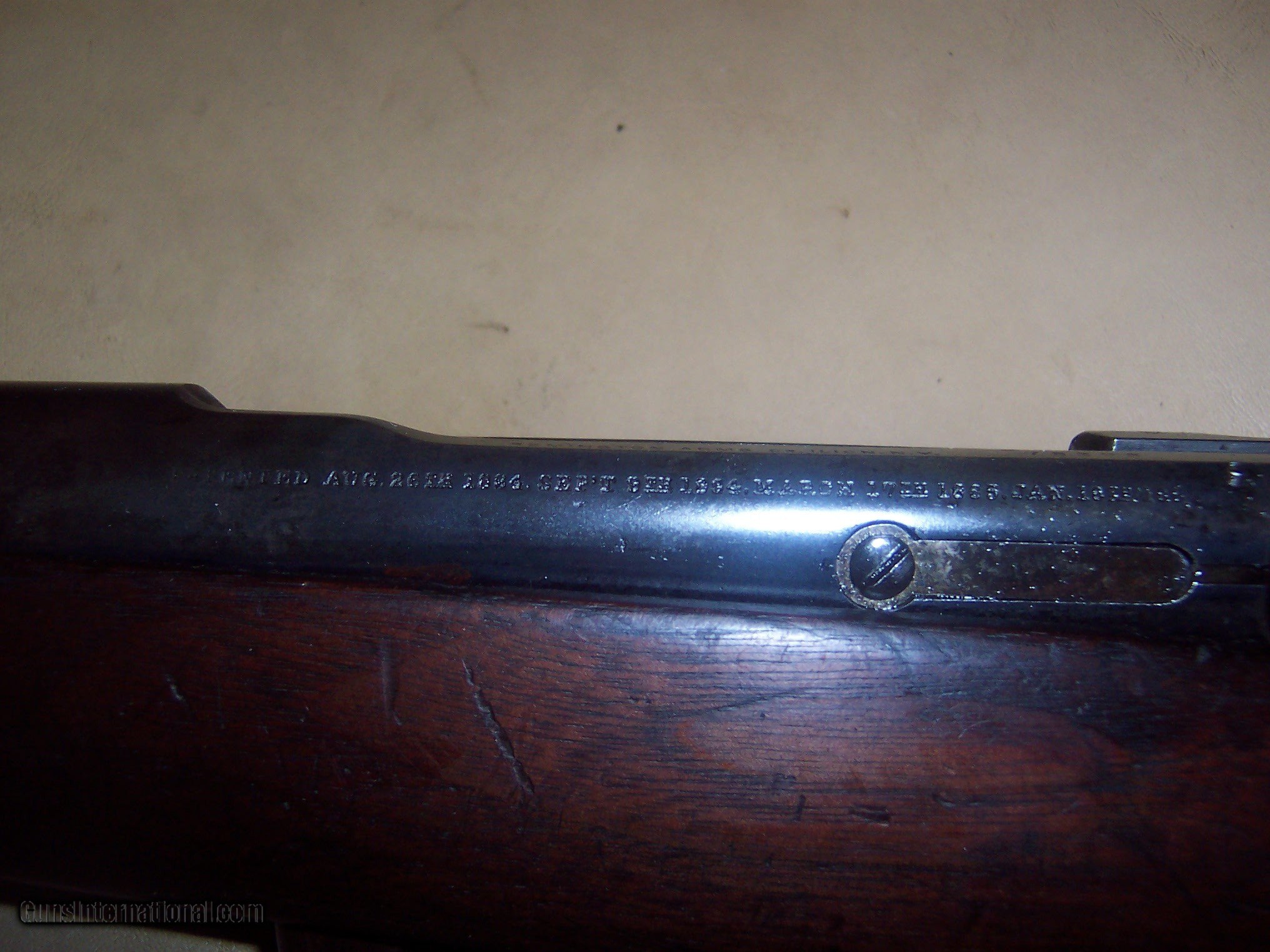 Description: gun chambers a 30 -40 krag cartridge but not sure what caliber gun is /// bore is good with good rifling // some original blue on gun blue brown patina no piting / all original and works fine in dry fire / original; sporter model / stock is usable and solid but has cracks along right side of fwd part of forearm // forearm has been epoxy repaired / chip in forearm insert/ no extra holes or modification to metal // front sight insert may be a replacement// butt plate was cased now a grey color $56 sh // serial # 75395 gun ready to hunt or put on wall SOLD Curio/Relic: Yes |