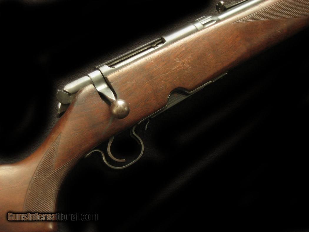 Description: Scarce delux version with checkered walnut stock, in good original condition and complete except for sling studs/swivels. Excellent bore. Stock wore a slip-on pad for years which we removed, requiring the application of a little fresh linseed oil. One magazine. 22" barrel. These make great truck rifles in states requiring the firearm to be unloaded ... simply insert clip, work the bolt, and you are ready to go. Not drilled for a side scope mount like the later production, but rather for a receiver sight; separately, we have (now unobtainable) Williams receiver sights for this model for us seniors who find conventional iron sights fuzzy. SOLD |