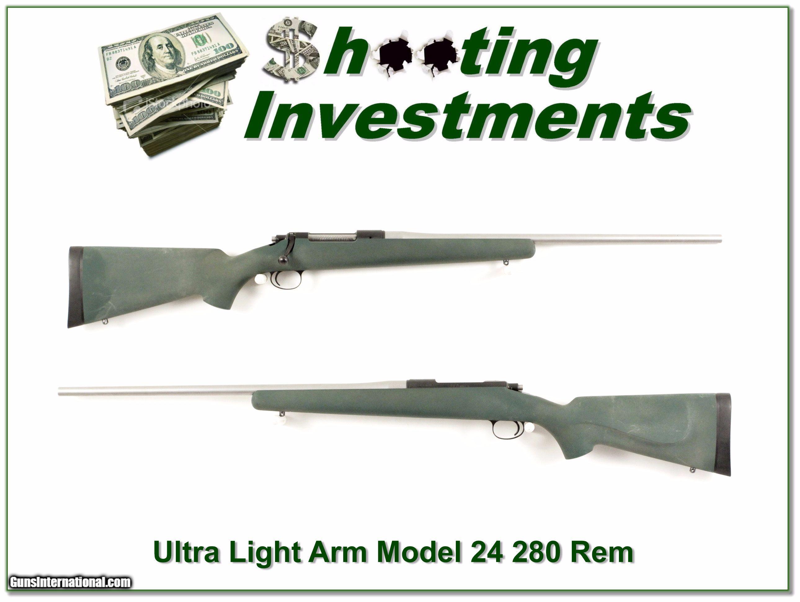 Description: This is a hard to find Ultra Light Arms model 24 in the Very Hard to find 280 Remington. It weighs less than 5 ½ lbs. and has a 23in stainless barrel. The gun has been lightly used and comes with dies, brass and ammo as seen. I am selling this one on consignment and as such, lay-a-way can’t be used. It does of course have the standard 3-day inspection. Shipping and insurance is $35 or $15 more if you want it shipped in a new Plano hard case. Shipping of the dies and ammo must be separate and is $20 more if you want it. Please email me with any questions or larger pictures. (Consign your quality firearms with Shooting Investments for only 10%! Let me know if you have any you would like to sell!) 17-0998 Payment: Payment is by Money Order, Cashiers Check or Personal Check. I can now also accept MasterCard and Visa with a 3% convenience fee. PayPal can be used for some items but never firearms. Please let us know if you would like to pay via PayPal. Shipping: The shipping charge will be listed in each description. It is $35 for most guns. Some heavy guns or those insured for over $2000 will be higher. Shipments to Alaska and Hawaii are higher because air shipment is required. Most firearms are shipped within 5 days of receipt of payment. We prefer shipping at the beginning of the week to avoid firearms in transit over weekends. We package all shipments carefully and insure them for the full purchase price, rounded up to the next $100. In the unlikely event that damage occurs, it is important that you save all packaging material for the claims process. Optics are shipped Priority Mail and most other non-firearm shipments are shipped First Class. Returns: Our return policy is simple. If for any reason you are not pleased with your purchase, you may return your item for a refund. The only exception is ammunition, it cannot be returned. It is important to us that you are happy. Guns cannot be fired or dissembled before returning them and must be returned in the same condition as received. Notification of a return must occur with-in 3 days of receipt at your dealer. Shipping, convenience and dealer fees are not refundable and are the responsibility of the buyer. Lay-a-way: If needed, we offer a 60 day lay-a-way option on most firearms. It is 1/3 now, 1/3 in 30 days and 1/3 in 60 days. Lay-a-way firearm sales are final. Consigning your firearms with Shooting Investments: We will help you get top dollar for your firearms. While most local guns shops charge 20% or more, our fee is only 10% with a minimum of $50. At your local gun shop it might take months to sell. Selling on-line provides instant access to thousands of interested buyers. You won’t find any other on-line dealer willing to sell your firearms for only 10% or listing every gun on 4 separate s. Selling through an House typically costs the seller 15% and the buyer an addition 15% (so 30%) and you have to wait several months to sell and longer to receive funds. If properly priced, we will sell your firearms in a week or two. Send us an email or give us a call and we’ll explain how easy it is for you to get top dollar. Trading: We collect guns and usually just trade for guns we want to add to our collections. We often sell guns for others wanting to purchase one of ours. We find this the most fair to both of us. Our Commission is only 10% and we hold the gun you want until yours sells. Please contact us if you want to sell one of yours to buy one of ours. Help for California Buyers: We are happy to ship to California. It is the buyer’s responsibility to make sure any item you buy is legal in your state. We are also happy to help with your purchase of a firearm from someone other than us. If you see a gun you would like to buy but the seller can’t or won’t ship to California we can help. You buy the gun and have it shipped to us. We’ll then ship it to your California dealer. The cost for this service is only $30 + shipping. Let me know if we can help! SOLD |