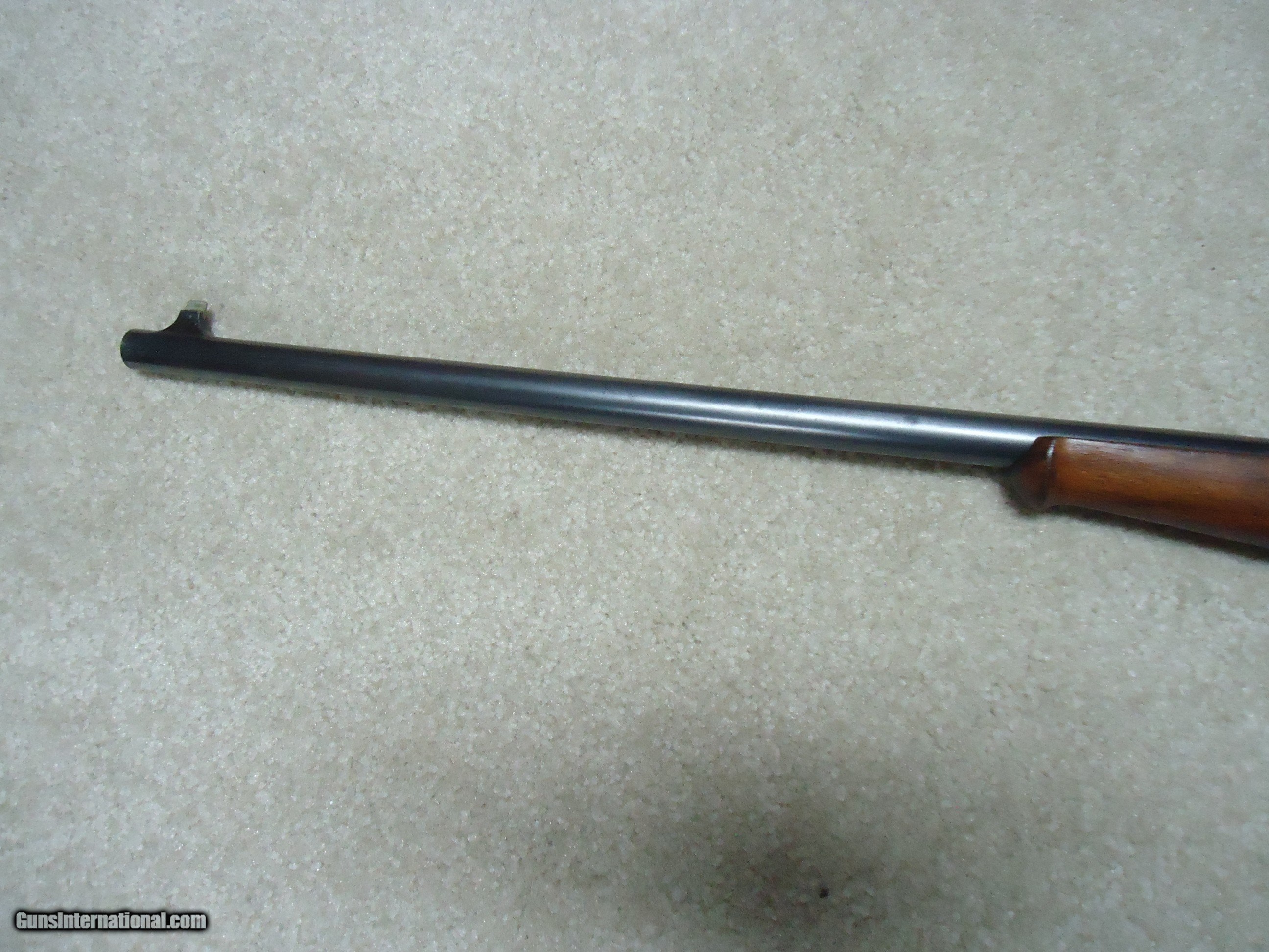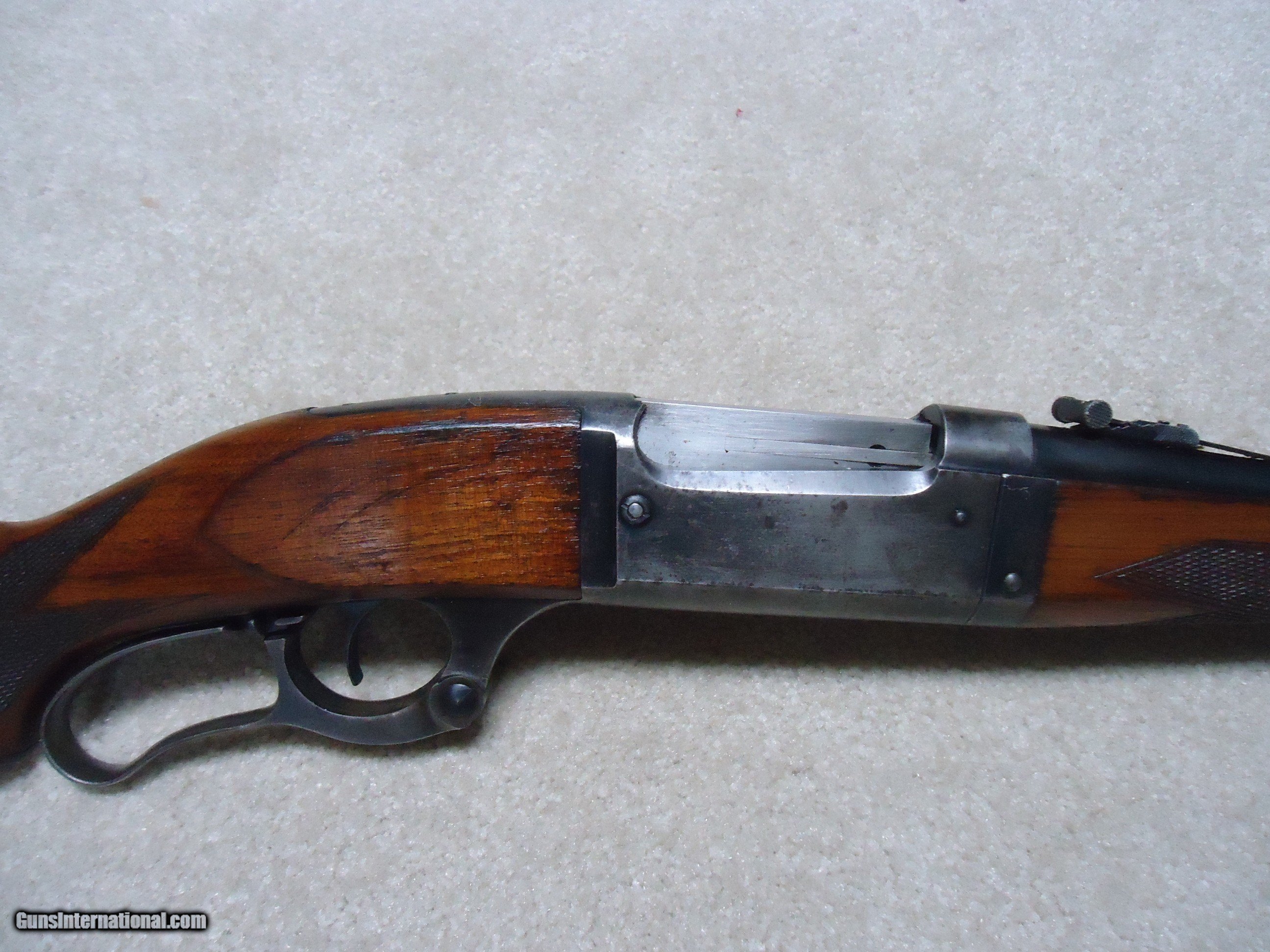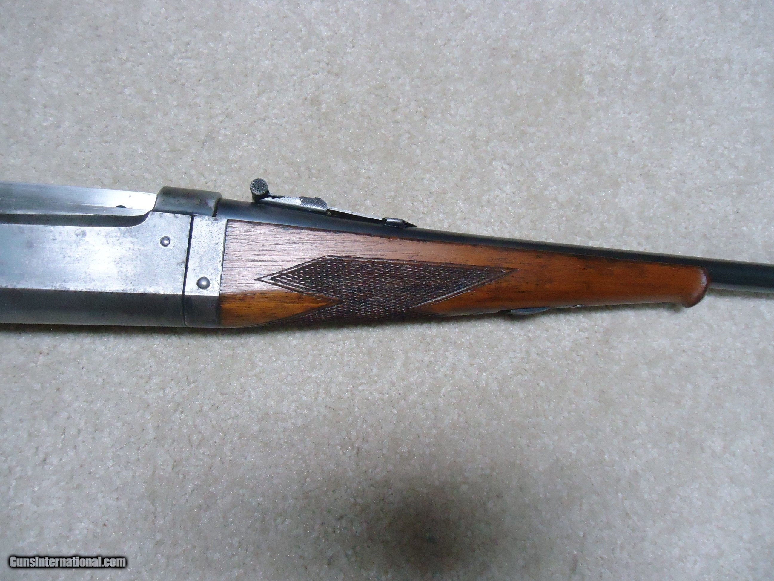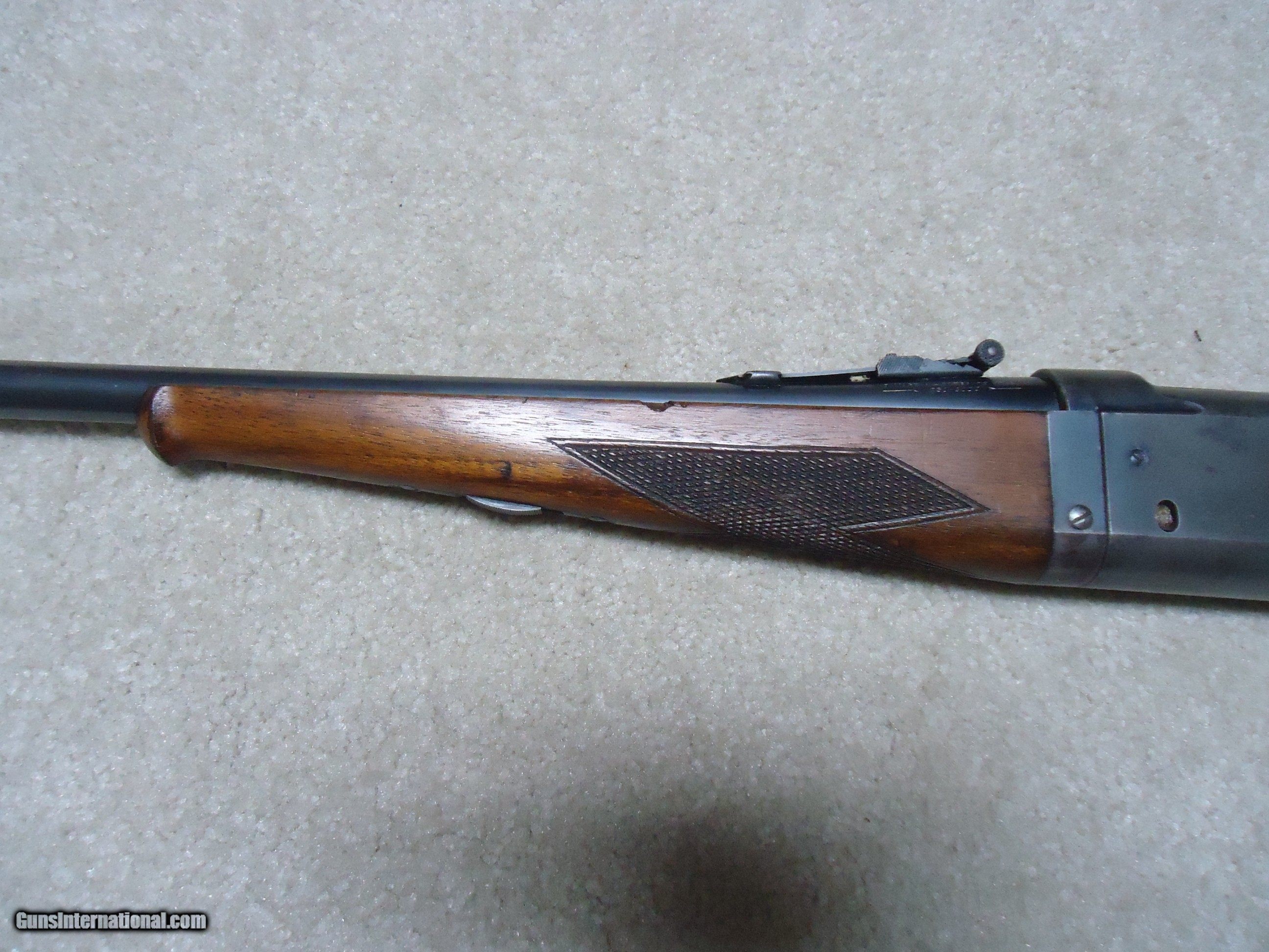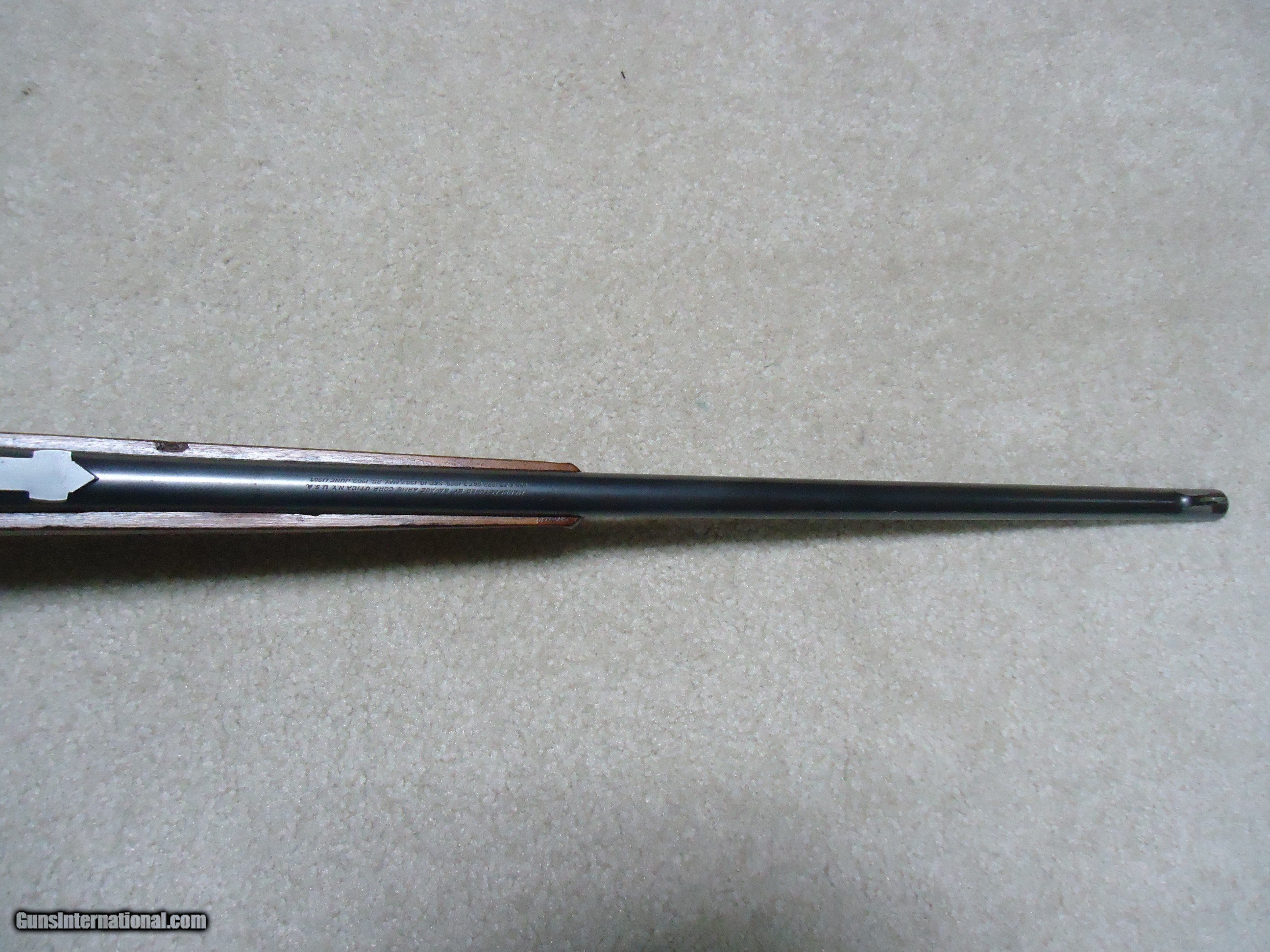 Description: SAVAGE 1899 TAKEDOWN, .250-3000 CALIBER, #201XXX, MADE 1919. A good, cared-for example that retains fine blue on the 22" barrel with original Savage marked rear sight. The receiver is mixing heavily gray with some good blue in the more protected areas. Tight takedown. Generally excellent wood with sharp checkering on the pistol grip and forend with no cracks or chips. Correct pistol grip cap and steel butt plate. Brass rotary magazine with cartridge counter cut out on the left side. Bright excellent bore. No extra holes. Nice 104 year old savage in a desirable caliber. SOLD Curio/Relic: Yes Rifle Caliber: .250-3000 Savage Manufacturer: SAVAGE Model: 1899 Serial Number: 201XXX Barrel Length: 22 Condition: VG Bore Condition: EXCELLENT |