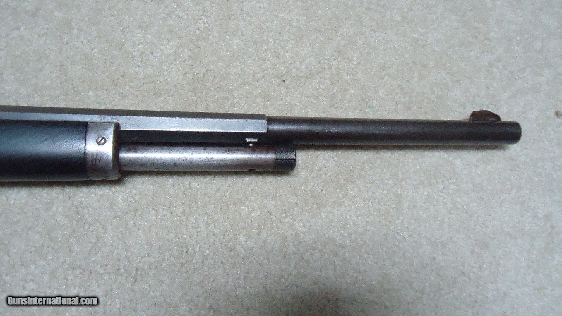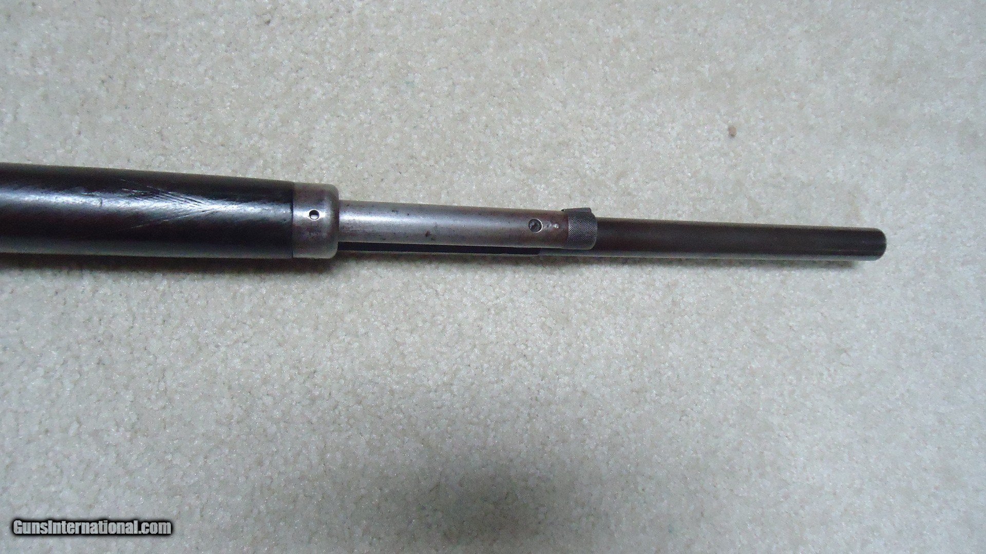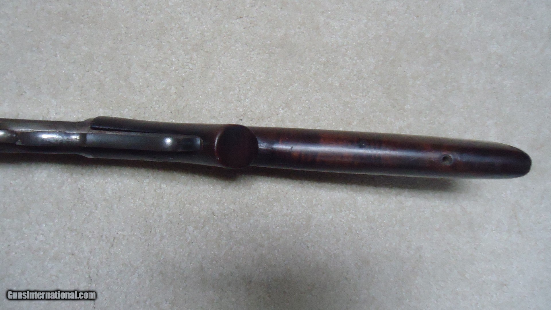 Description: ANTIQUE MARLIN 1893 FULL DELUXE TAKEDOWN RIFLE IN .30-30, #173XXX, MADE 1898. Well, that's the interesting part, but the rest isn't so great. This one has had a hard life The checkered fancy pistol grip walnut stock has been broken at the wrist and "frontier repaired" with some dowels and pins. Pistol grip checkering is heavily worn and the shotgun butt plate is a very worn hard rubber replacement. There is a sling swivel hole in the bottom of the stock. The forearm is solid with worn checkering and the forend cap has a sling swivel hole in the bottom. The walnut is an uncleaned very fancy burl that has never been cleaned. The barrel is 1/2 octagon with half magazine with the barrel cut to 21 inches. It is fitted with a buckhorn rear sight and blade front sight. I called this one in to the Cody Museum and the call-in sheet simply states: "Rifle, Caliber .30, 1/2 octagon, barrel length 26", pistol grip stock, takedown, shipped Oct. 19, 1898." The magazine does not appear cut. There are a couple of holes in the left side of the receiver from where there must have been a receiver sight or sidemount of some kind along with a wide notch cut in the rear of the receiver top that must have gone along with whatever sight was mounted at one time. Overall metal is an uncleaned gray/brown with some aged blue. Action works fine and the safety half-cock holds solidly. The bore is a bit dark, but quite decent! The ultimate "project gun" or just cool as it is! This one came out of here in Montana. I'm sure there are a load of adventures associated with this one! SOLD Antique: Yes Rifle Caliber: .30-30 Winchester Manufacturer: MARLIN Model: 1893 DELUXE Serial Number: 173XXX Barrel Length: 21 Condition: FAIR Bore Condition: VG |