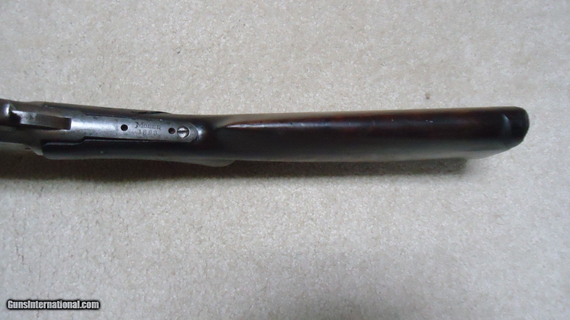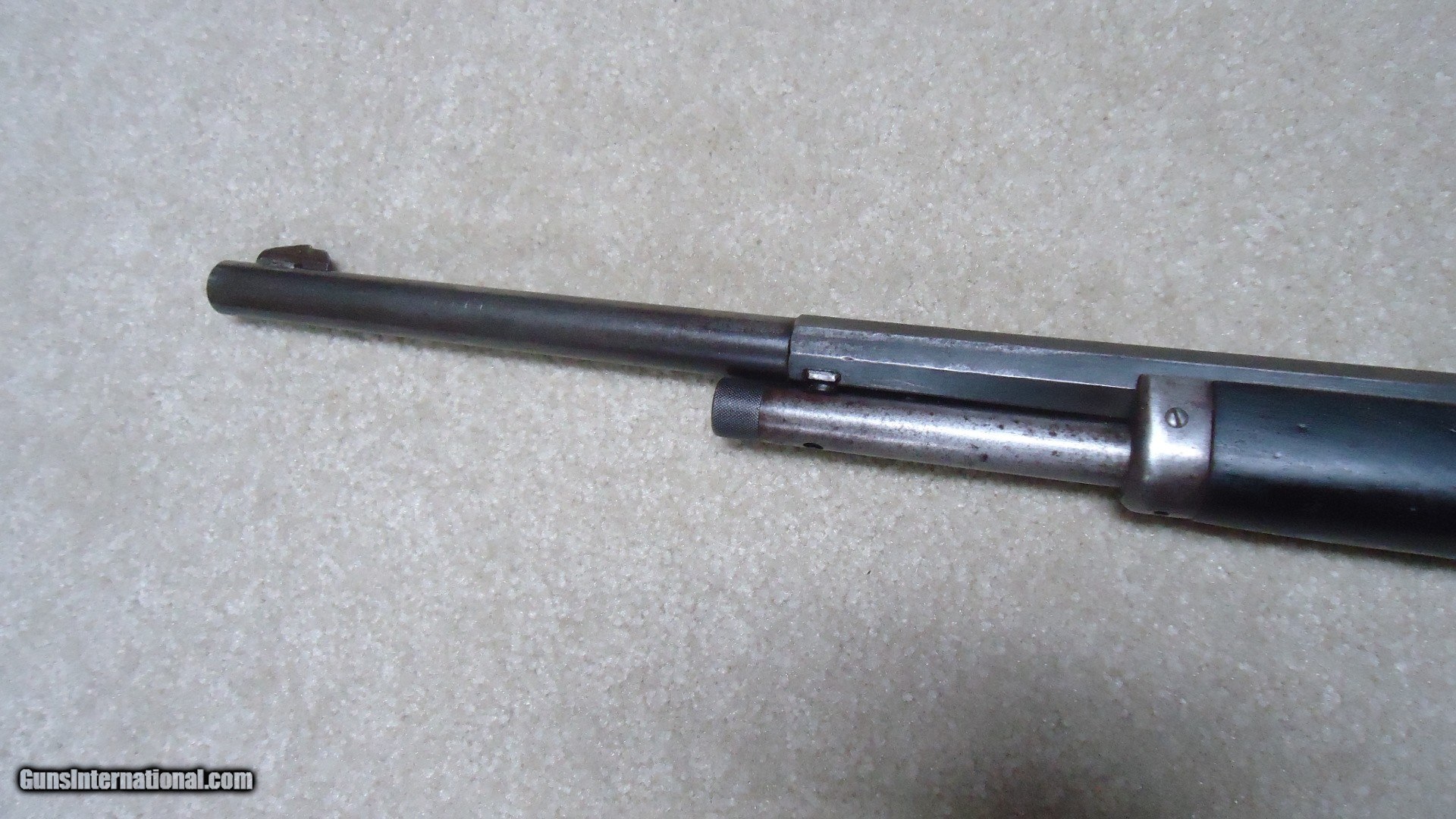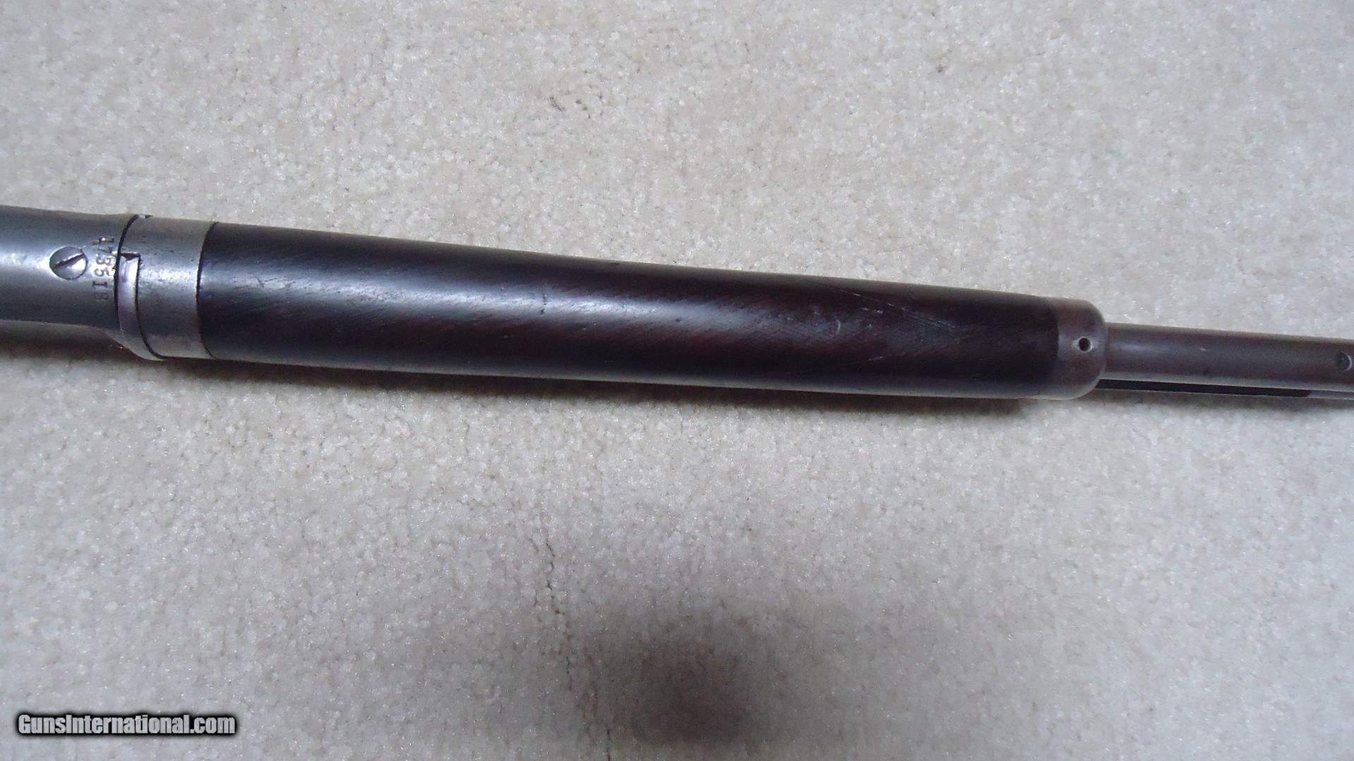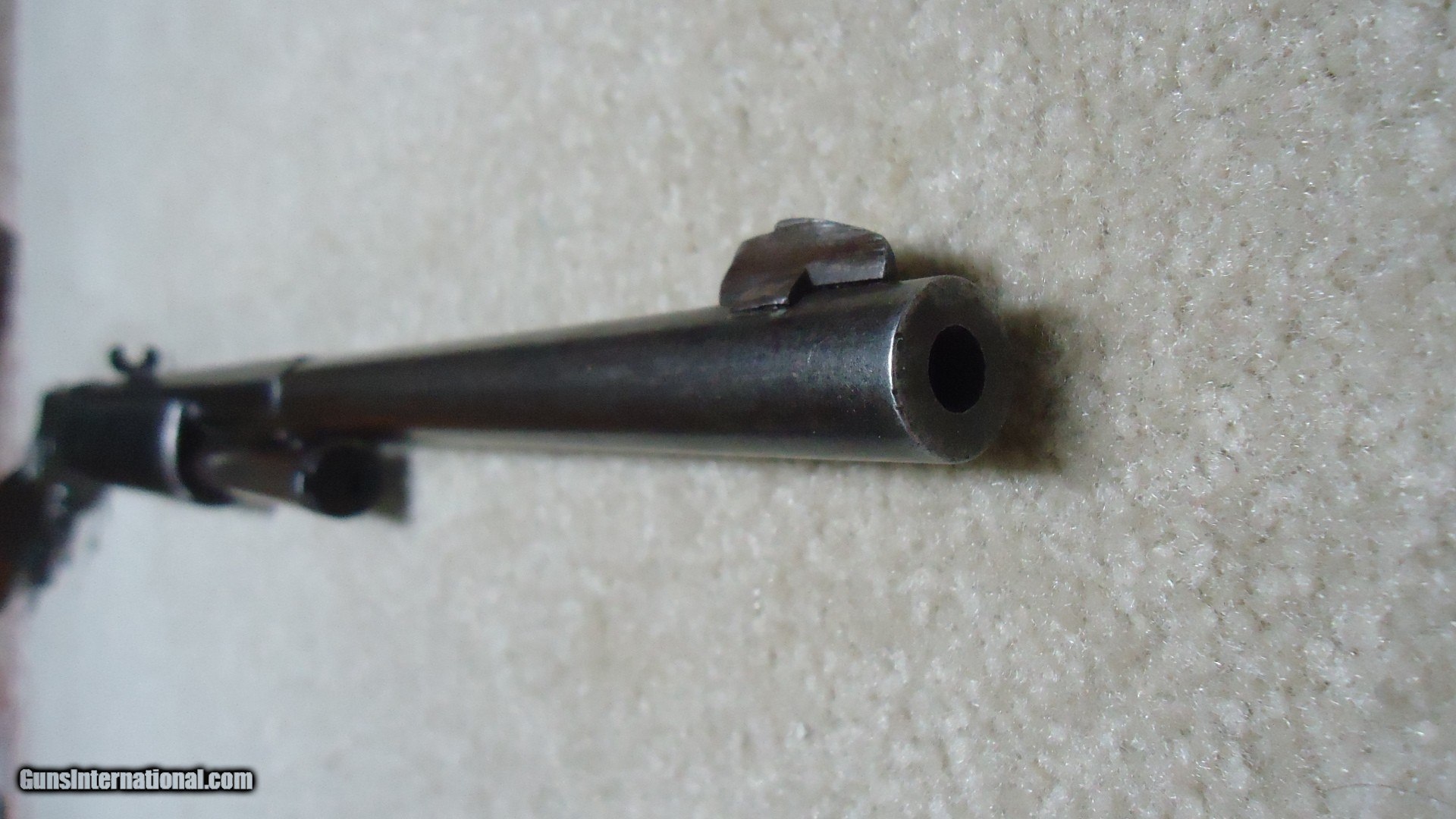 Description: ANTIQUE MARLIN 1893 FULL DELUXE TAKEDOWN RIFLE IN .30-30, #173XXX, MADE 1898. Well, that's the interesting part, but the rest isn't so great. This one has had a hard life The checkered fancy pistol grip walnut stock has been broken at the wrist and "frontier repaired" with some dowels and pins. Pistol grip checkering is heavily worn and the shotgun butt plate is a very worn hard rubber replacement. There is a sling swivel hole in the bottom of the stock. The forearm is solid with worn checkering and the forend cap has a sling swivel hole in the bottom. The walnut is an uncleaned very fancy burl that has never been cleaned. The barrel is 1/2 octagon with half magazine with the barrel cut to 21 inches. It is fitted with a buckhorn rear sight and blade front sight. I called this one in to the Cody Museum and the call-in sheet simply states: "Rifle, Caliber .30, 1/2 octagon, barrel length 26", pistol grip stock, takedown, shipped Oct. 19, 1898." The magazine does not appear cut. There are a couple of holes in the left side of the receiver from where there must have been a receiver sight or sidemount of some kind along with a wide notch cut in the rear of the receiver top that must have gone along with whatever sight was mounted at one time. Overall metal is an uncleaned gray/brown with some aged blue. Action works fine and the safety half-cock holds solidly. The bore is a bit dark, but quite decent! The ultimate "project gun" or just cool as it is! This one came out of here in Montana. I'm sure there are a load of adventures associated with this one! SOLD Antique: Yes Rifle Caliber: .30-30 Winchester Manufacturer: MARLIN Model: 1893 DELUXE Serial Number: 173XXX Barrel Length: 21 Condition: FAIR Bore Condition: VG |