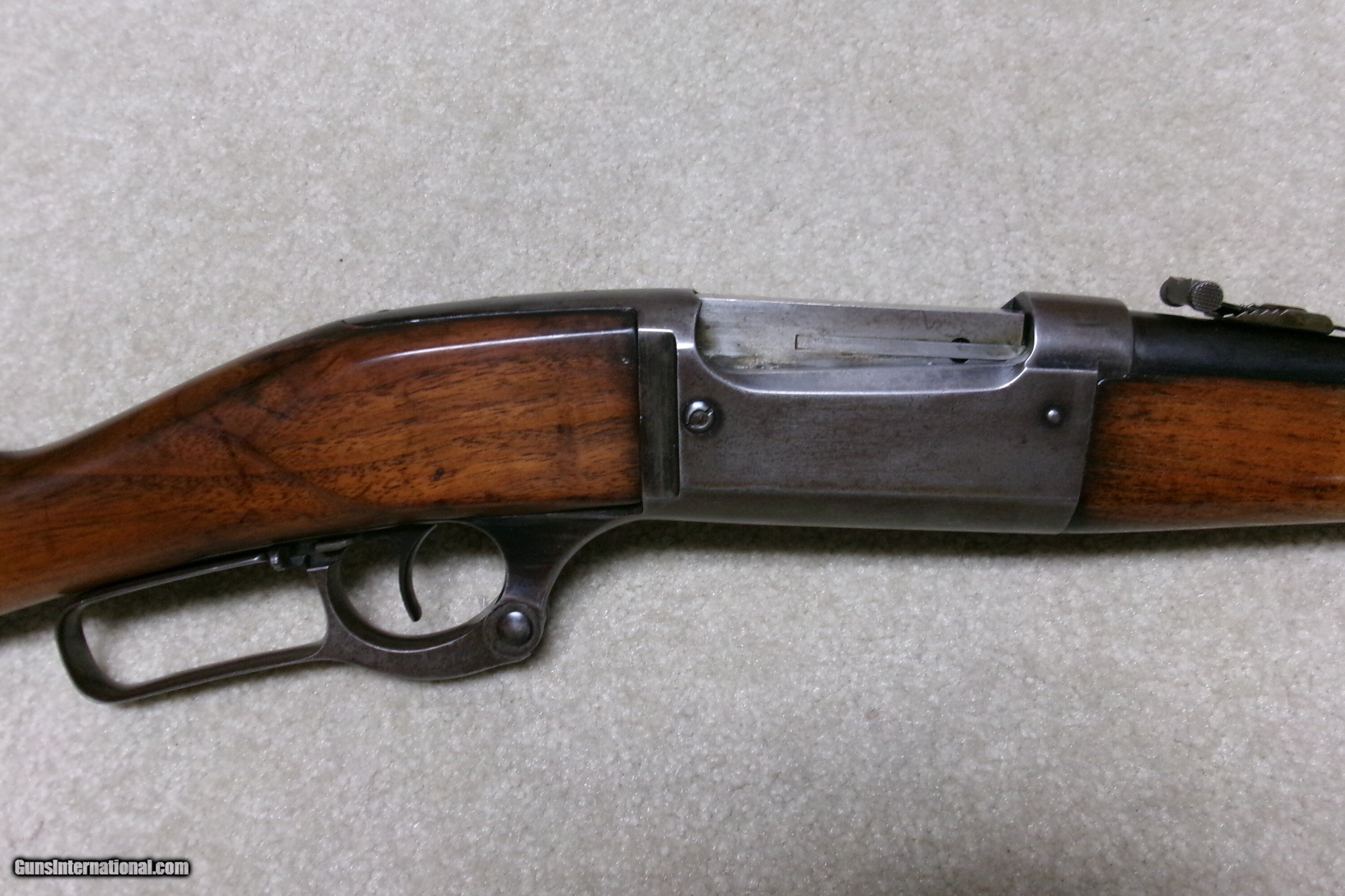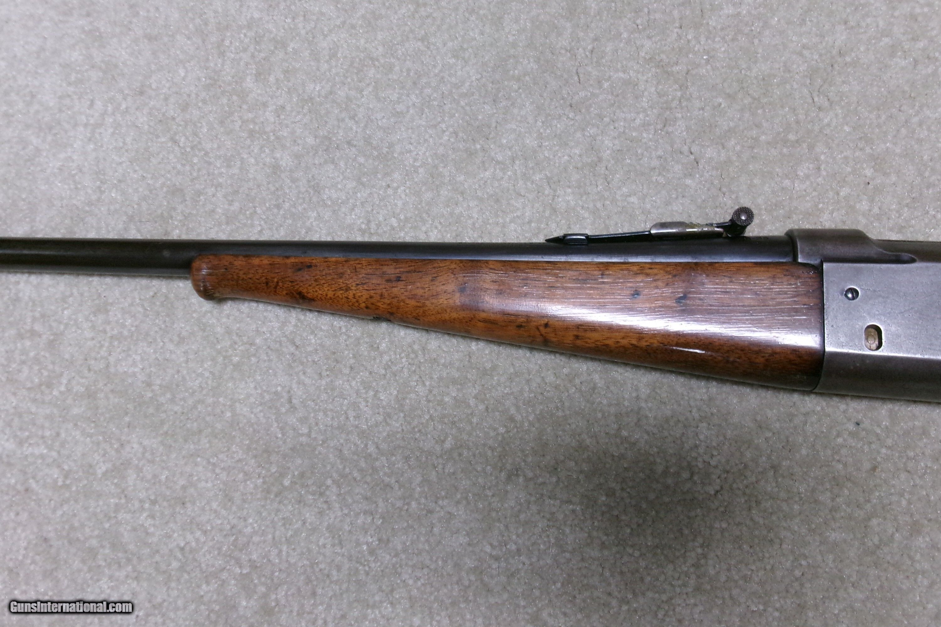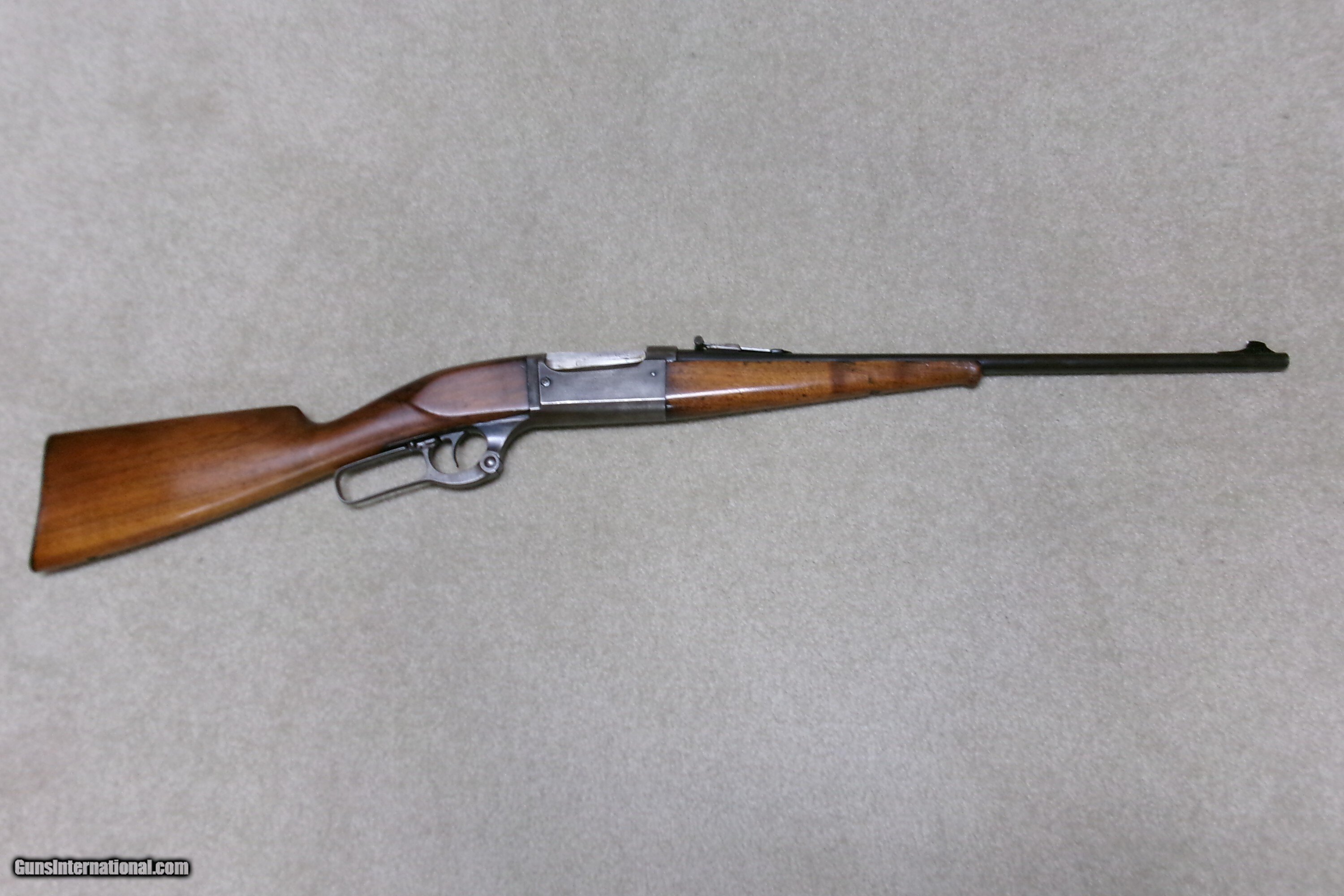 Description: EARLY TEXAS SHIPPED SAVAGE 1899 .25-35 FEATHERWEIGHT RIFLE. A call to the Cody Museum provided the info on this one: SAVAGE MODEL 1899- SERIAL NUMBER 95XXX; Caliber: 25/35; Barrel Type: Round; Featherweight; Date Accepted: November 27, 1908; Date Shipped: November 23, 1908 (I think they got these dates reversed); Sold to Walter Tips. (Call-in sheet from the Cody Museum included). Walter Tips was an arms dealer in Austin, Texas. A load of Colt Single Action Armies passed through his store. This is the first Savage 1899 I’ve even heard of going to him. No doubt, it was meant as a 20” saddle rifle, like the more popular Winchester carbines. This example shows good aged blue on the barrel. The rear sight is a later Savage buckhorn patent marked 1914 and has not only elevation adjustments but also windage adjustments. The front sight is a ramped Marble ivory bead and was probably put on when the rear sight was mounted. The receiver is mostly a dull gray/brown with some blue in the most protected area above the lever. The forearm is fine and the butt stock has the usual hairline cracks/replaced chip behind the upper tang. There is also an empty sling swivel hole in the butt stock- easily filled, left as is, or filled with a simple sling swivel. It retains the now-politically-incorrect Savage hard rubber butt plate with an Indian Chief embossed in the middle! (How times have changed!). The action is tight, the tab safety works correctly and the bore is a little worn and dark with one barely discernible shallow ring a couple inches from the muzzle. This rifle was shipped within two years of the turbulent Mexican Revolution of 1910-1920. A rare caliber and rare Texas destination shipped Savage Featherweight carbine! Curio/Relic: Yes Rifle Caliber: .25-35 Winchester Manufacturer: SAVAGE Model: 1899 FEATHERWEIGHT Serial Number: 95XXX Barrel Length: 20 Condition: VG Bore Condition: VG Price: $1,595.00 Contact Seller |