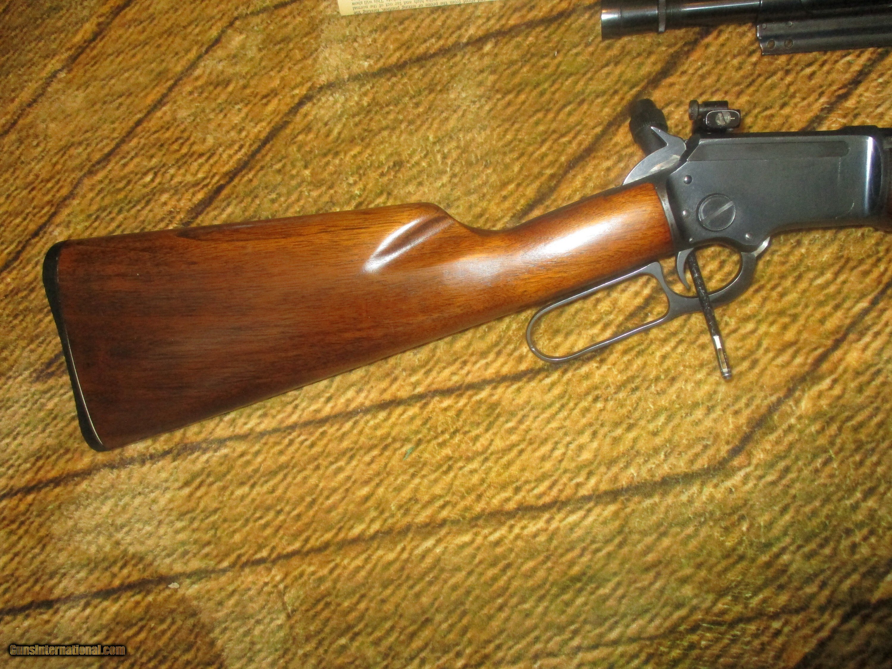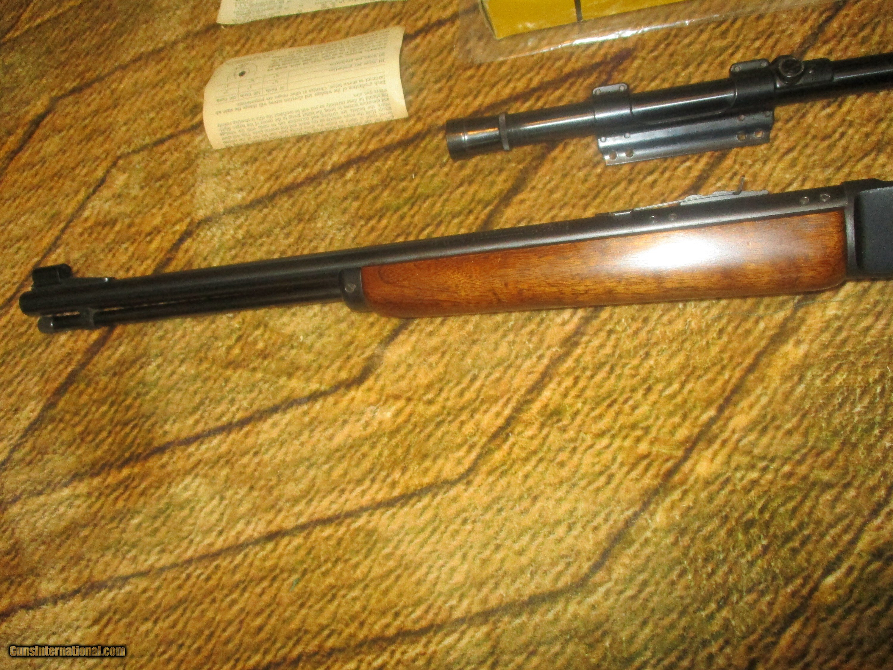 Description: 20" carbine med. wt. bbl., hooded blade front, open rear, factory drilled & tapped behind rear sight for Weaver 'N' mount w/5/8" rings, Brosky Marlin book pictured on pg. 289, with Weaver 'B4 steel tube as new in box scope, also 2 screw side mounted fully adjustable rear peep sight, American walnut straight stock, steel band forearm, factory buttplate, ( All this documinted in Marlin book by Brosky) 99% blue, just minute of handling only; otherwise, almost as new ( Mountie Carbine configuration)! + shiping & insurance Price: $1,095.00 Contact Seller |