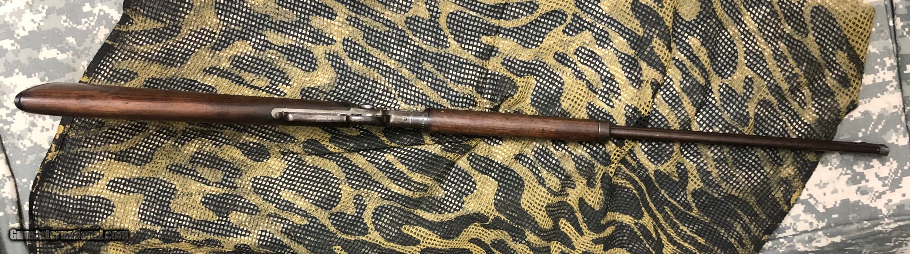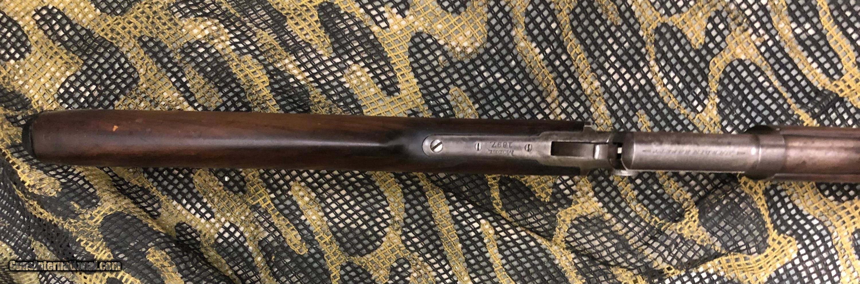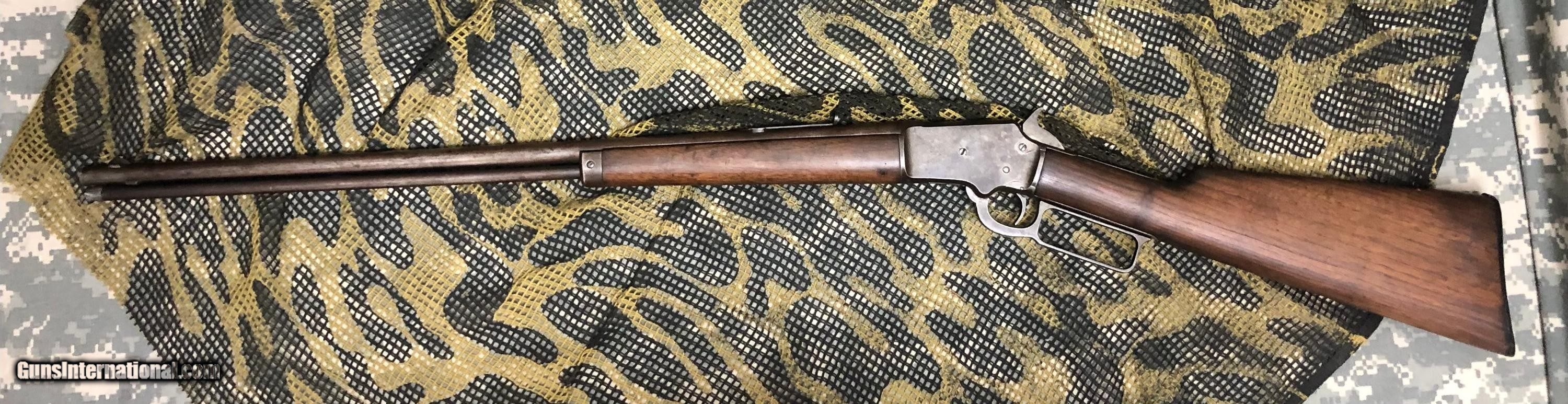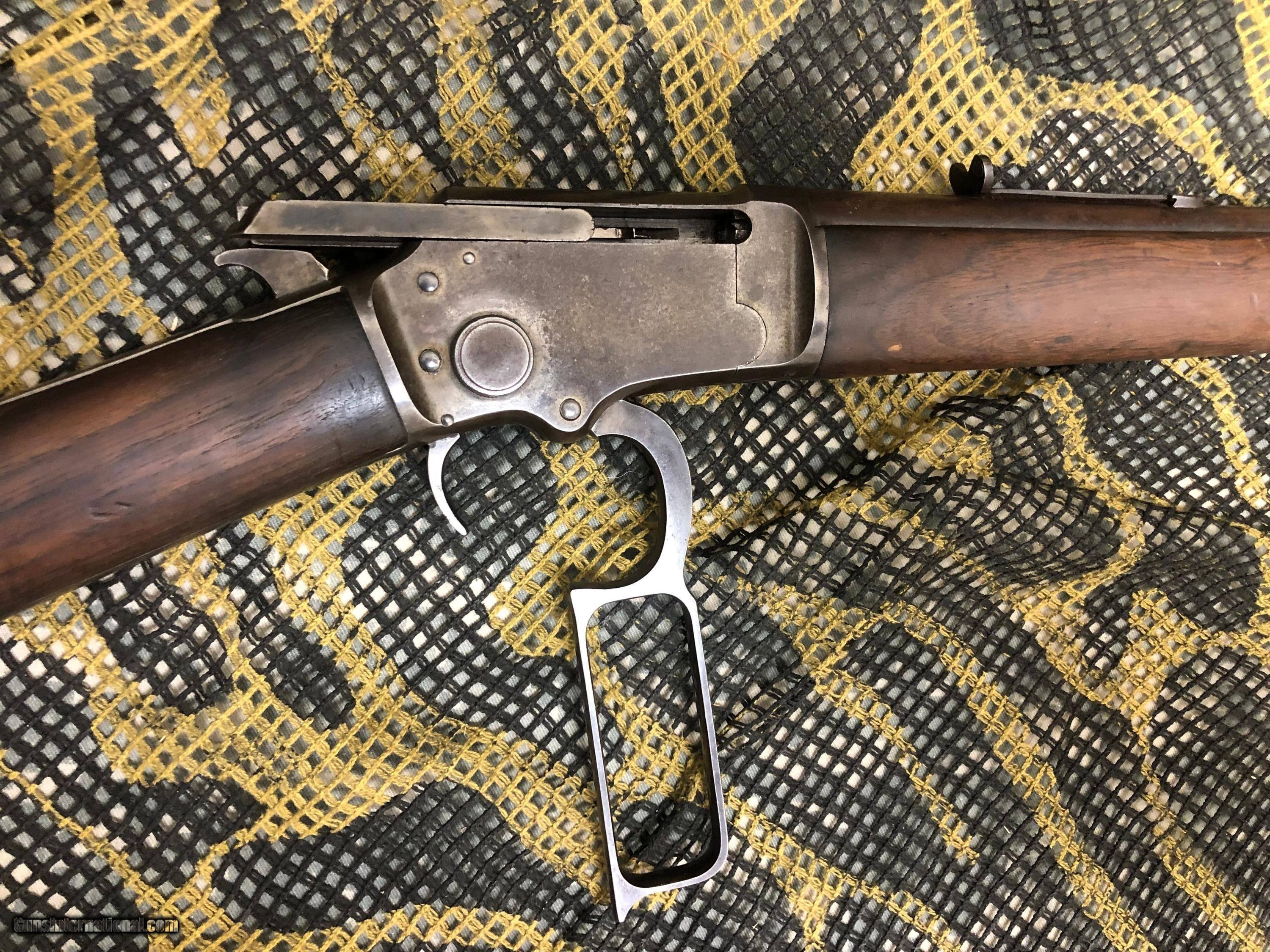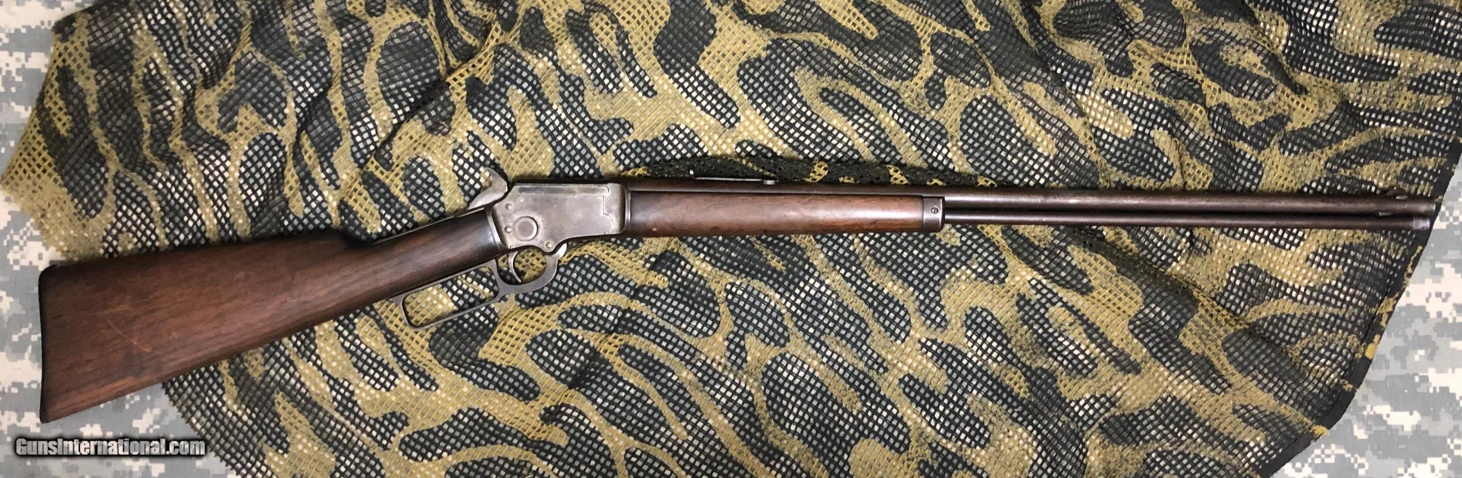 Description: Marlin Model 1897, manufactured in 1903. Take-down, lever action. Metal has uneven patina with many scratches and some light pitting near muzzle. Bore is shiny but dark with some pitting and scratches. Hammer has small notch filed below striking surface. Round top receiver, marked "MARLIN SAFETY", shows trace of case hardening color. Wood is Antique Good with scratches and dents expcect of a rifle this old, factory butt plate is slightly oversize indicating some sanding/refinishing. Plastic butt plate with Marlin logo. Rear sight is semi-buckhorn (missing stepped elevator); tang is drilled and tapped for tang sight. Front sight is 1/16" blade with inset ivory , drift adjustable for windage. Magazine tube has evidence of repaired damage (see photos) and is stiff to open but fully functional. Please include 7.5% Sales Tax. Price reflects 3% cash discount. For credit card purchases, add 3% for loss of the discount. $50 for our standard shipping, add $20 for shipment in plastic gun case (used), add $20 for insurance. SOLD Rifle Caliber: .22 Long Rifle, .22 Short, .22 Long Manufacturer: Marlin Model: 1897 Serial Number: 269090 Barrel Length: 24 Condition: Antique Good Metal Condition: Antique Fair Wood Condition: Antique Good Bore Condition: dark and shiny, some pitting and scratches Barrels: round, 24 inch Action: Lever Sights: Rear: semi-buckhorn (missing elevator). Front: 1/16" blade with inset ivory bead. Manufacture Date: 1903 |