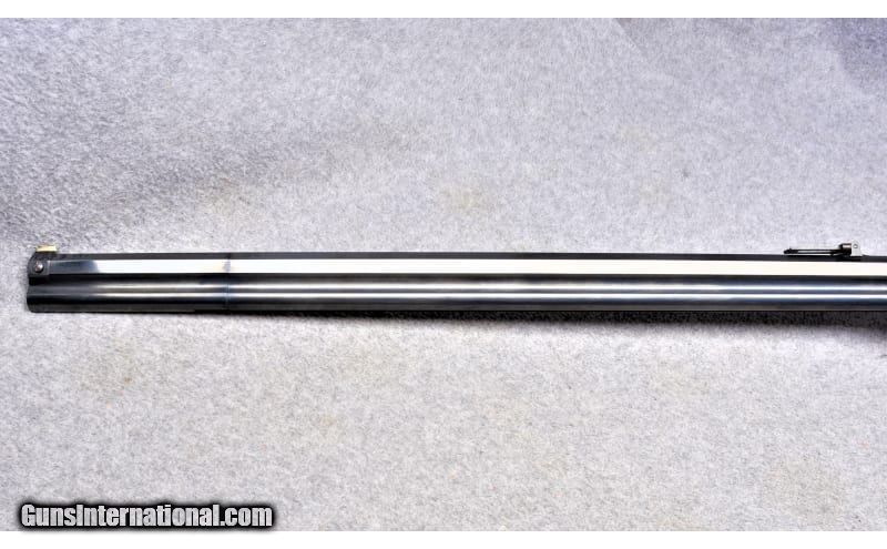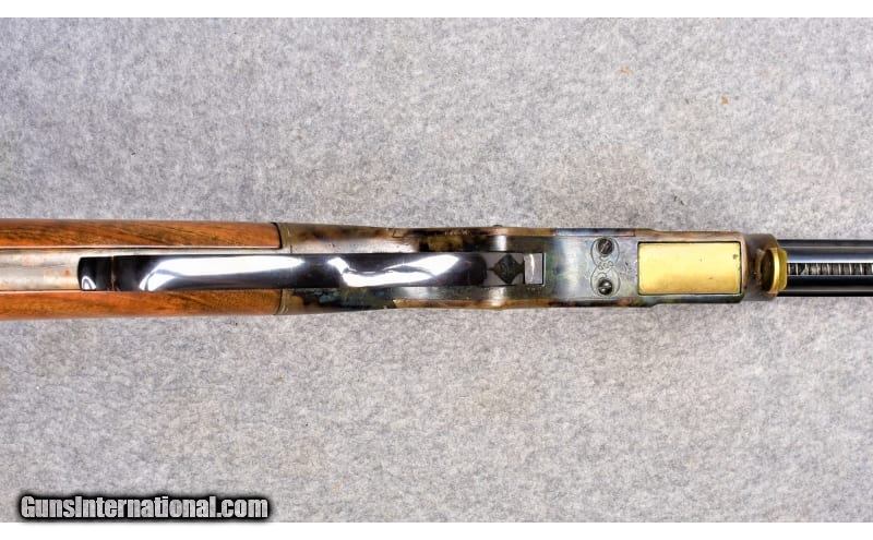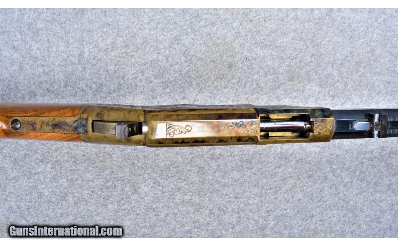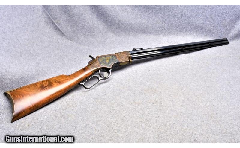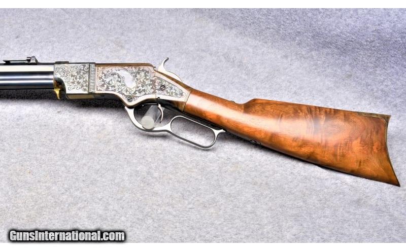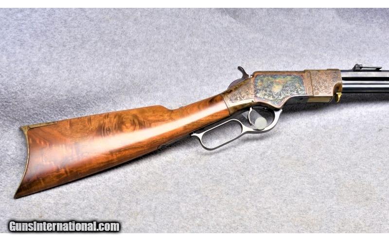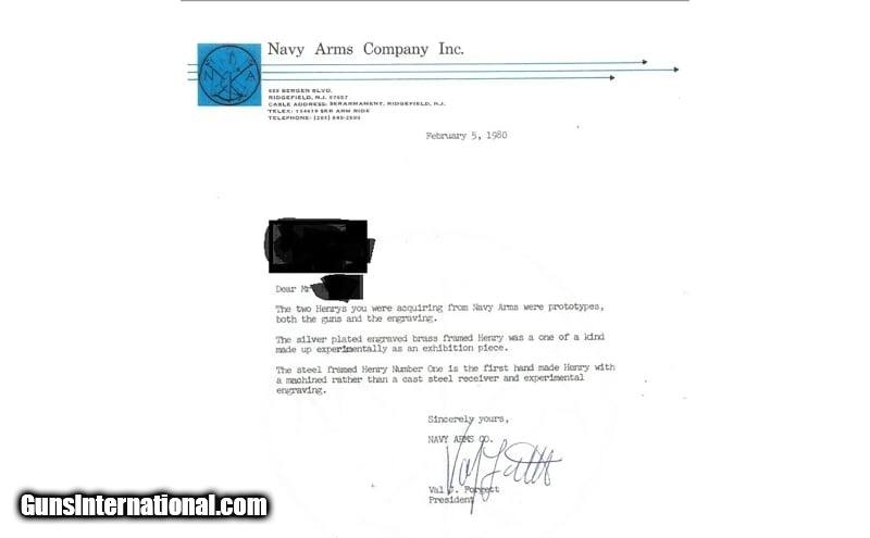 Description: Navy Arms made this prototype rifle with New Haven Arms Winchester replica blank with features and upgrades unique to Navy Arms guns. These improvements include deluxe American walnut stocks, full octagonal barrels, a machined receiver and experimental engraving. Navy Arms received these guns from Winchester without finish on the metal. The receiver and all furniture are then bone color case-hardened and the barrels blued. This firearm is serial number 1. .44-40 Winchester SOLD Metal Condition: "Excellent, Engraved Steel Frame Wood Condition: Excellent Bore Condition: Bright and Shiny Barrels: Octagon Stock Dimensions: 13" LOP Butt Pad: "Steel, Engraved Weight: 8.85 lbs Item Location: Reno |
