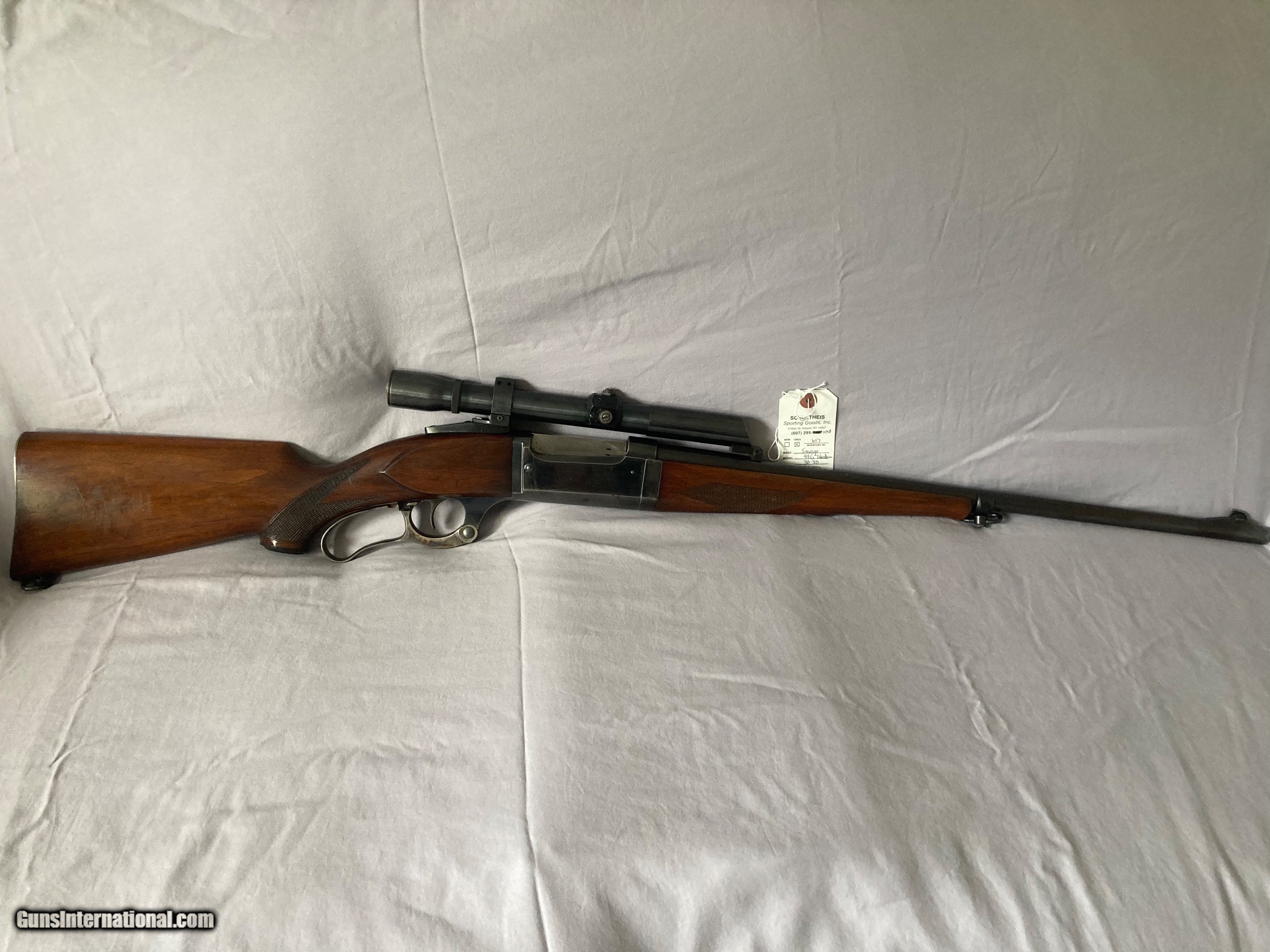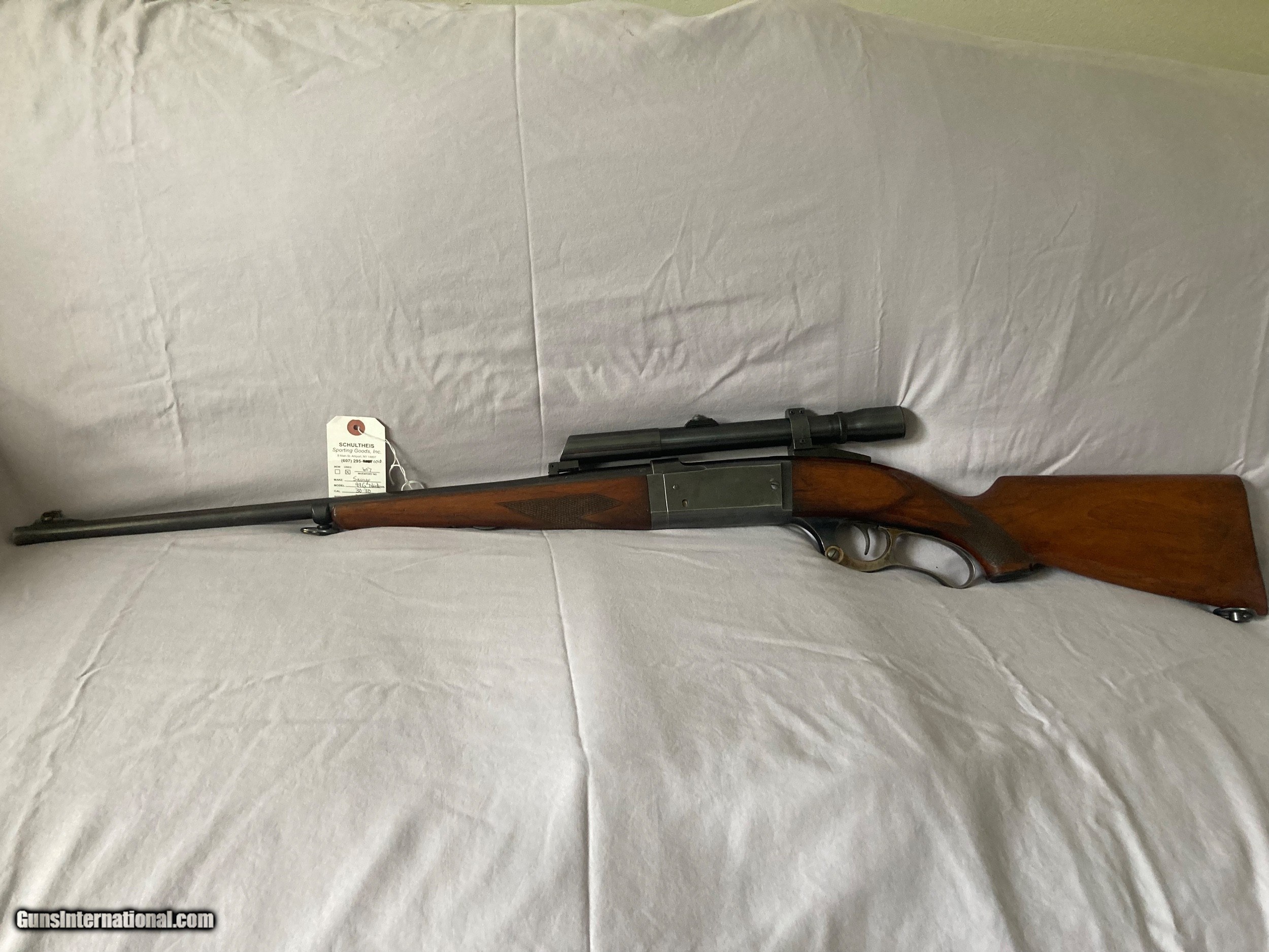 Description: Savage Model 99G Takedown, 30-30, serial #306XXX, 1928 mfg, 22" barrel, factory checkered wood and capped pistol grip, excellent bore and wood, 80% high luster blue, the rifle has a vintage Weaver one inch scope on Stith mounts using the rear sight slot and peep sight tang holes, also a vintage barrel band and stock swivel, a clean old rifle with original wood varnish, slight blue thinning on bottom of receiver and nice case color on the lever. ($50.00 shipping) SOLD |