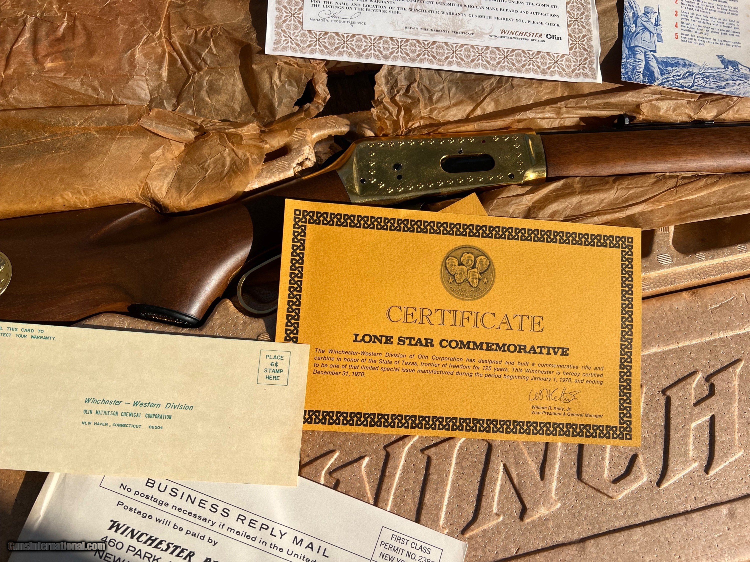 Museum-quality Winchester Model 94 Lone Star Commemorative chambered in .30-30 Winchester. This rifle is NEW IN BOX, unfired, and has been carefully stored for over 30 years. It includes all original paperwork, certificates, and the original factory box — a level of completeness rarely seen today.