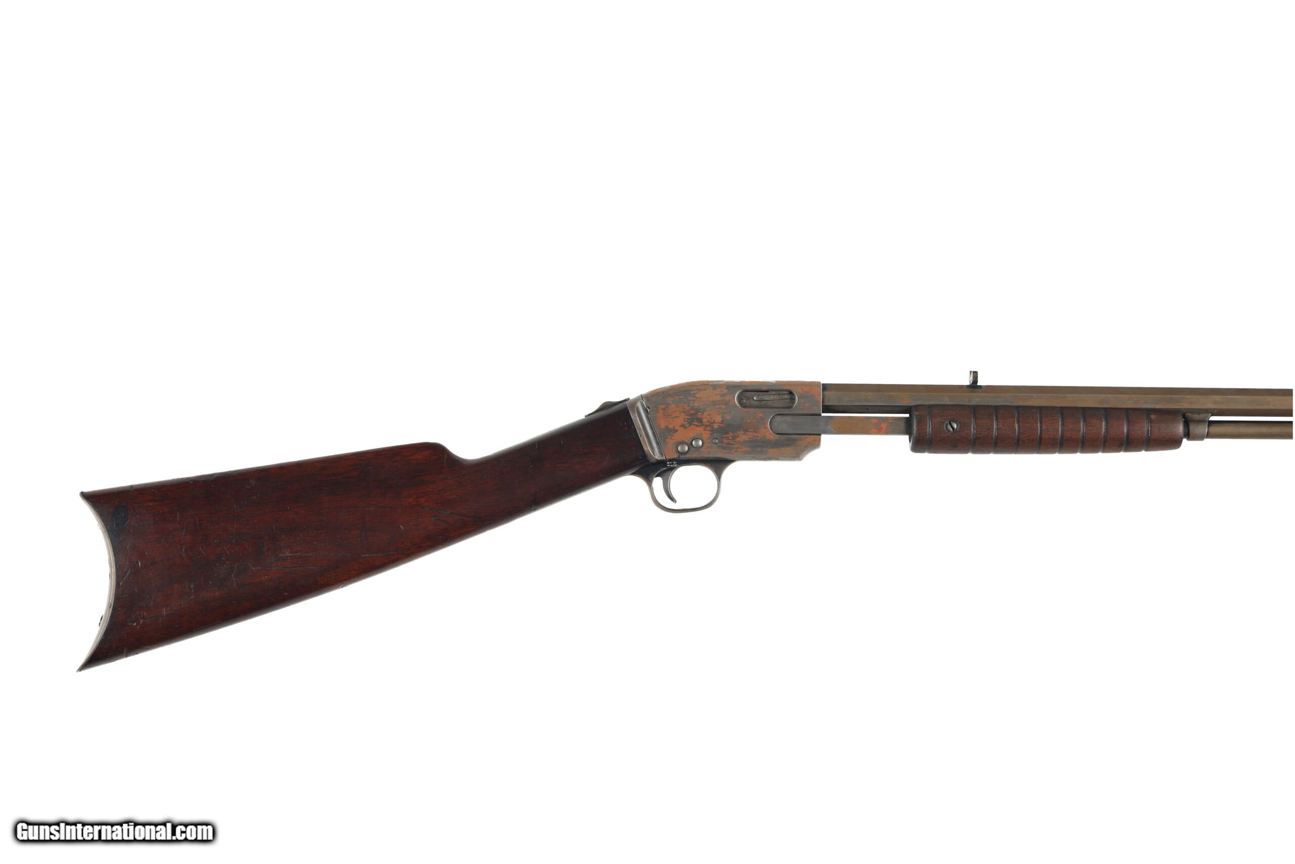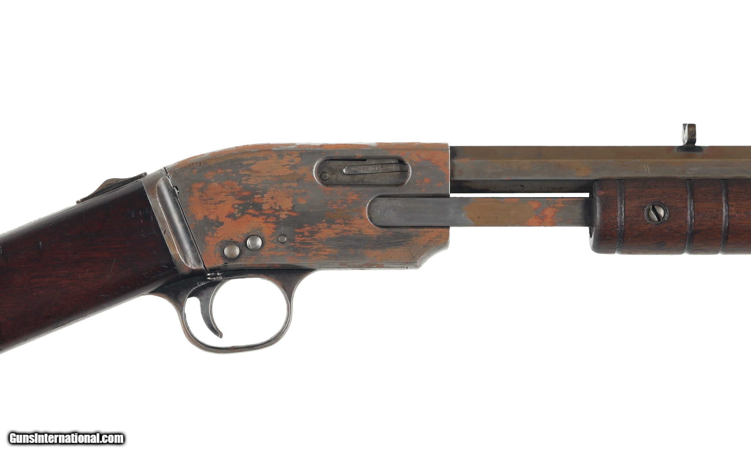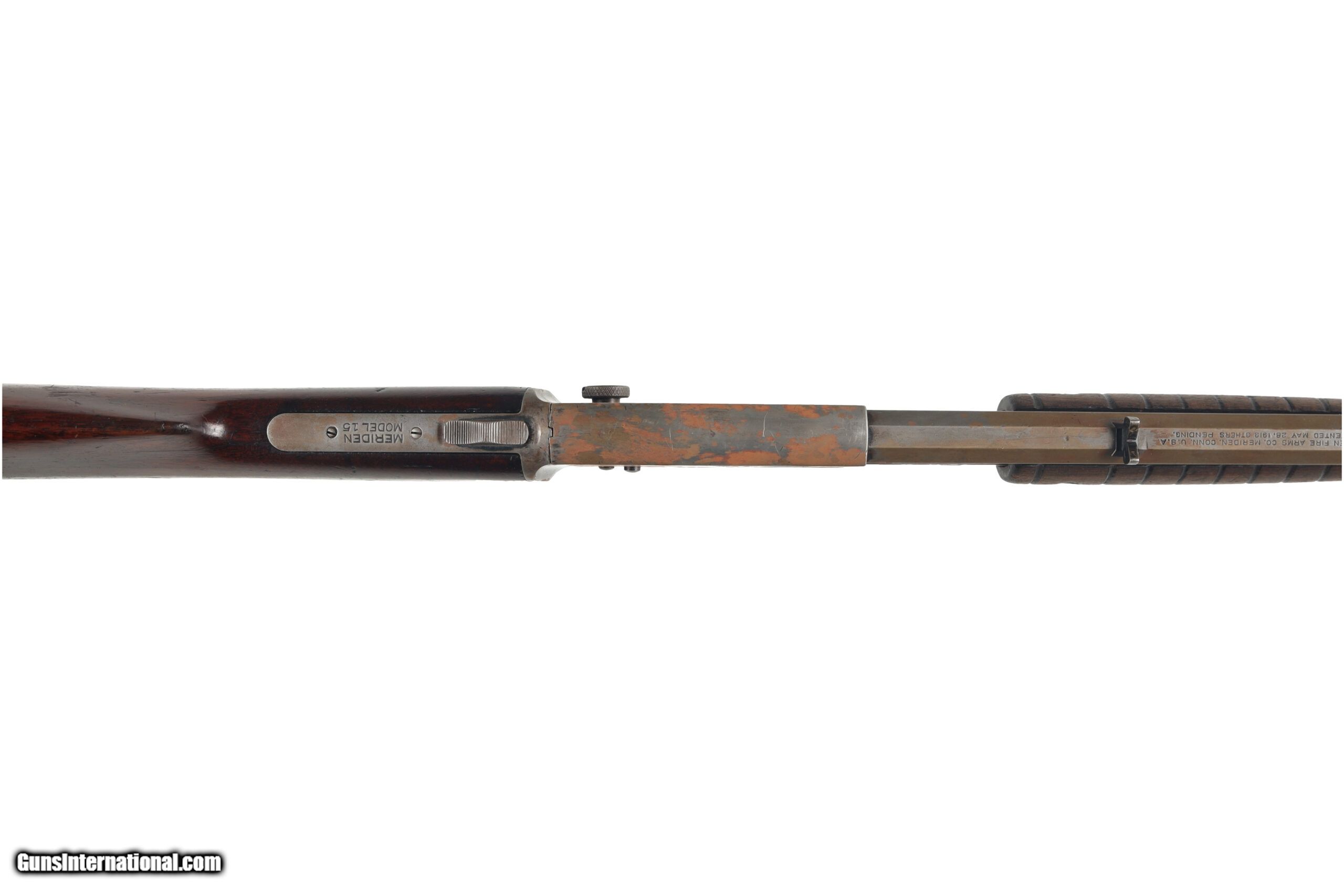 Description: Meriden Firearms Co. ran from 1905 to 1918 and produced a variety of firearms, from revolvers to shotguns and rifles. Their Model 15 was a pump action .22 rimfire bearing similarities to contemporary Remington and Savage designs. This example is in poor to fair condition, missing almost all of its original finish and with a number of replacement parts. replacement parts include the sights and the trigger pin, which appears to be replaced with staples. The boor condition also appears somewhat pitted, and has a peened breech from excessive dry firing. Manufactured in: USA Hand: Right Hand Barrel Length: 24 Inches Barrel Condition: Fair Stock Finish: Original Stock Condition: Good Type of Butt: Crescent Buttplate Grip: Straight Grip Forend: Ribbed SOLD Curio/Relic: Yes Manufacturer: Meriden Model: Model 15 Caliber Info: .22 S, L, LR Condition: Preowned Metal Condition: Fair Action: Pump Action Triggers: Single Fore End: Ribbed LOP: 12 7/8 Weight: 5.2 lbs Case: NONE |