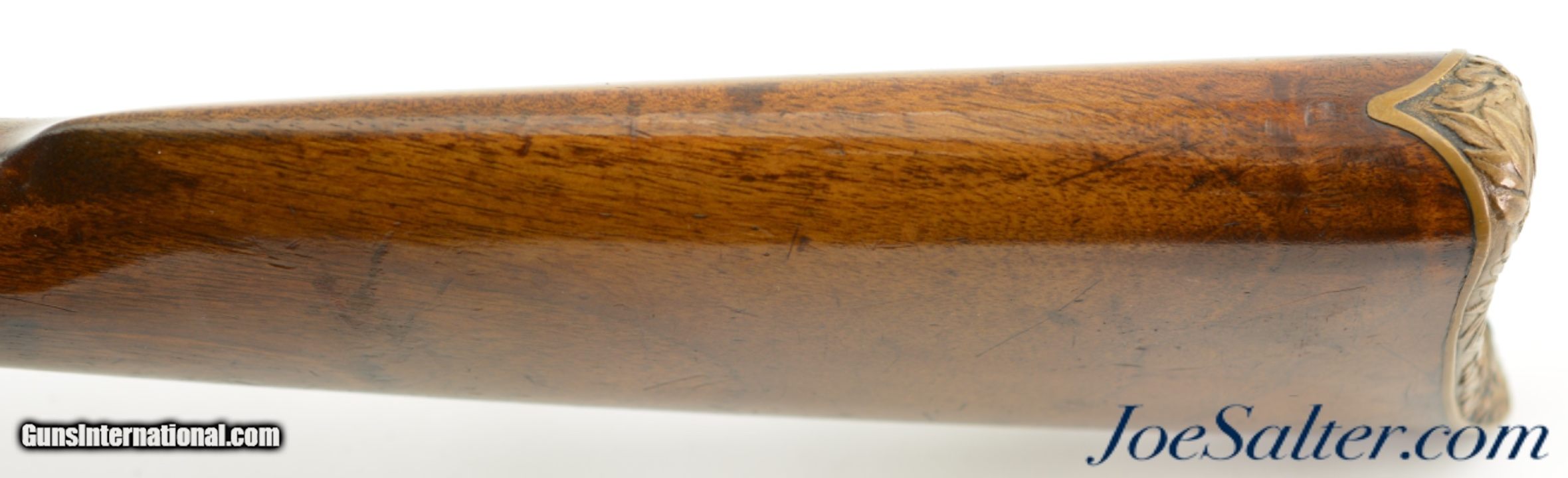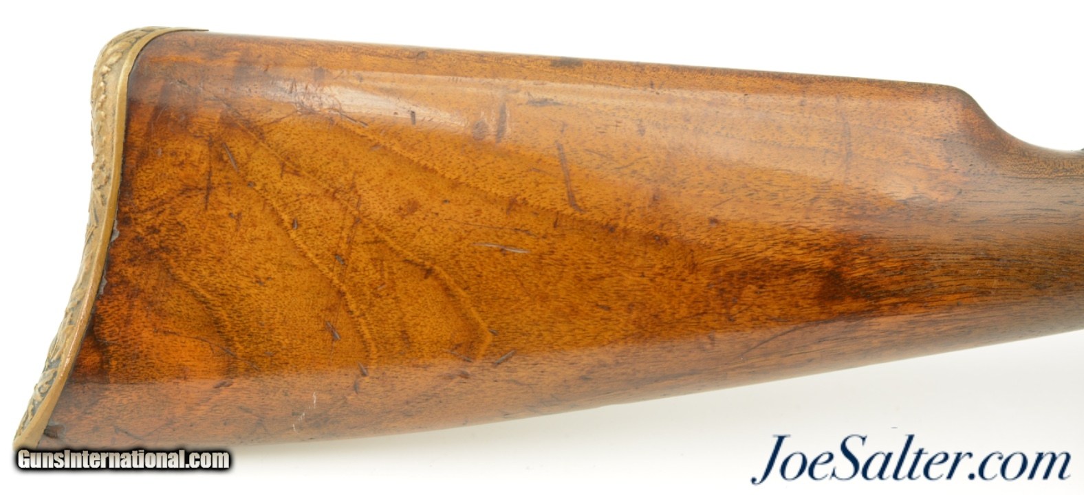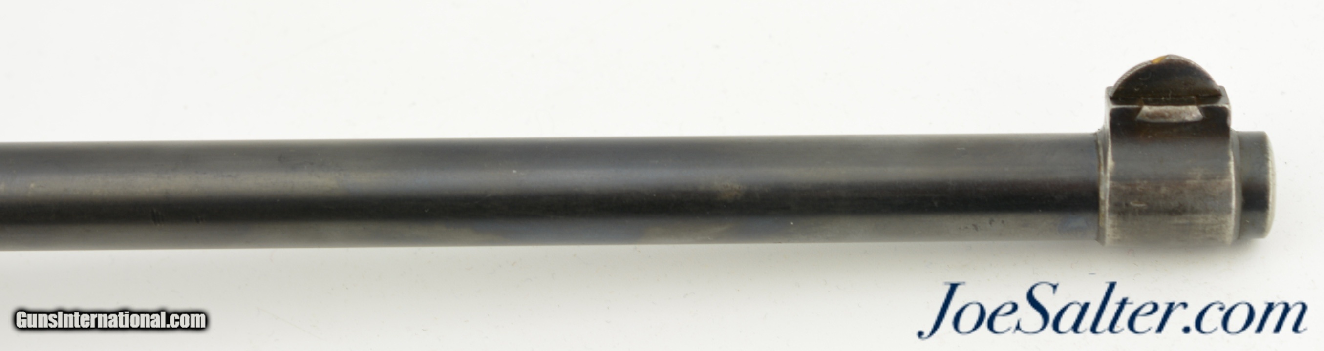 Description: Serial #1129, .25 Rem., 22" barrel with a fine, bright bore that has traces of mild freckling within the grooves. This is the simplified, slide-action only variant of the Model G slide/autoloading rifle made by Standard Arms Co. of Wilmington, DE prior to WW1. This is a well-preserved example that has retained 80-85% of the original blue finish blending that has light gray fading at the muzzle, along the high edges, and on the bearing surfaces. Additionally, the barrel collar appears to have been polished bright at some point. The relief-stamped brass slide has a mottled ochre-brown patina which repeats on the original "S /A / C / o" stamped brass buttplate. The walnut buttstock has some small handling marks and blemishes scattered about the original varnish. The action is fully functional, and the rifle rates very good-near fine overall. FFL or C&R SOLD Curio/Relic: Yes |