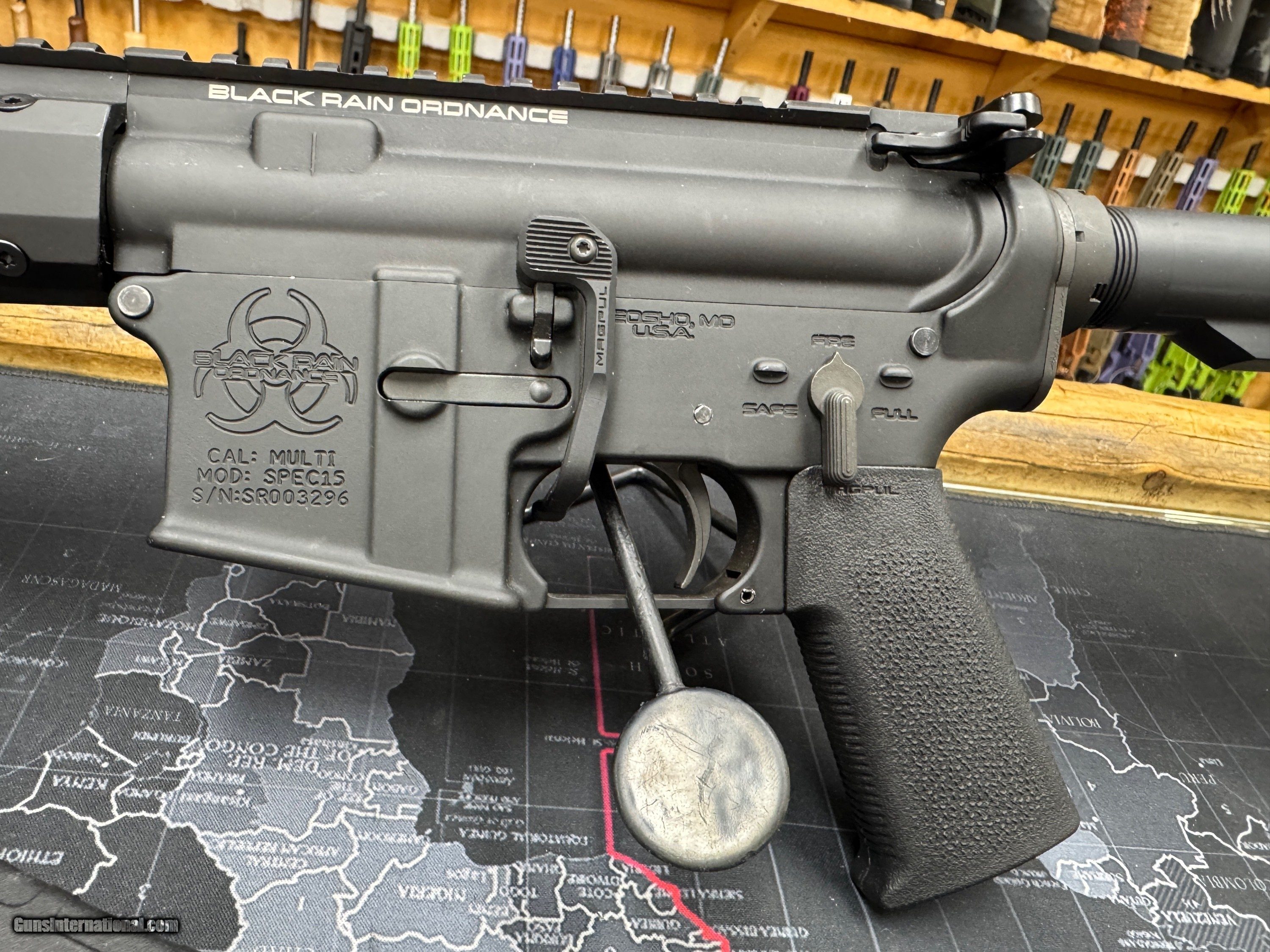 Description: This is a Very Good used rifle. It has a 16" barrel and Magpul stock and grip and a Bad Lever. It has a BCM fore grip and quick detach adapter. It comes with one magazine. The barrel and bore look good. Rifle Caliber: 5.56x45mm NATO Manufacturer: Black Rain Ordnance Model: SPEC15 Serial Number: SR003296 Barrel Length: 16 Condition: Very Good Price: $699.99 Shipping: $35.00 Contact Seller |