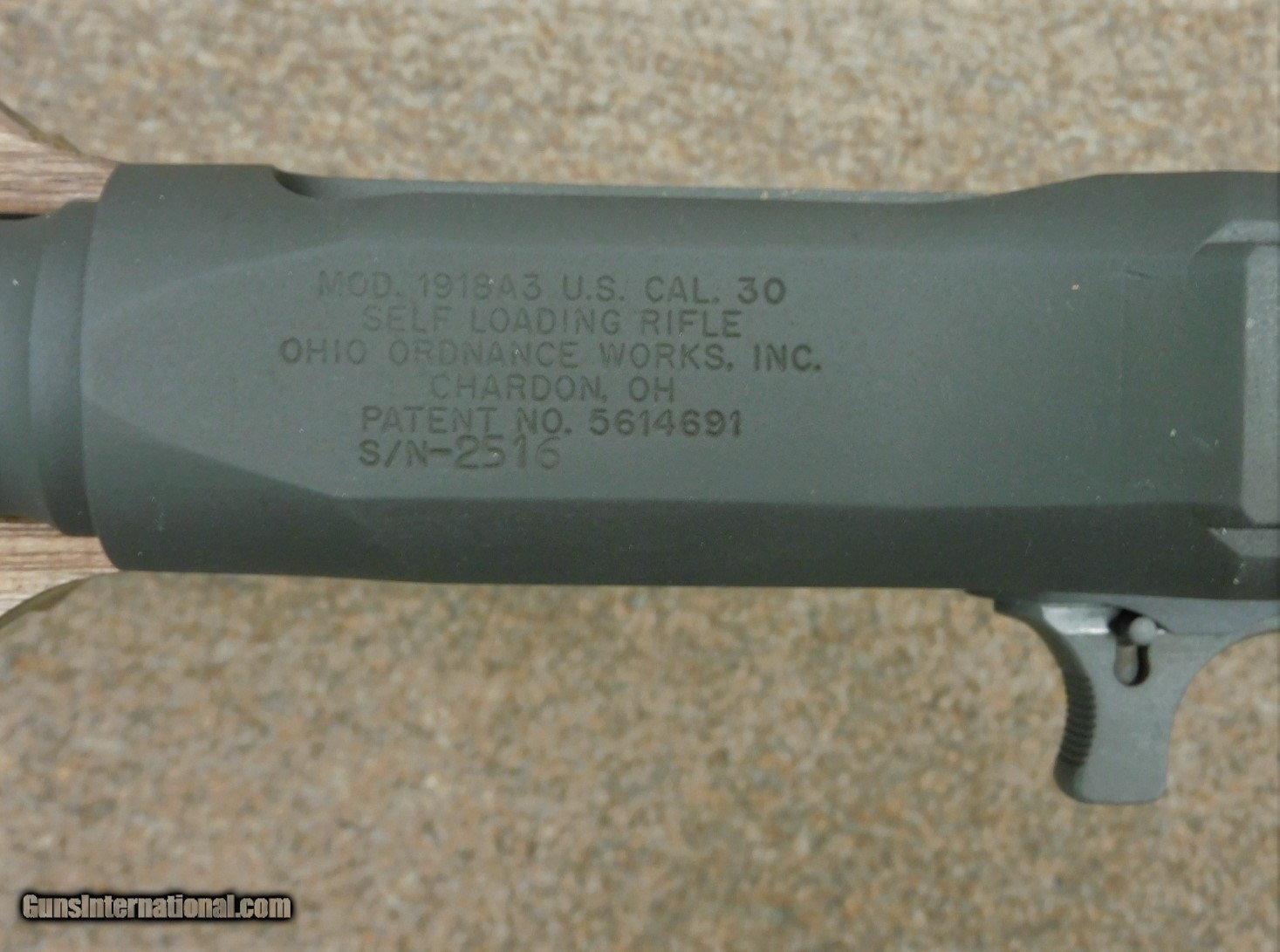 Description: Pristine Ohio Ordnance 1918 A3 BAR Semi-Automatic .30-06, MFG approximately 2010, 24" bbl, bright shiny bore, good rifling, Parkerized finish, Leaf type rear sight with open U-notch battle sight, peep aperture adjustable for windage and elevation from 100 -1500 yards; reverse ramp type front sight blade with protective hood, smooth Walnut butt stock - forearm, bi-pod, metal butt plate, sling loops,sling, bolt hold open, cleaning kit, owner manual, and eight 20 round magazines. This is a copy of the famous Browning 1918 A3 BAR rifle. At the time of manufacture this rifle was manufactured with some of the original USGI WWI and WWII parts! Add 3% for Credit Card ----------------------------------------------------------------------------------------------------- Shipping: Actual shipping costs will be charged at the time of sale. ------------------------------------------------------------------------------------------------------ From the manufacturer : (2017) Weapon Specifications: Caliber .30-06, Finish Phosphate, Operation Locked breech, gas operated with three position regulator, semiautomatic, closed bolt, hammer fired, two position selector lever, feed mechanism 20rd., staggered column, detachable bolt type mag, weight 19.4 pounds, length overall 47.8 inches with flash hider, barrel length 24 inches, Leaf type rear sight with open U-notch battle sight, peep aperture adjustable for windage and elevation from 100 -1500 yards; reverse ramp type front sight blade with protective hood, muzzle thread .670-28. History The Browning Automatic Rifle (BAR) model 1918 was developed by John M. Browning in 1917. Marlin-Rockwell Corporation, Colt, and Winchester made 85,000 rifles during WWI to meet the US military requirement. Ohio Ordnance Works, Inc. manufactures a semi-automatic version of this rifle; 1918A3-SLR (WWII version). The only one of it’s kind in production anywhere in the world, it is manufactured with some of the original USGI WWI and WWII parts. For the last 15 years we have taken great care in the building of each rifle. Only the highest quality Ohio Ordnance new manufacture and USGI standard parts are used in its production. The heart of the 1918A3 is the receiver made from an 8620 steel casting that has been carburized and induction heat treated. The castings are machined on state-of-the-art, CNC machining centers. Every rifle is fully assembled, inspected, test-fired and re-inspected under the direct supervision of our master armorer. The entire manufacturing process is accomplished at our facility in Chardon, Ohio. Our team is made up of experts in the military ordnance field, with a combined 100 plus years experience in the trade. SOLD |