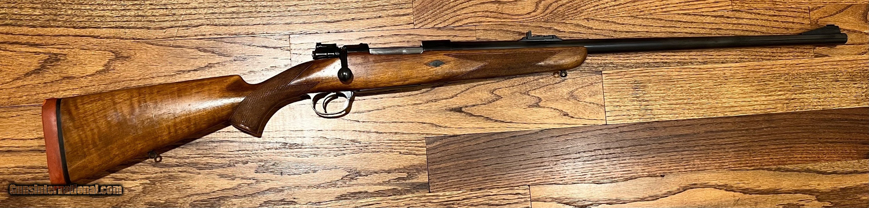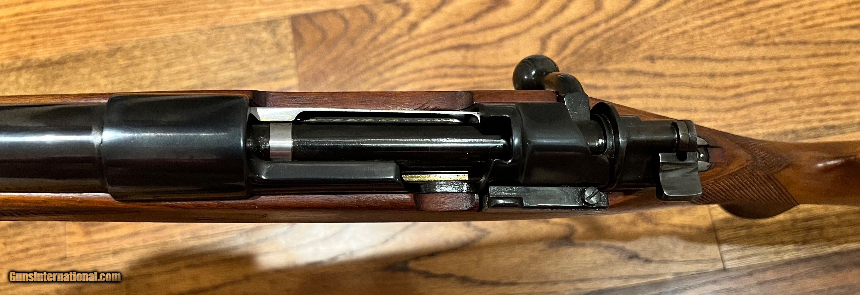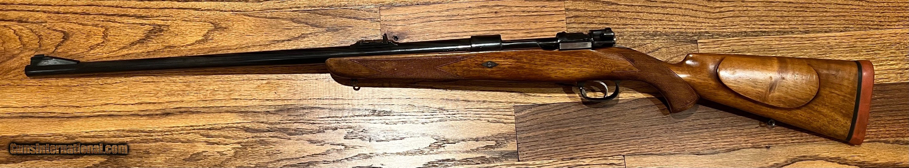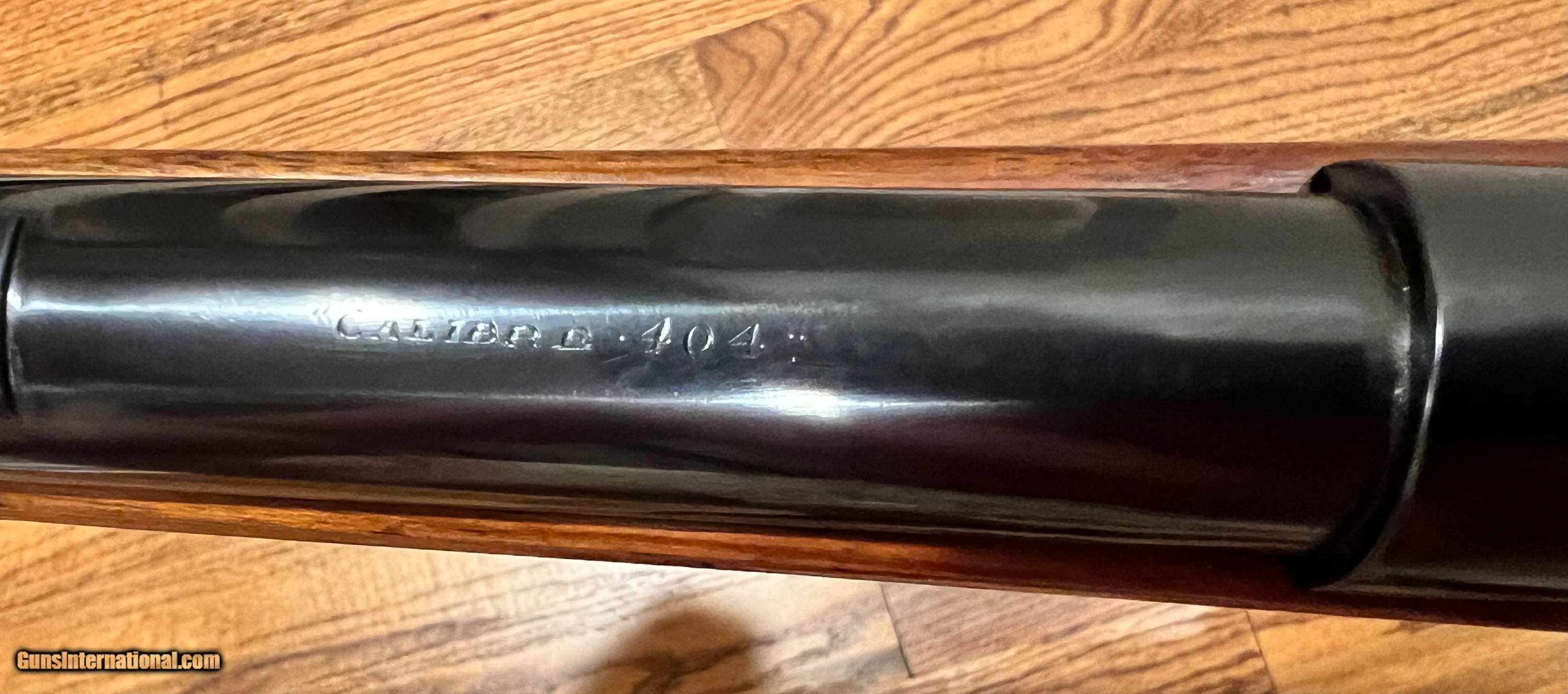 Description: Cogswell & Harrison 404 Jeffery Mauser action sporting rifle. 26" barrel with one folding and two standing express sights (100,200,300 yards) and ramp front sight with bead insert. Excellent as new bore Bolt face appears to be unfired Classic English express rifle stock with perfect checkering and minor storage marks. Original silvers pad in great condition Drop box magazine LOP 14 1/2 8lbs 3oz High quality London made English express rifle chambered in the classic 404 Jeffery, this rifle handles and points like a fine English shotgun. The rifle is in excellent condition and appears to be unfired with minor storage marks. SOLD Curio/Relic: Yes Rifle Caliber: .404 Jeffery |