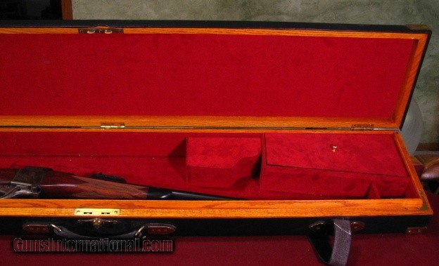 Description: Jefferey style Farquarson .375 H&H Flanged Magnum stocked by Bruce Dawson of West Plains, Missouri. 24 3/4" barrel with banded ramp front sight, banded sling stud, and island rear sight with one standing and three folding leaves. Color case hardened receiver with tang safety. Stocked in a very well layed out and attractive piece of English Walnut with excellent grain flow through the wrist. Pancake shadow line cheekpiece, steel pistol grip cap, and point pattern checkering. LOP is 14" Weighs in at 8lb 5oz This piece is new from the maker and cased in an FEI brass cornered oak and leather trunk case with key, also in very nice condition. This is a modern piece with vintage character! SOLD |
