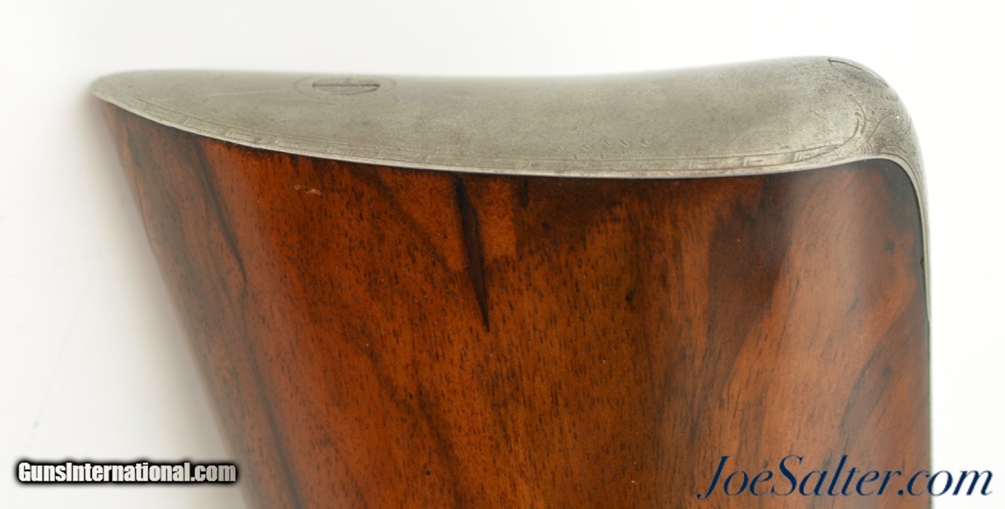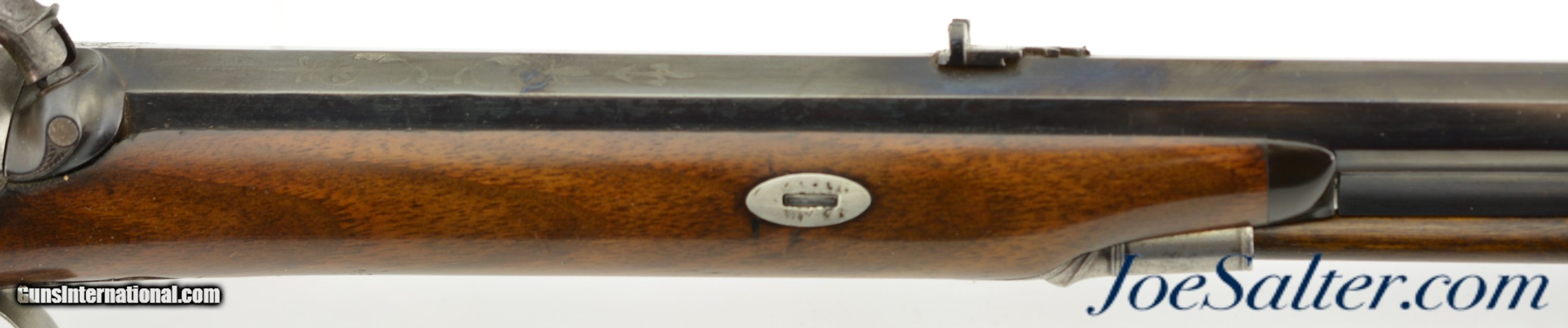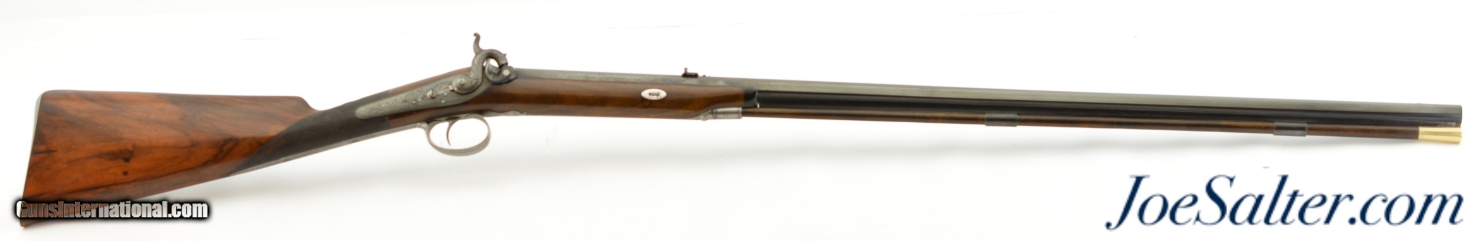 Description: NSN, .54 Caliber, 32 1/2" octagon barrel with a good bore that has moderate pitting within the grooves. This is a very handsome rifle with diminutive proportions, suitable for a youth or lady. The barrel and ramrod guide rib have nearly all of a later added blue finish remaining, with the original silver inlays at the breech tarnished to a blue-black patina. The original owner’s name is inlaid along the top flat: "Adam Kuchenreuter." The back-action lock has a tropical game scene vignette, with a stag’s head next to the percussion bolster, a leopard on the trigger guard bow, intricate foliate engraving on the other metal surfaces, and an excellently engraved dolphin hammer. The lock functions flawlessly, and is equipped with a sliding safety that engages at half-cock. The stock is nicely figured walnut, with a checkered wrist, and plain German silver wedge escutcheons. The wood has some minor handling marks scattered about, and a hardly noticeable repair at the toe. A modern brass-tipped ramrod is included. William MacLauchlan (McLauchlan) was an Edinburgh maker who was in business from ca. 1806 & ca. 1847. This example of his work is in fine condition, and would make a great addition to any collection. Antique SOLD |