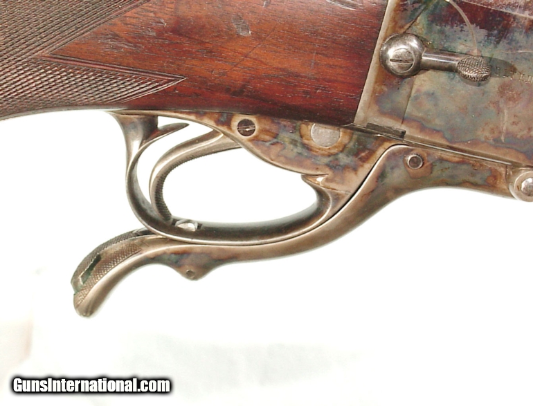 Description: .450- 3 1/4" express caliber, 33" barrel marked "METFORD 1611 GEORGE GIBBS, 39 CORN STREET, BRISTOL". Case hardened falling block Farquharson action with maker's name engraved on the left side. Full length walnut forend and pistol grip buttstock ending with a checkered steel buttplate. Special military ladder sight with spirit level. In fabulous original condition with the barrel retaining all of the original blue, lovely case colors and mint bore. Excellent figured wood and crisp checkering. Very Very rare. SOLD Antique: Yes |