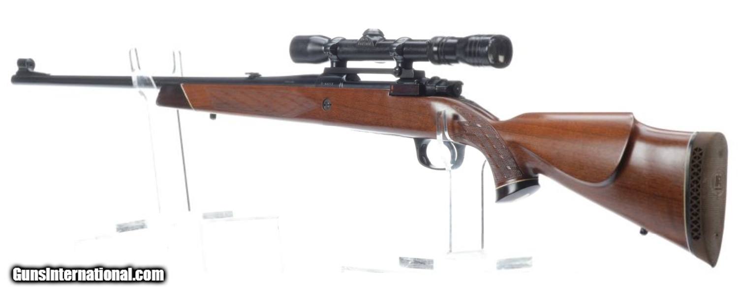 Description: As new, appears to be unfired. Side safety trigger, 24" barrel, 14" pull thru factory PH logo pad, stock bolt, rosewood tip and cap w ?bone inlay. Cast game scene bottom metal w wild sheep head. W Redfield one piece base and rings, scope in photo listed separately. Great big game caliber for a recoil-sensitive person, outpunches the bore size w excellent penetration due to long bullet. 7lbs without scope. SOLD |