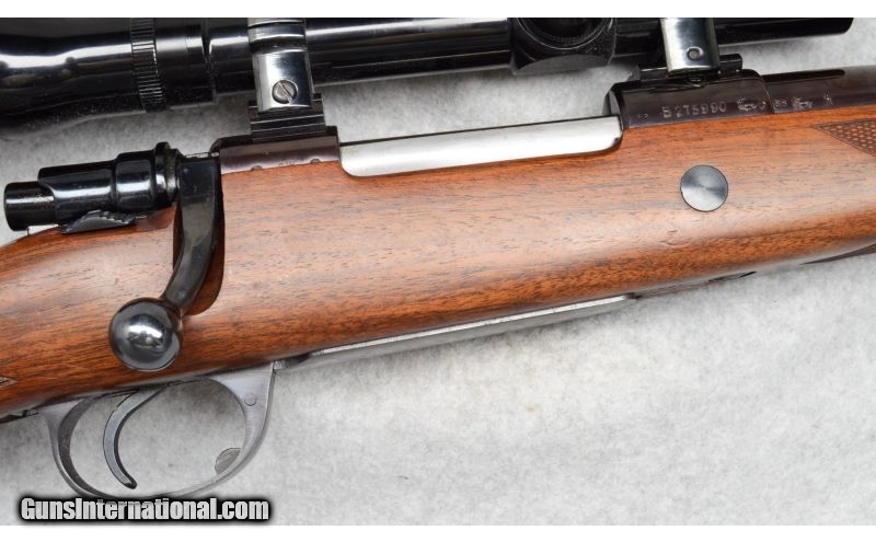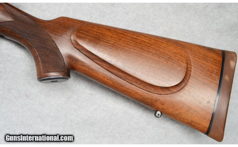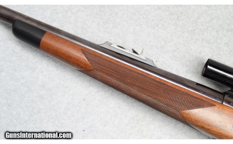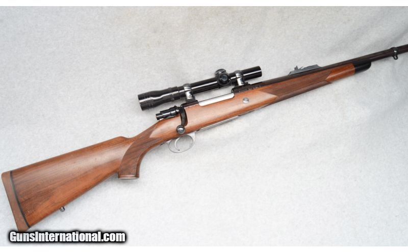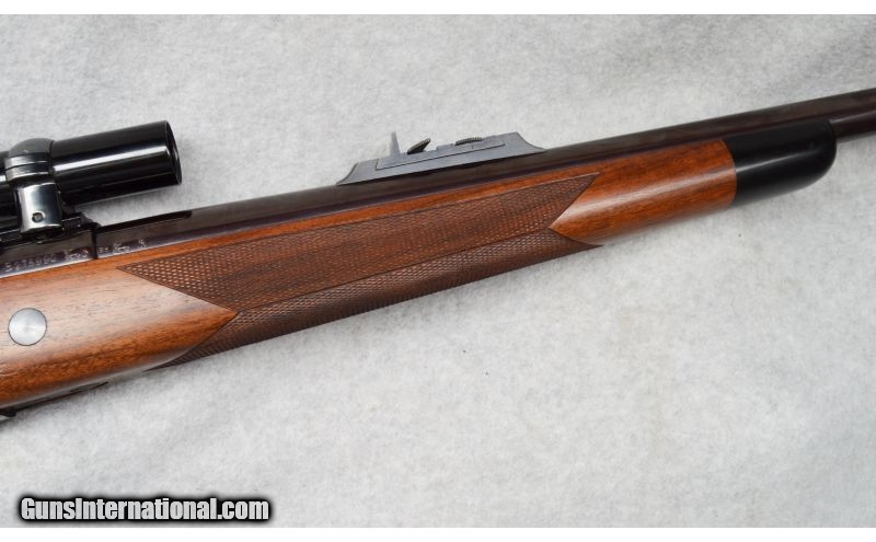 Description: SOLD Caliber Info: .375 H&H Metal Condition: Very good with scratches. Wood Condition: Very good with handling marks. Bore Condition: Shiny with strong rifling. Barrels: 24 Stock: Checkered walnut. Fore End: Checkered walnut. Butt Pad: Whitworth rubber recoil pad. Weight: 9-lbs., 13-ozs. Sights: Redfield 2¾x scope, front bead, 3-position rear blades. Item Location: Fort Worth, TX |