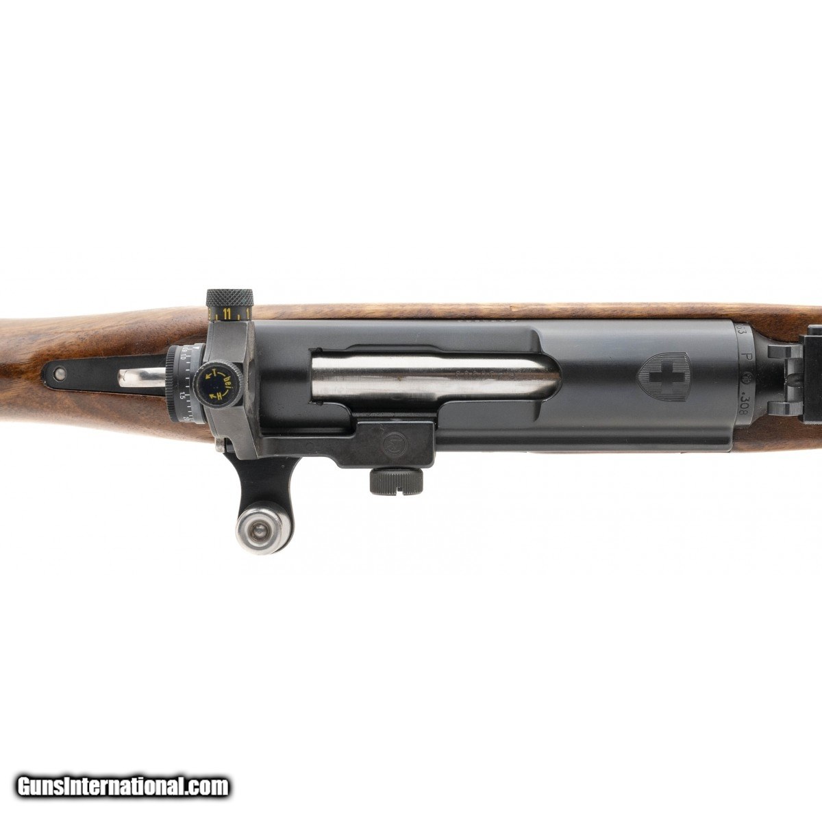SN:P430963. Hard to find .308 caliber! Superb target rifle in excellent condition. Serial numbers are matching. Adjustable rear sight is marked ""Gehmann Karlsruhe Germany"". Bore is excellent. A desirable Swiss target rifle.