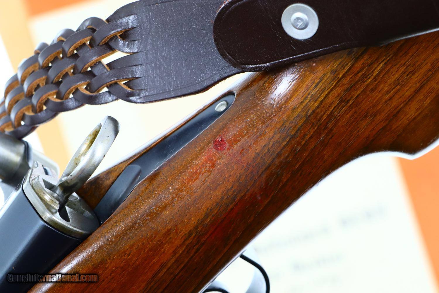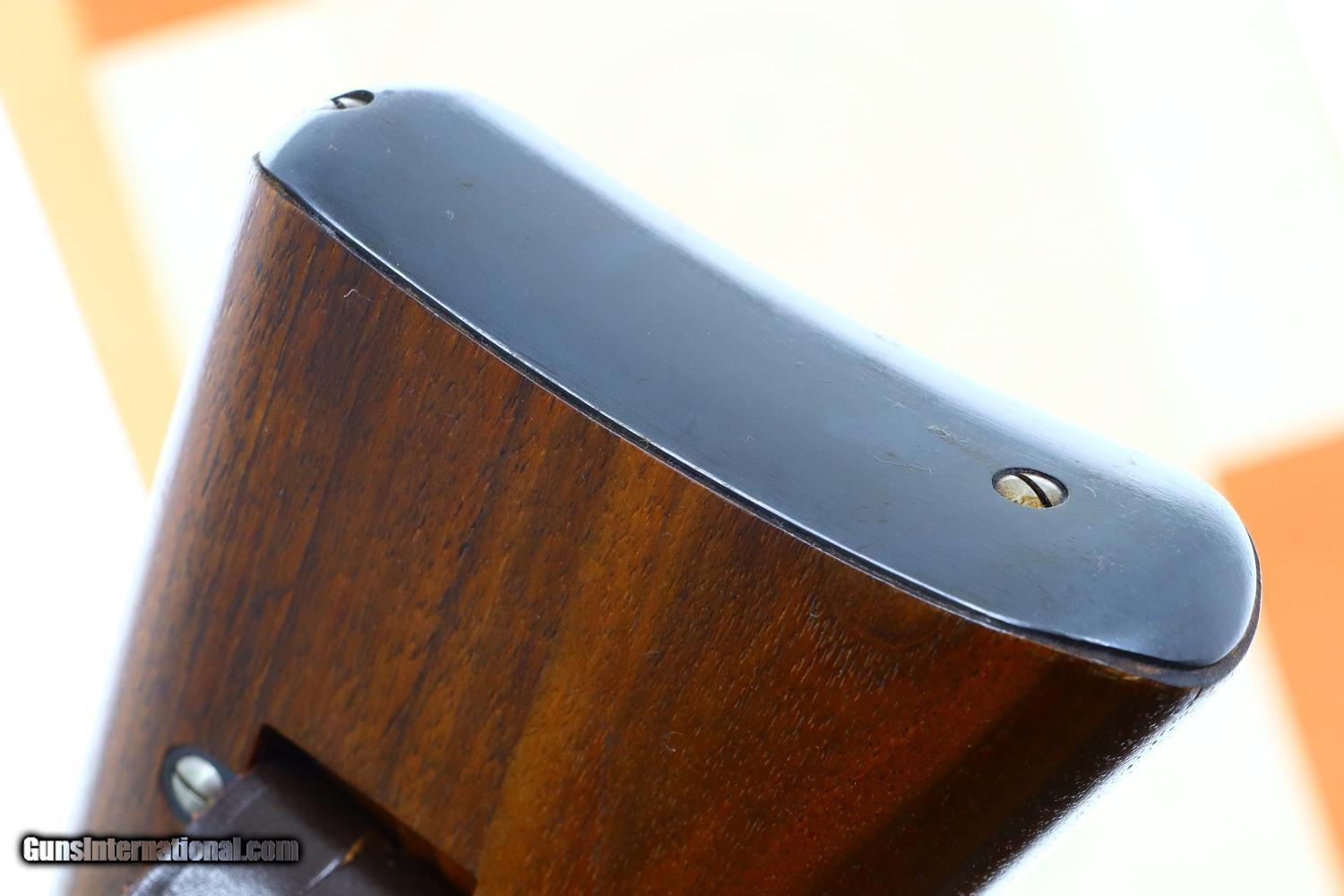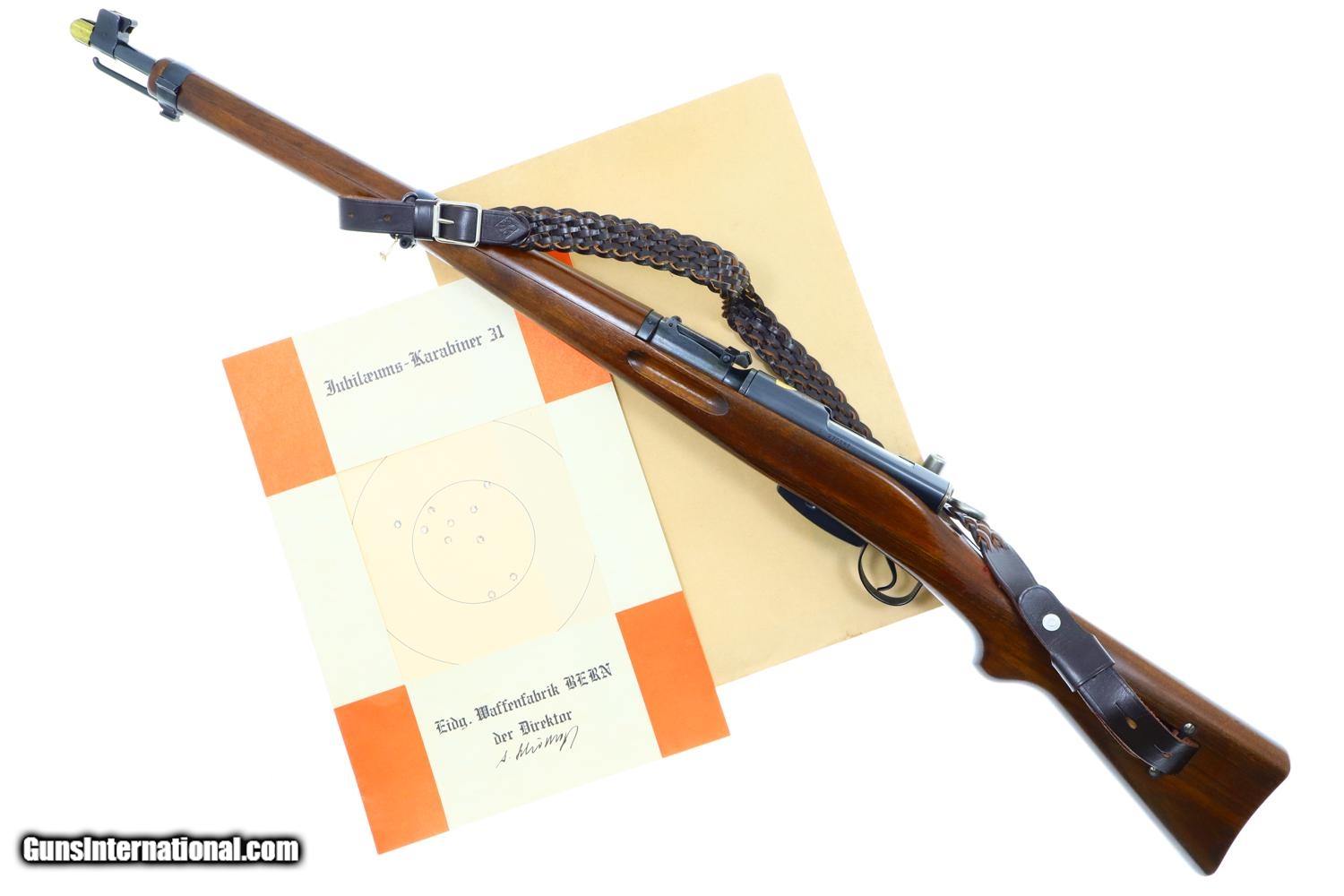 Description: Synopsis: Bern K31, Jubilee, Carbine, 183, P270983, A-1274 Description: This very scarce K31, numbered as a commercial firearm as reflected by the “P” serial number prefix, was one of just 500 pieces made to commemorate 50 years of production, from 1931-1981. Standard configuration straight pull carbine with 1-15 rear sight, matching barrel and magazine. Chamber embellished with gold inlaid “183” along with Swiss Cross in Shield over chamber surmounting “Jubilaums –Karabiner”. Special gold plaque inset into the right side of buttstock referencing 50th year commemorative as made by Waffenfabrik Bern, adjacent military inspection marking. Blued steel and brass muzzle cap with Swiss Cross. Import mark under stacking rod. Complete with factory braided sling and a factory 300 meter test target dated 30 June 1984. Condition: Rifle is near new, still with patches of congealed factory grease. Rare small handling mark on the stock as photographed. Crisp matching numbered factory test target. A fantastic, super impressive K31, that could only be upgraded with a NIB example. SOLD Manufacturer: Bern Model: K31 Serial Number: P270983 Caliber Info: 7.5x55 Condition: Near New |