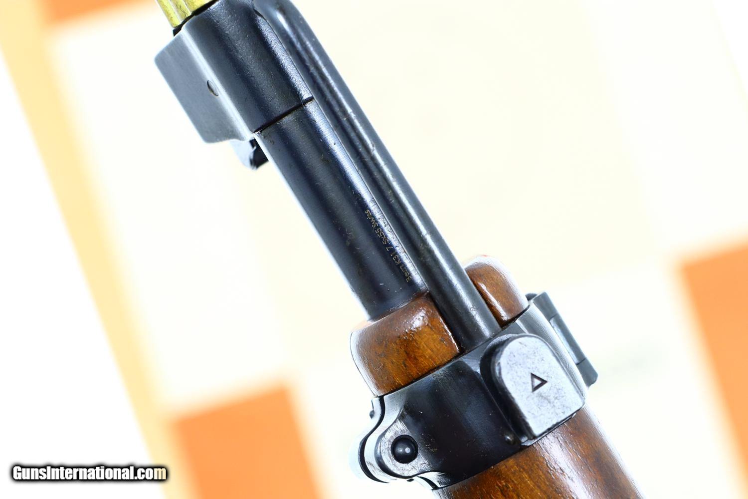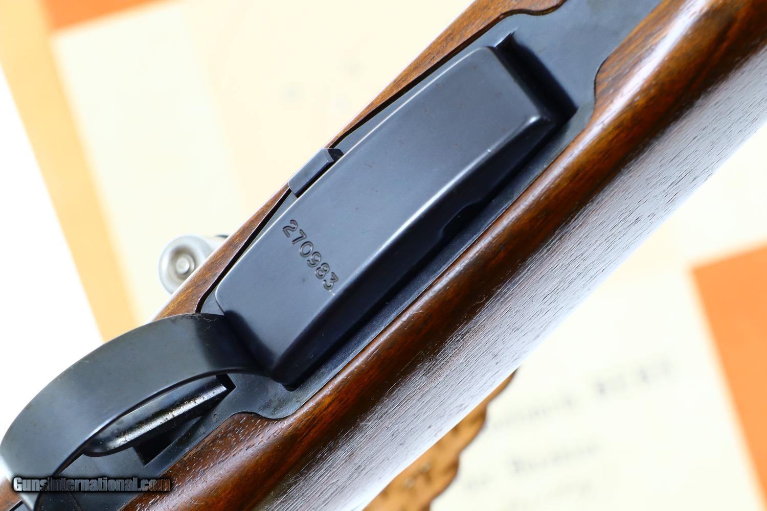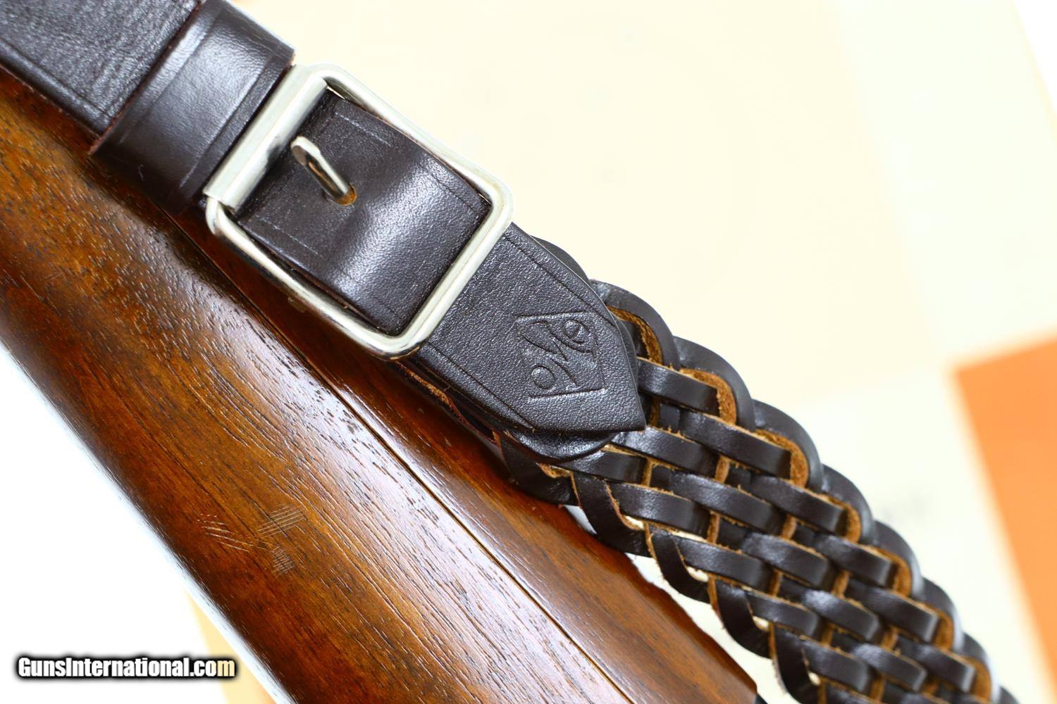 Description: Synopsis: Bern K31, Jubilee, Carbine, 183, P270983, A-1274 Description: This very scarce K31, numbered as a commercial firearm as reflected by the “P” serial number prefix, was one of just 500 pieces made to commemorate 50 years of production, from 1931-1981. Standard configuration straight pull carbine with 1-15 rear sight, matching barrel and magazine. Chamber embellished with gold inlaid “183” along with Swiss Cross in Shield over chamber surmounting “Jubilaums –Karabiner”. Special gold plaque inset into the right side of buttstock referencing 50th year commemorative as made by Waffenfabrik Bern, adjacent military inspection marking. Blued steel and brass muzzle cap with Swiss Cross. Import mark under stacking rod. Complete with factory braided sling and a factory 300 meter test target dated 30 June 1984. Condition: Rifle is near new, still with patches of congealed factory grease. Rare small handling mark on the stock as photographed. Crisp matching numbered factory test target. A fantastic, super impressive K31, that could only be upgraded with a NIB example. SOLD Manufacturer: Bern Model: K31 Serial Number: P270983 Caliber Info: 7.5x55 Condition: Near New |