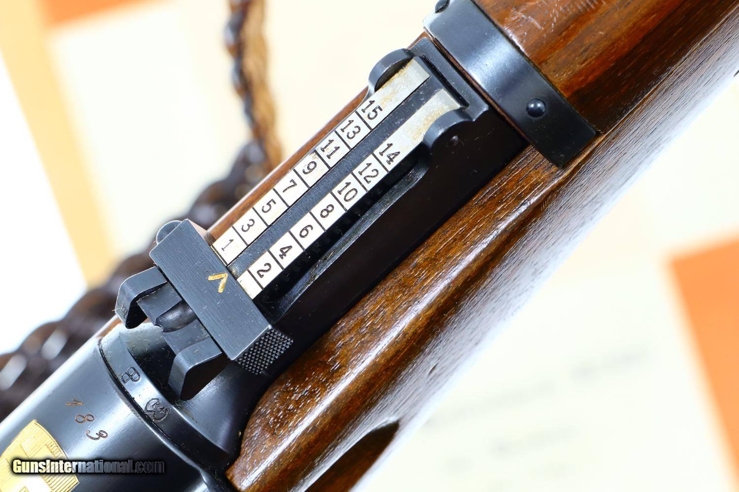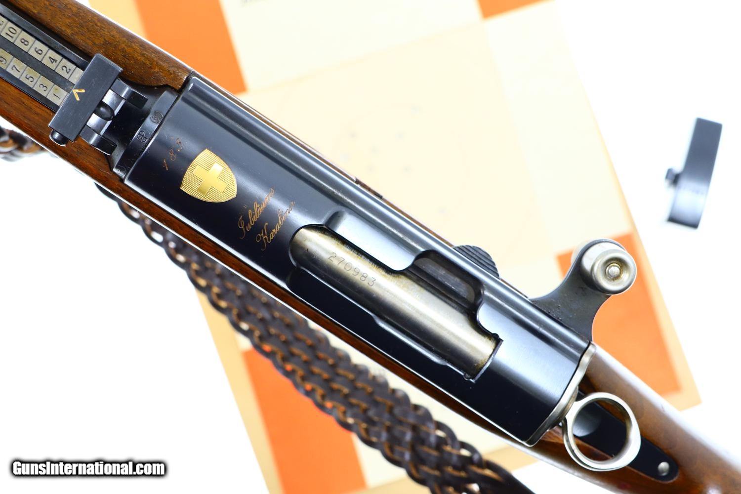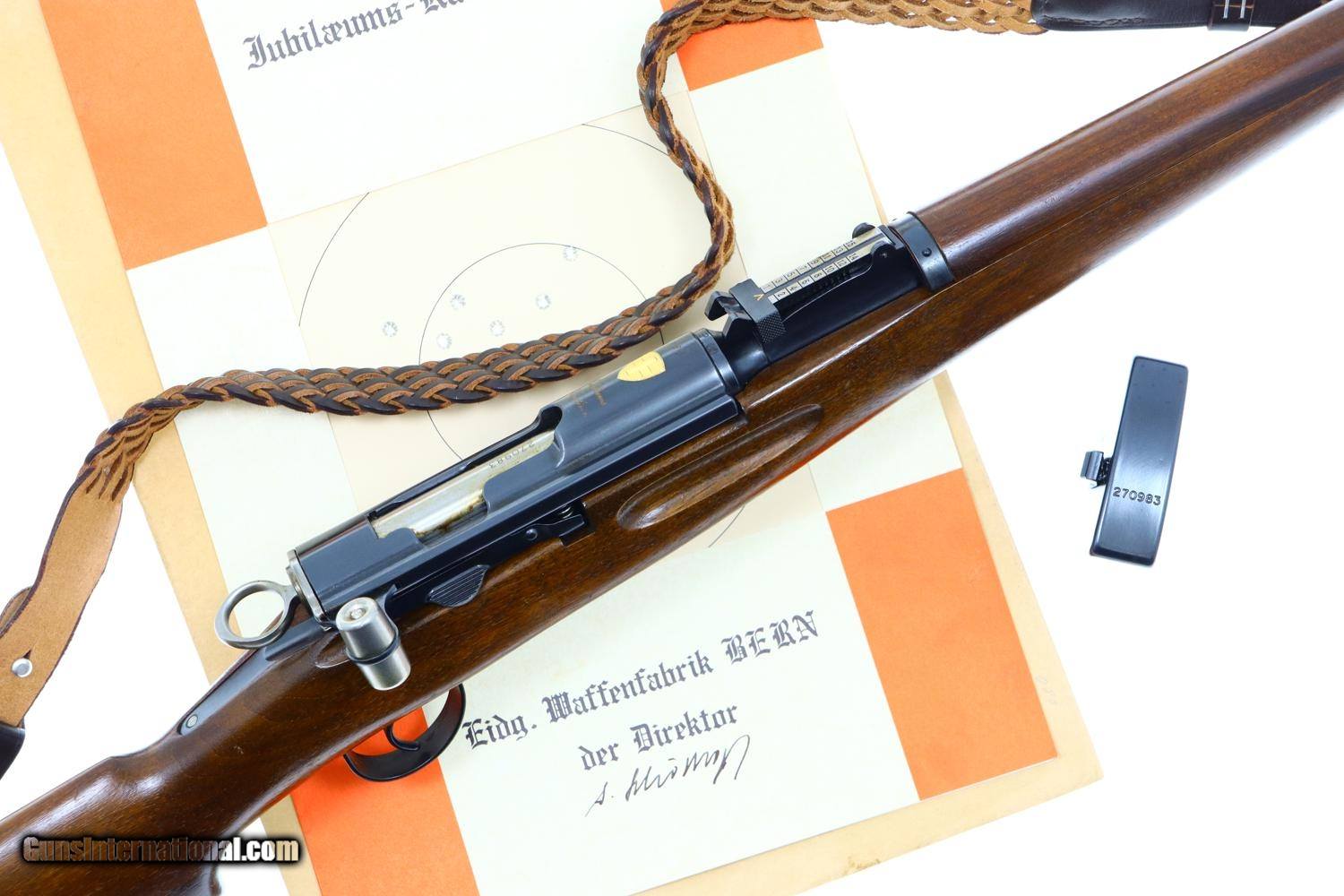 This very scarce K31, numbered as a commercial firearm as reflected by the “P” serial number prefix, was one of just 500 pieces made to commemorate 50 years of production, from 1931-1981. Standard configuration straight pull carbine with 1-15 rear sight, matching barrel and magazine. Chamber embellished with gold inlaid “183” along with Swiss Cross in Shield over chamber surmounting “Jubilaums –Karabiner”. Special gold plaque inset into the right side of buttstock referencing 50th year commemorative as made by Waffenfabrik Bern, adjacent military inspection marking. Blued steel and brass muzzle cap with Swiss Cross. Import mark under stacking rod. Complete with factory braided sling and a factory 300 meter test target dated 30 June 1984.