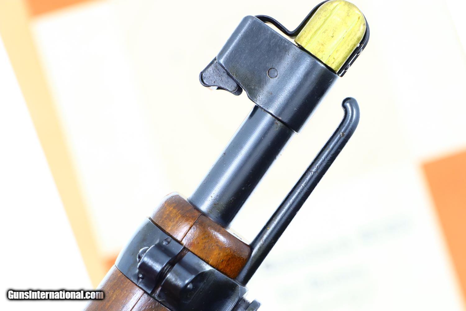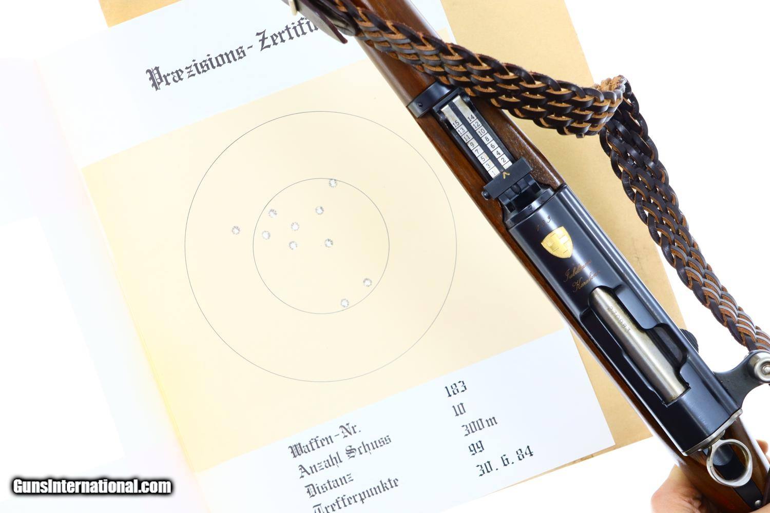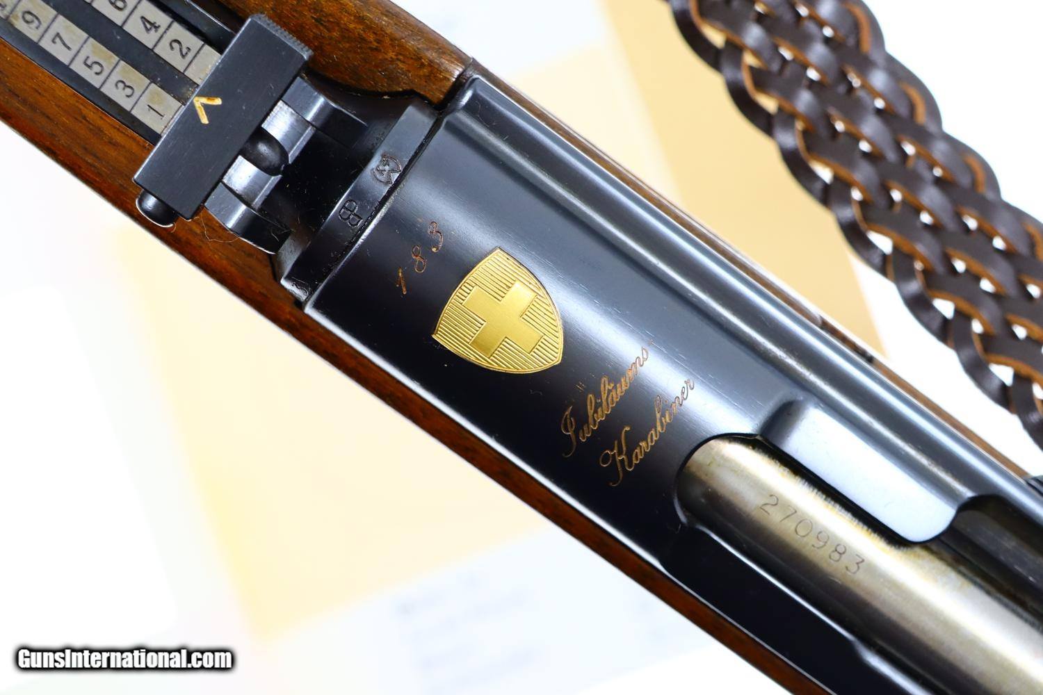 This very scarce K31, numbered as a commercial firearm as reflected by the “P” serial number prefix, was one of just 500 pieces made to commemorate 50 years of production, from 1931-1981. Standard configuration straight pull carbine with 1-15 rear sight, matching barrel and magazine. Chamber embellished with gold inlaid “183” along with Swiss Cross in Shield over chamber surmounting “Jubilaums –Karabiner”. Special gold plaque inset into the right side of buttstock referencing 50th year commemorative as made by Waffenfabrik Bern, adjacent military inspection marking. Blued steel and brass muzzle cap with Swiss Cross. Import mark under stacking rod. Complete with factory braided sling and a factory 300 meter test target dated 30 June 1984.