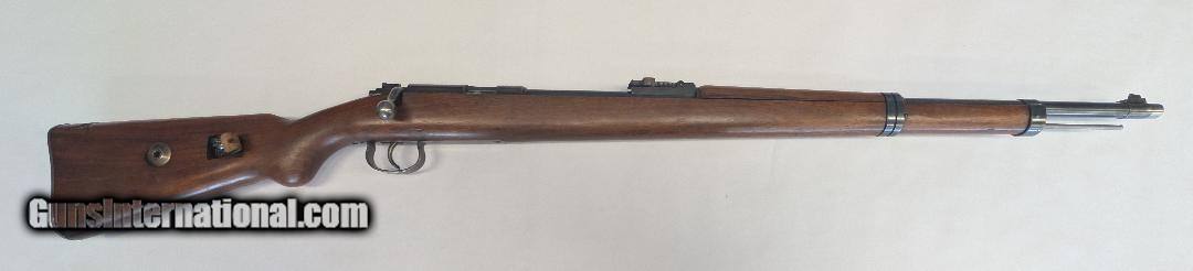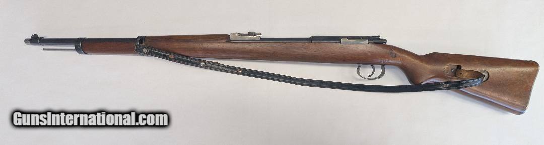 Description: Guns Listing ID: 619960 Geco single shot bolt action rifle 22lr K98 trainer Deutches Sportmodell, caliber 5.4mm (.22 LR), s/n 1402, simulates military Mauser 98 model, receiver based somewhat on scaled down Mauser 98, crest on top front of receiver has maker‚s name, 3/4 length stock with one barrel band, fake ramrod extension protruding from forearm, 26\" barrel, EXCELLENT BORE, integral swivel mounts similar to Mauser 98, blue is Excellent except thinning on top of barrel underneath where a military style rear sight was located, wood is Excellent, silky smooth action and fantastic trigger, missing safety lever, some minor chipping in the stock. Manufacturer: GECO Model: DUETCHES SPORTMODELL Caliber Info: .22 LR Condition: Used - Non-Certified Barrels: 26" BARREL Action: BOLT ACTION Finish: black /w wood stock Price: $1,000.99 Contact Seller |